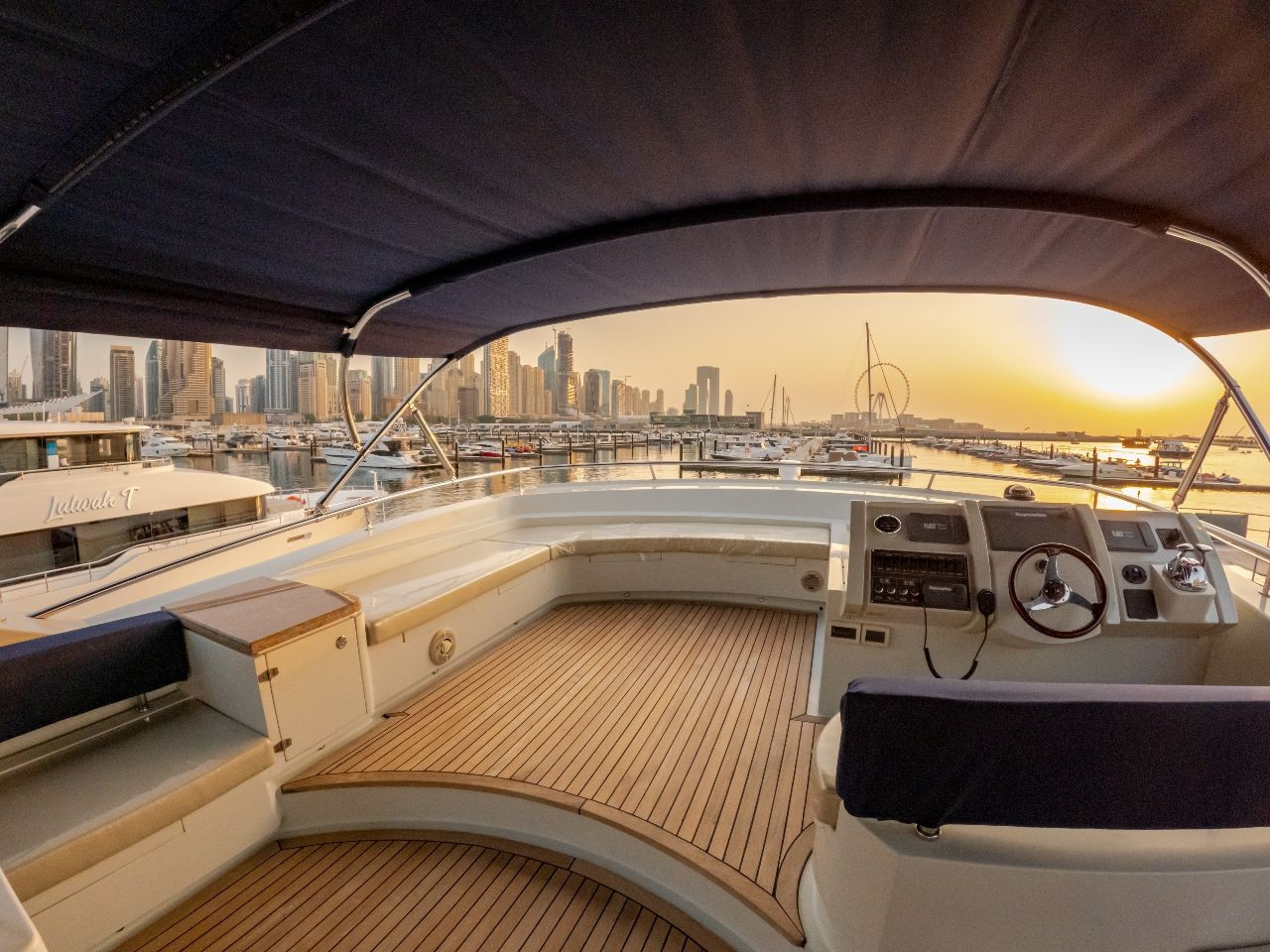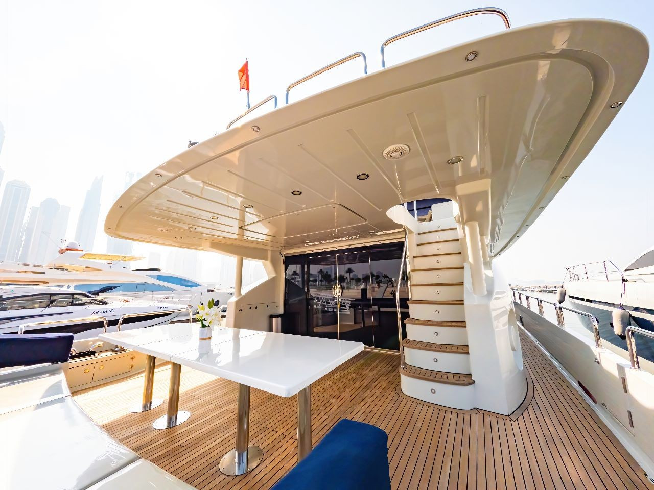The sun deck offers seating and dining under a soft bimini shade, plus sun pads and a circular jacuzzi. On the main deck aft there is another dining area with an adjustable table and bench sofa seating and steps down to the swim platform.