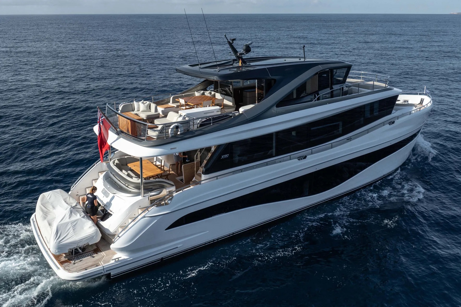 Motor yacht KORA (ex. Rubio) is a 2023 built Princess X80 with an overall length of 25.18m (82' 7") and five suites for up to ten guests. The unique layout of this model places one of the guest cabins forward on the main deck and there is both a sky lounge and main salon, creating plenty of guest space. Three crew members are on board throughout charters to look after the guests.