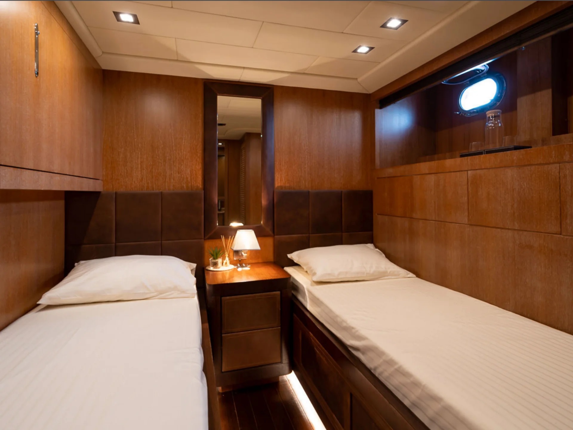 The use of rich wood and leather finishes continues in the four suites which are configured as 3 doubles and 1 twin with additional pullman bunk. All the cabins benefit from the luxury and privacy of stylish ensuite bathroom facilities.