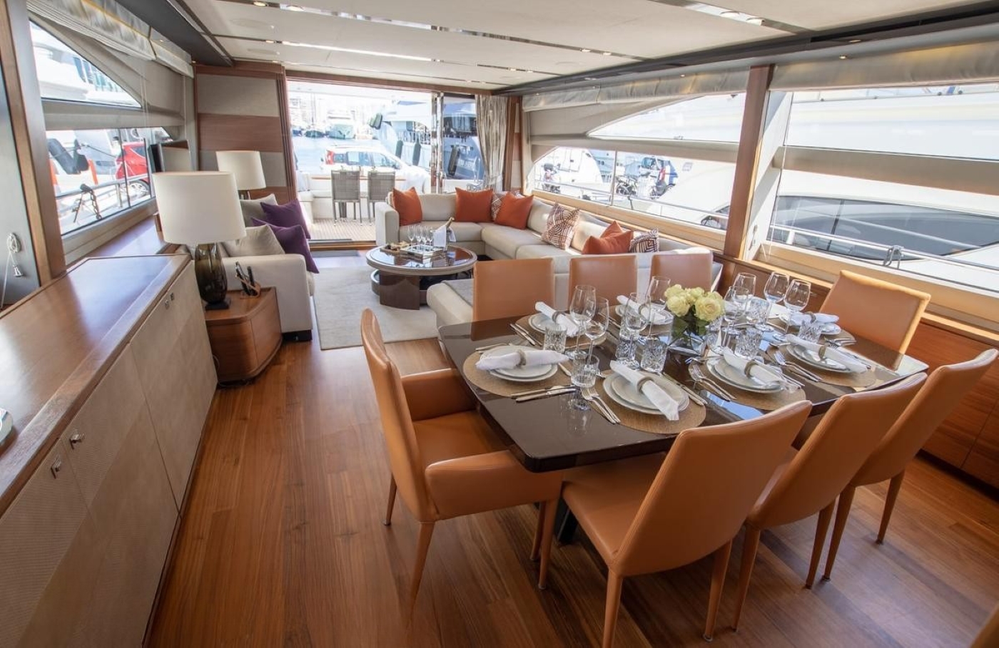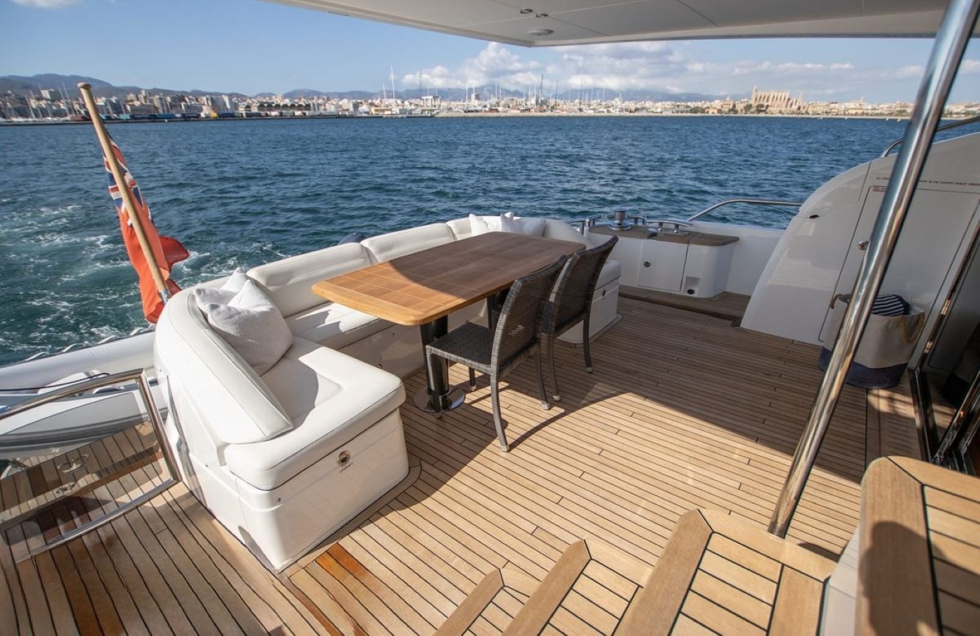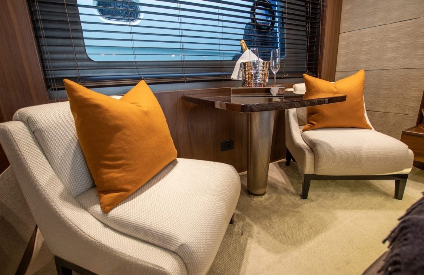 She creates a relaxing environment on the decks with an intimate al fresco dining setting along with sun pads and a group of sun loungers from where guests can make the most of the sea views.