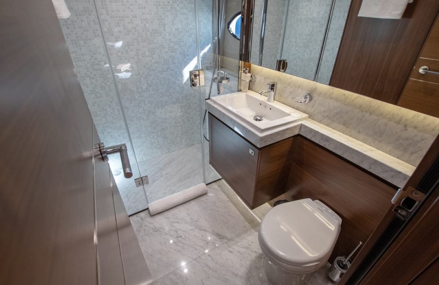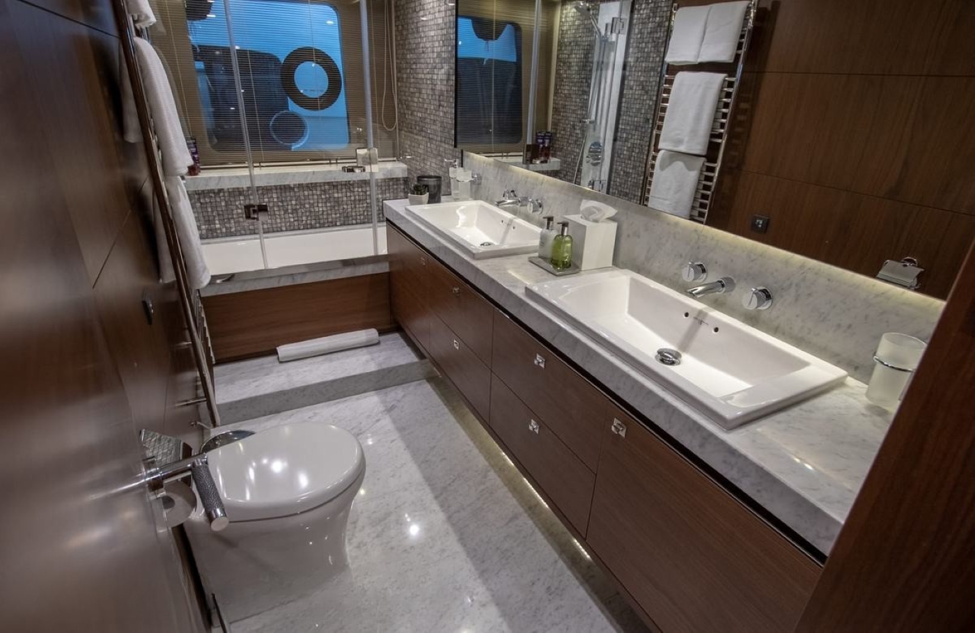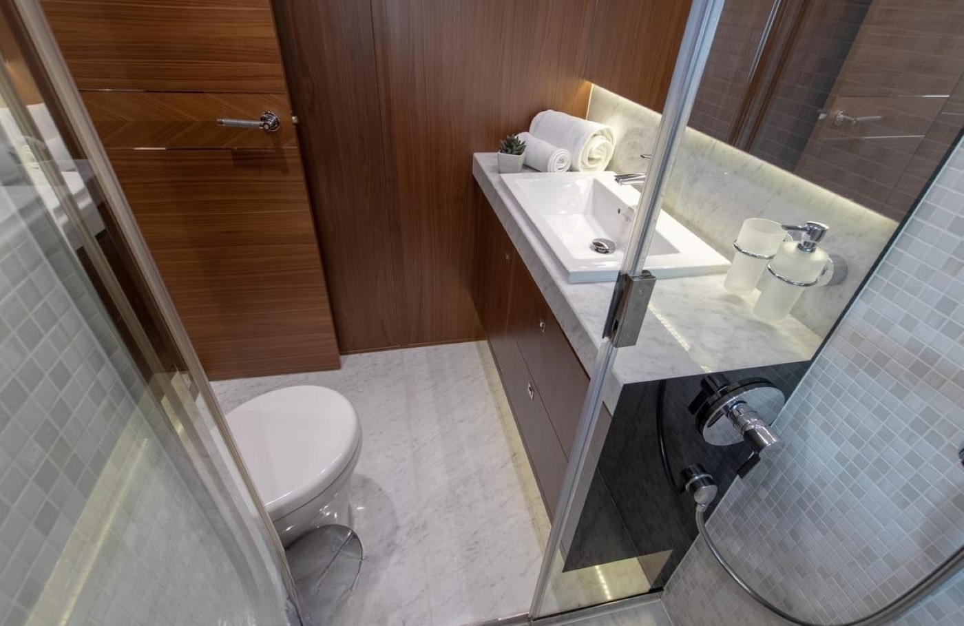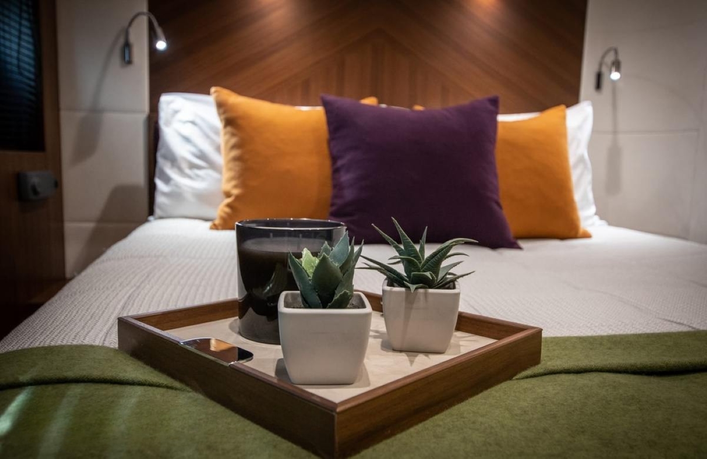 Guests will experience the ultimate in comfort across four cabins (three double and one twin). The full beam master suite features a generous suite with marble-finished ensuite with twin sinks and roomy well-lit bath and shower area. The other cabins meanwhile feature integrated furniture to make excellent use of each individual space and ensuite bathrooms. 1 full beam master stateroom with ensuite 1 forward VIP with ensuite 1 double cabin with enquite 1 twin cabin with ensuite