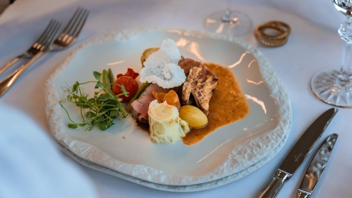 The starboard staircase leads to the upper deck to the grand alfresco dining area to seat 12 beneath the sundeck overhang. Sofas are placed along the stern for unwinding in the views and the sunshine after a three-course meal. Side passageways lead around to the foredeck, furnished with a forward-facing C-shaped sofa, an elevated table and two corner sofas with drinks tables.