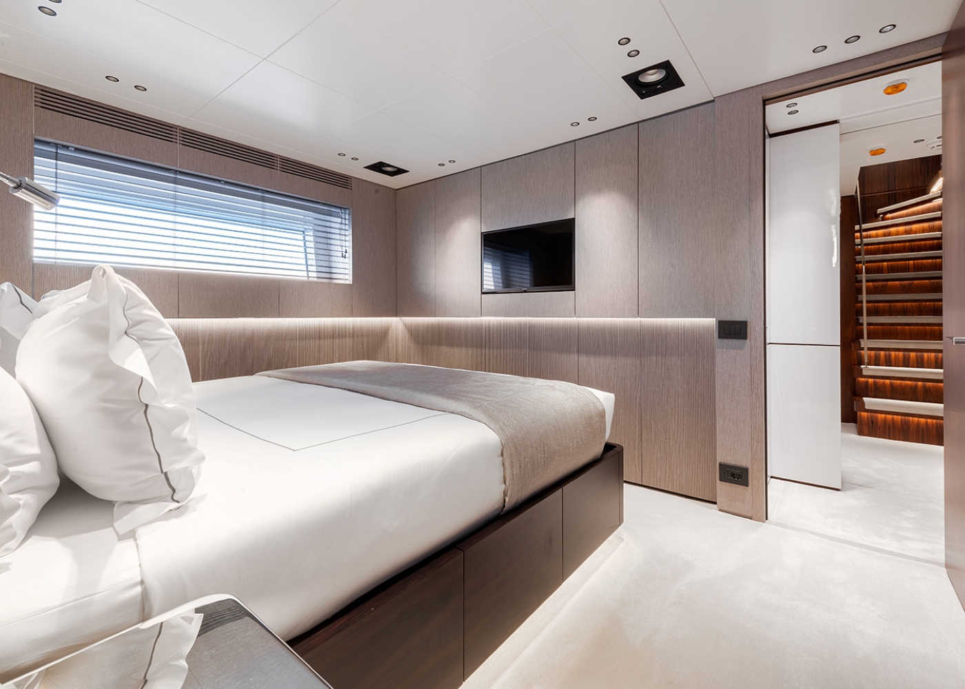 The accommodation sleeps a total of 12 guests across 5 en-suite cabins: 1 Master suite, 2 VIP staterooms and 2 double cabins convertible to twins that both have a Pullman berth. The Master suite is placed on the main deck forward and has a king-sized bed and widescreen TV to port and a desk, armchair and side table beneath the large starboard window. The forward dressing room leads through to the his-and-hers en-suite bathroom, both of which has a sink, toilet and shower. ~ The VIP staterooms are amidships to port and starboard on the lower deck. Both have a queen-sized bed, widescreen TV, desk/vanity, ample wardrobe space and an aft en-suite bathroom with a sink, toilet and shower. The double cabins convertible to twins are forward of the VIP staterooms on the lower deck, and both cabins have two single beds that can be placed together, a Pullman berth, widescreen TV, wardrobe and an en-suite bathroom with a sink, toilet and shower. ~ The expert crew of 8 will ensure that all guests receive first-class service throughout their stay.