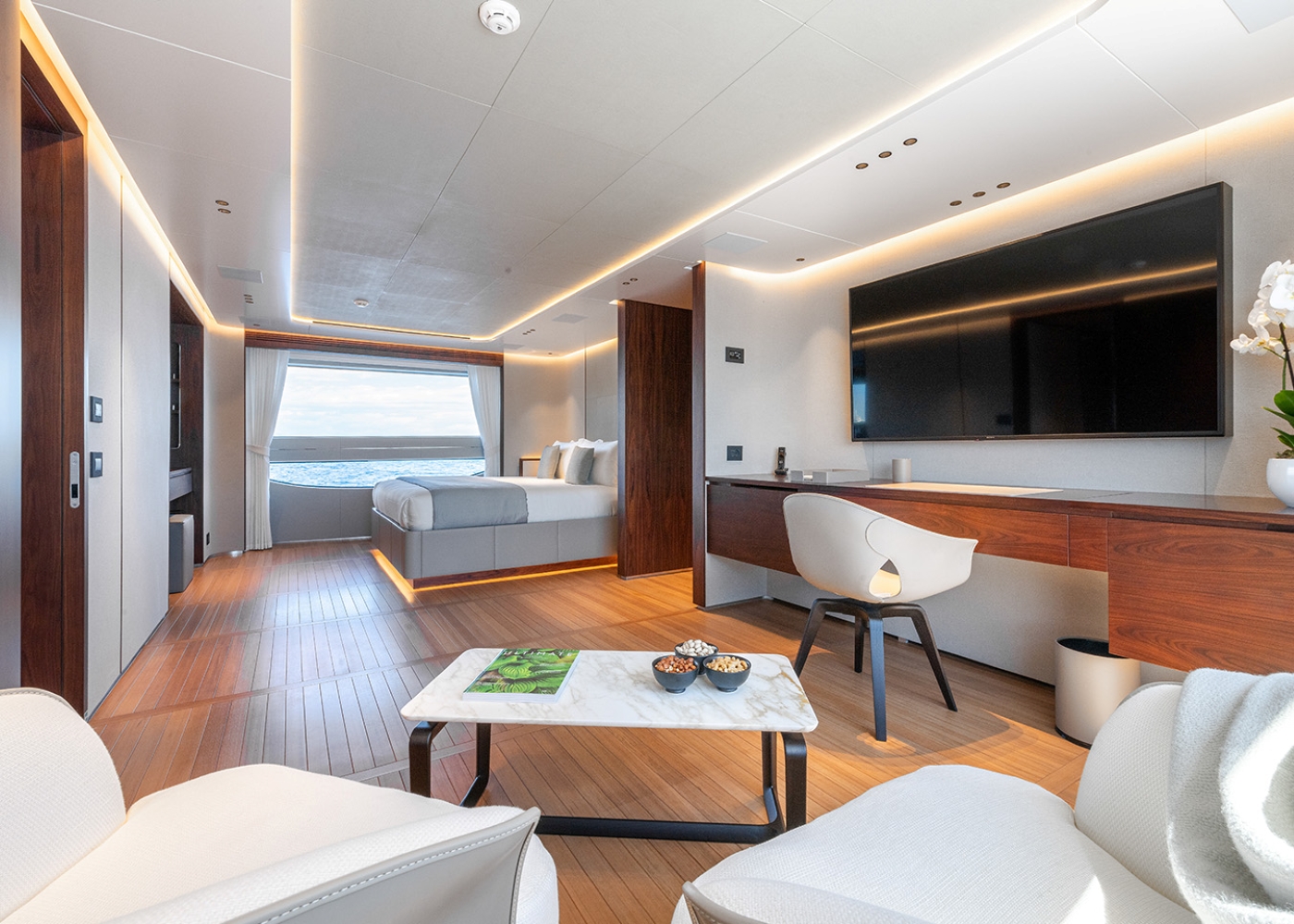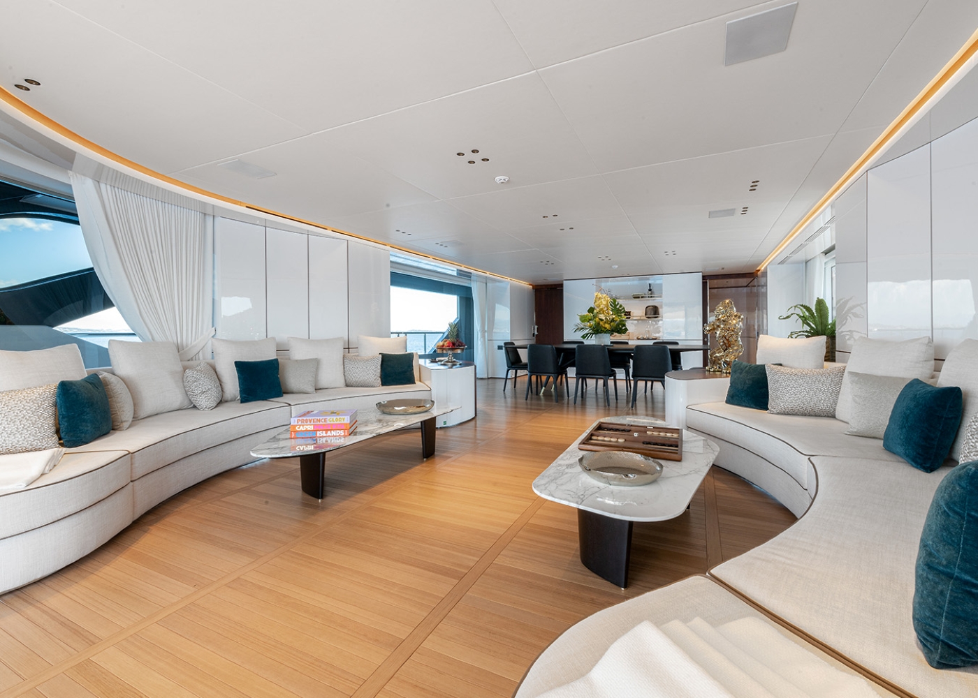 The formal dining area consists of a large rectangular table that seats all 12 guests, where plenty of natural light floods inside through the nearly full-height windows on both sides of the room. The salon is a symmetrical setting with a curving sofa and coffee table on both sides close to the glass sliding doors out onto the main deck aft.