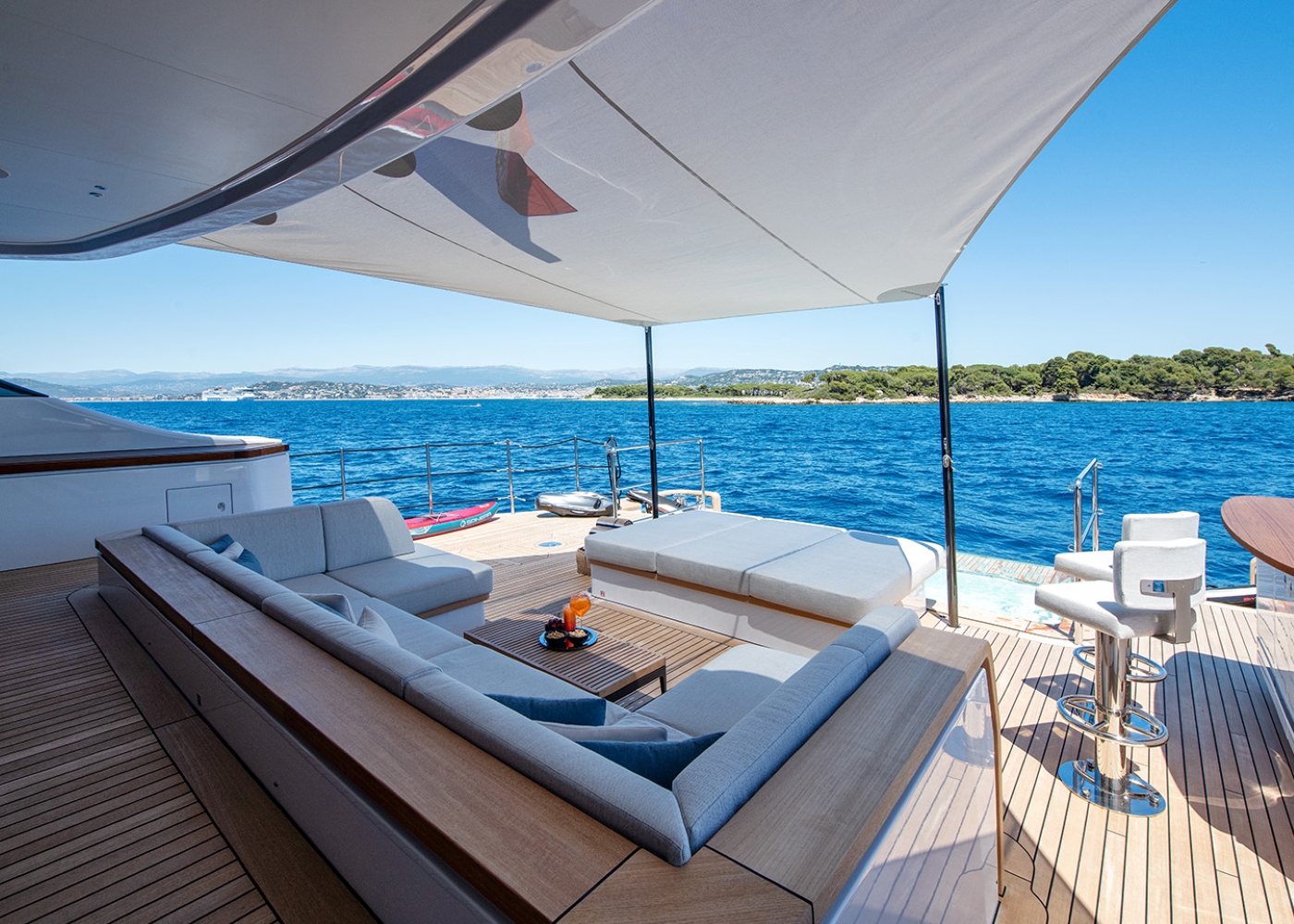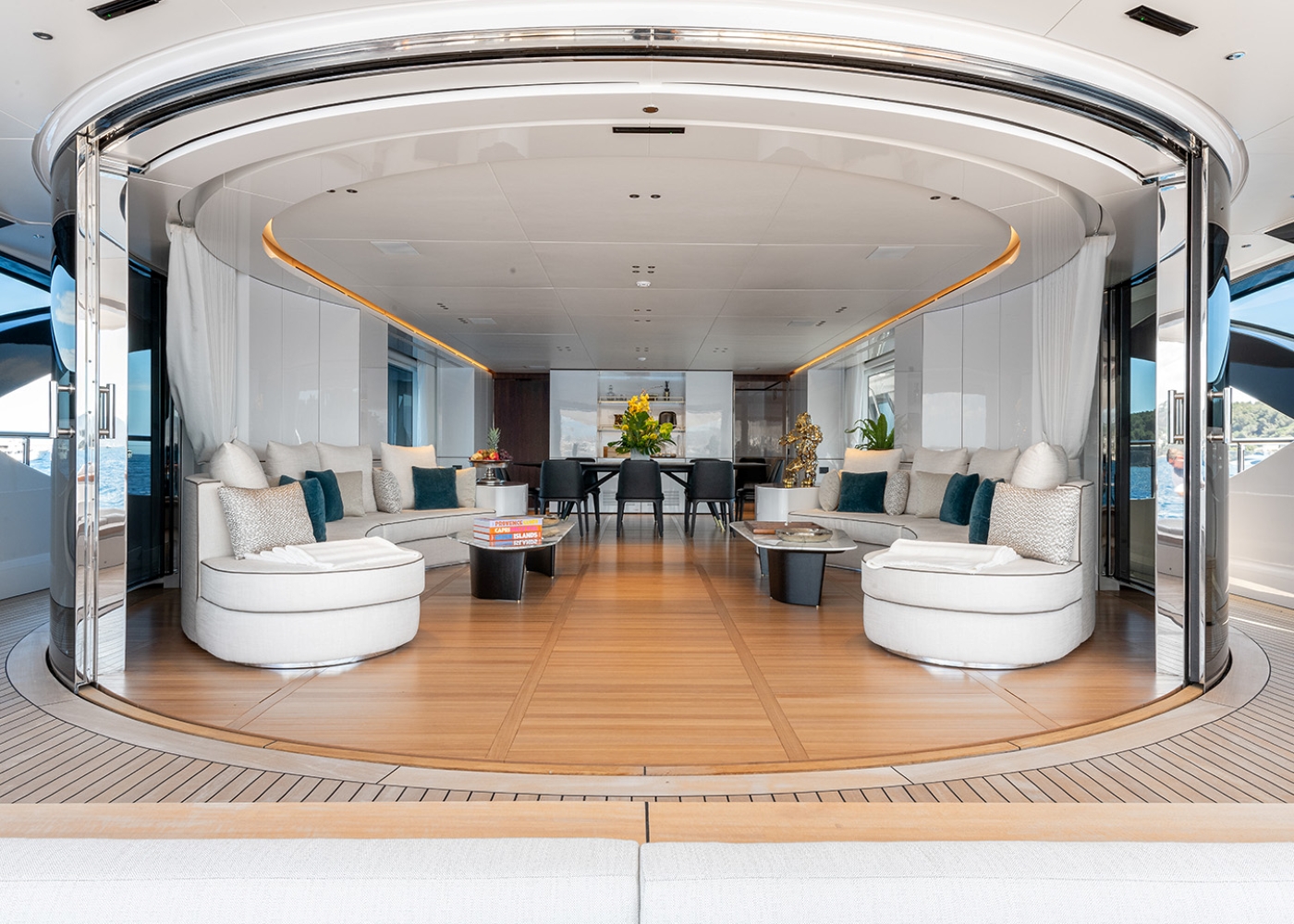 The main deck aft provides a C-shaped sofa and coffee table close to the main salon, with the beach club providing a sunbed and a large infinity Jacuzzi pool along the stern. The swim platform provides an additional sunbathing and lounging space close to the water, and a stairway leads down to the sea for easy access to the tender and water toys.
