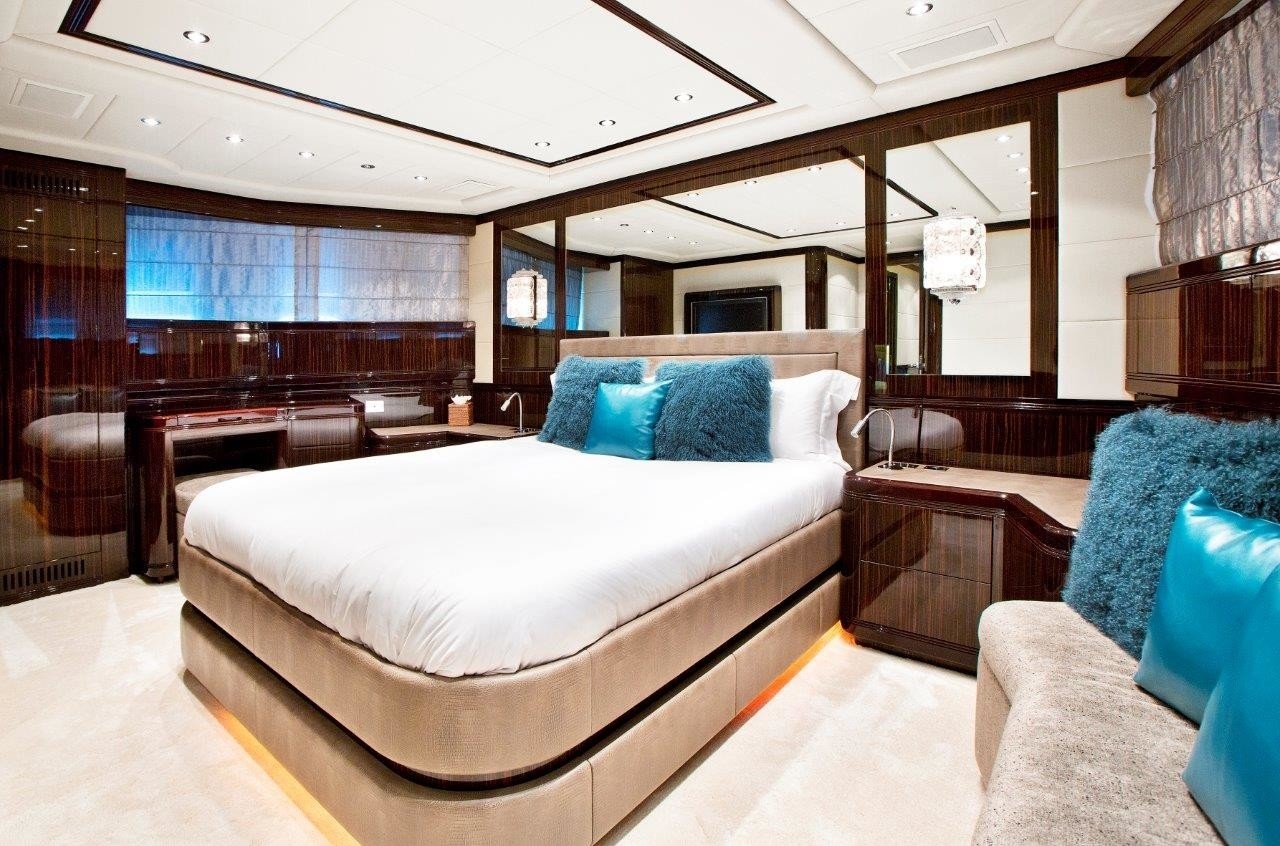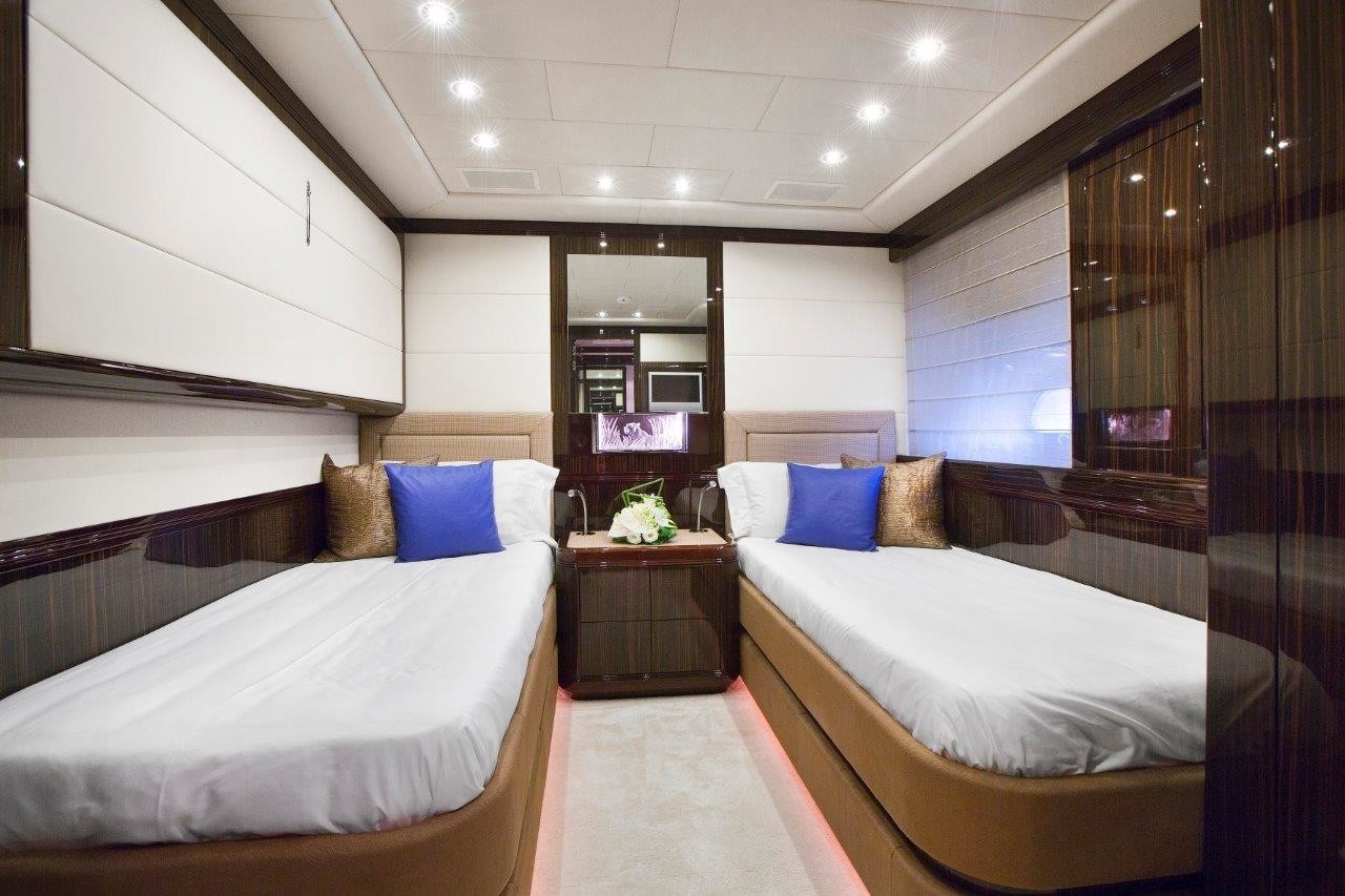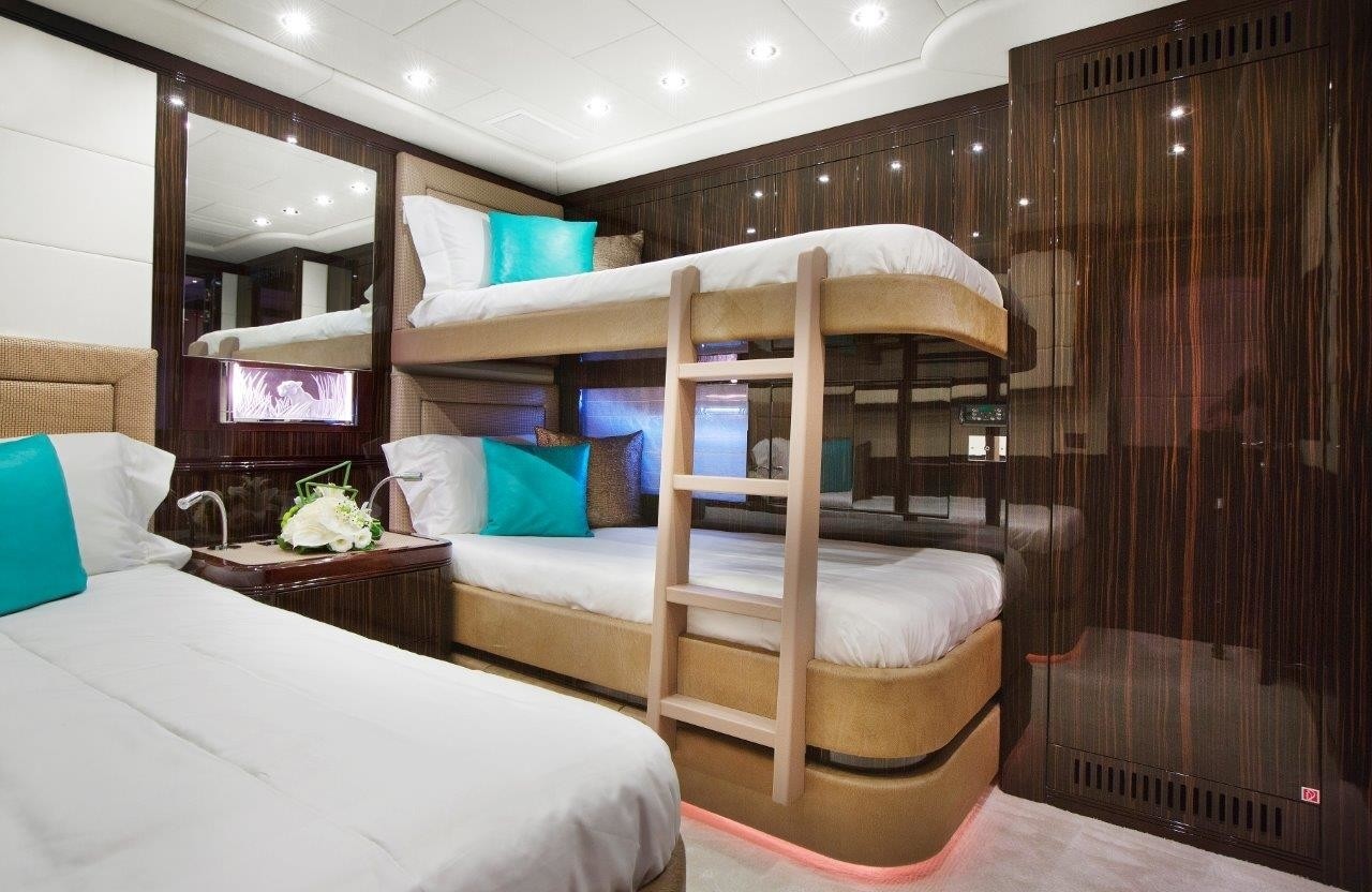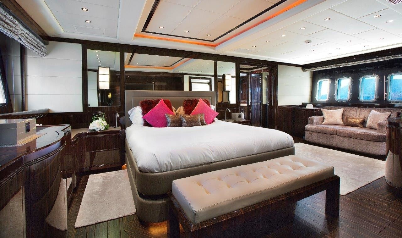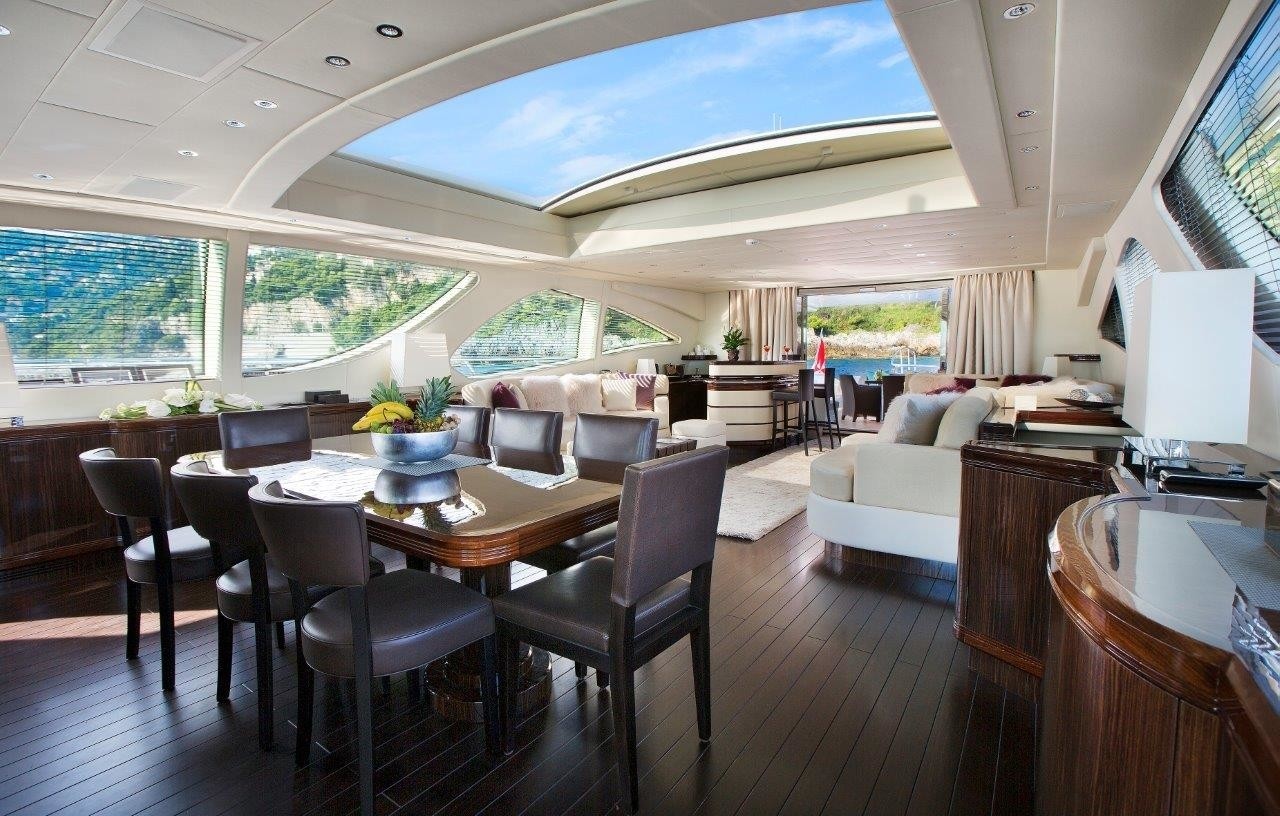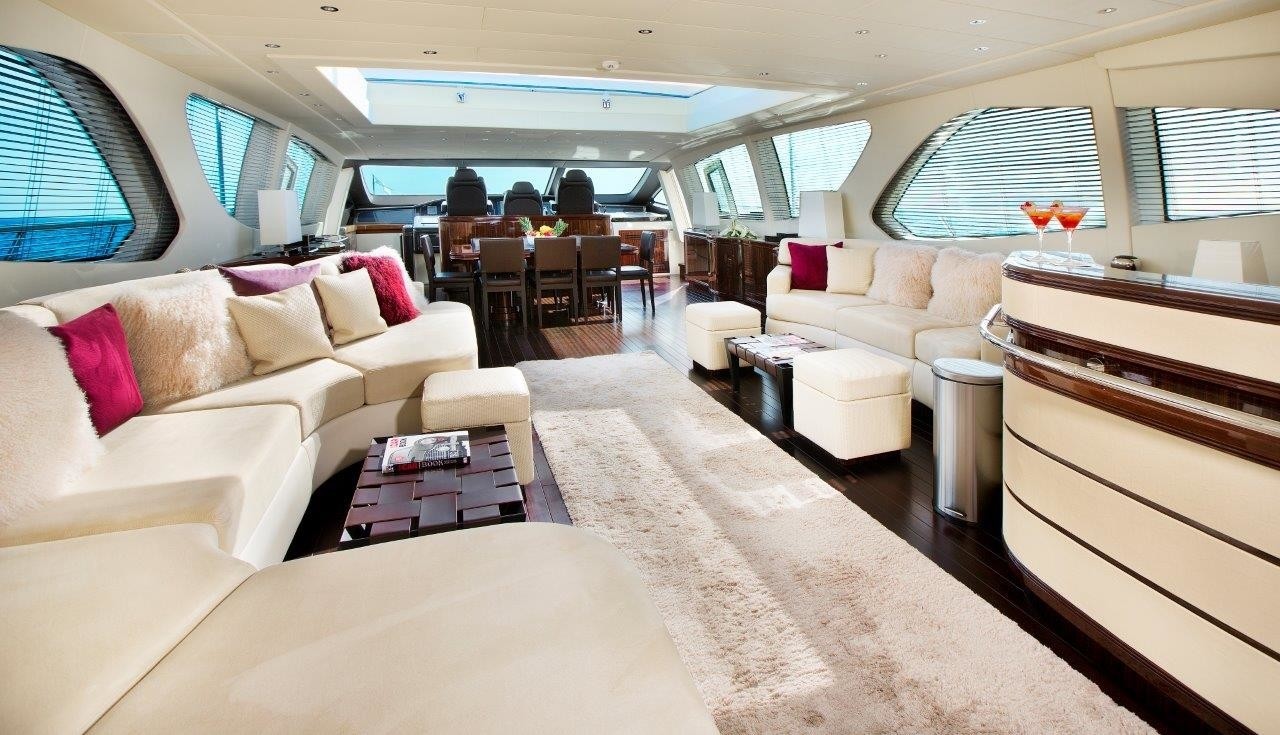 The interior décor aboard the motor yacht MAC TOO is elegant and bespoke. Custom wood floors, plush soft furnishings and intricate detailing create an inviting ambiance throughout. The salon and dining is a contemporary open plan, featuring 2 large sofas, ottomans, coffee table and deluxe wet bar aft, with the formal dining table forward. An overhead retractable roof provides a unique indoor dining experience under the stars, while elongated side windows ensure optimum light and panoramic views by day. Guest accommodation is below decks in 4 cabins, each with private en-suite facilities and full entertainment systems. In addition to the guest accommodation, a 5th room offers a relaxing sofa with table and study desk, perfect for a kids playroom, or as an office space.
