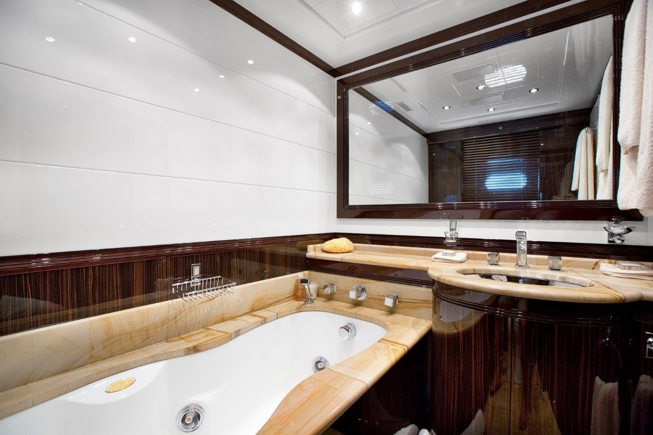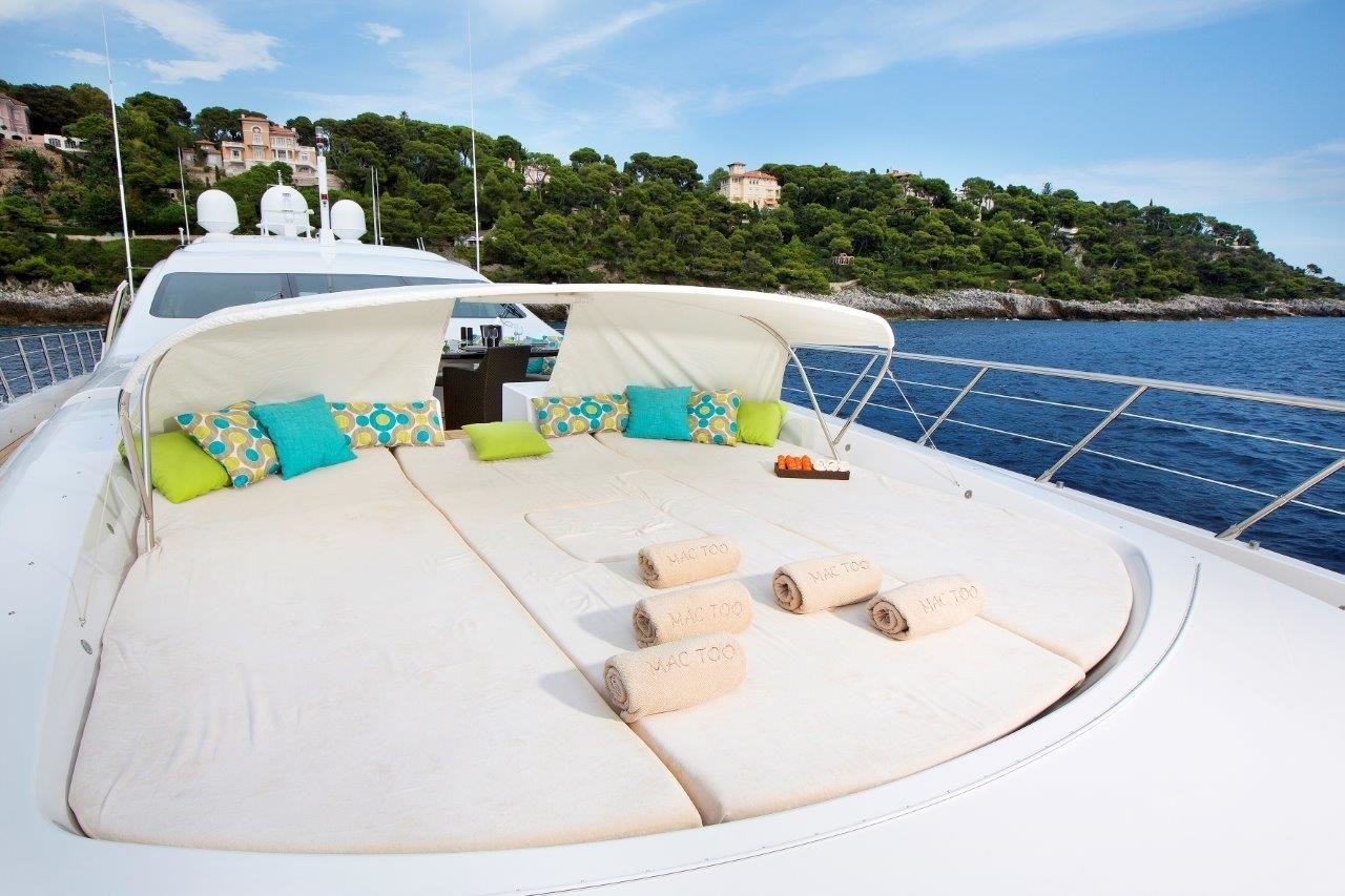 The Mangusta yacht MAC TOO has ample exterior living areas to enjoy and soak up the warm Mediterranean sun rays. The aft deck boasts an alfresco dining option, 2 double sunpads and partial shade, followed by port and starboard steps, leading to the extended swim platform. 360° wrap around teak decks give access to the massive foredeck, where a further alfresco dining option and oversized sunpad await. Above the main deck, a triple sunpad is the perfect escape for a little private time.