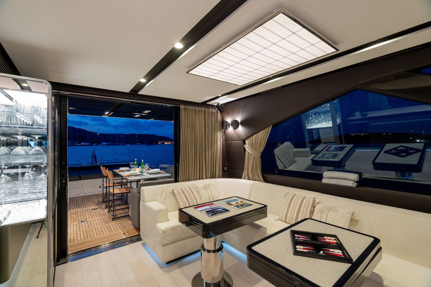 Sliding doors from the interior give the main deck a harmonious indoor outdoor flow and the aft deck offers a corner sofa with flexible dining table and low of deep sun pads overlooking the stern. From here steps lead down to the swim platform from where guests have access to the ocean and water toys.
