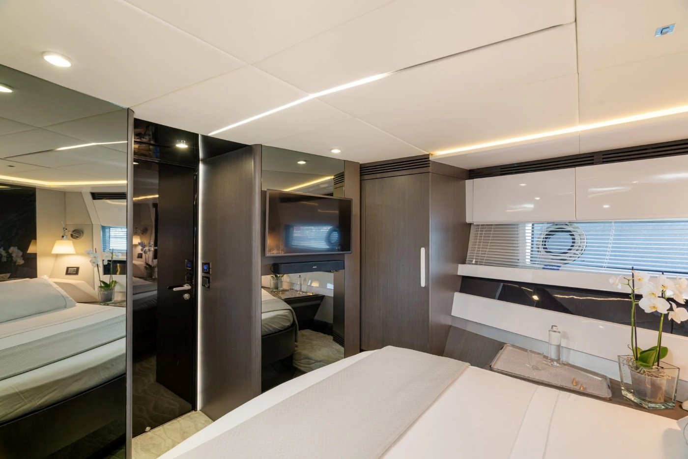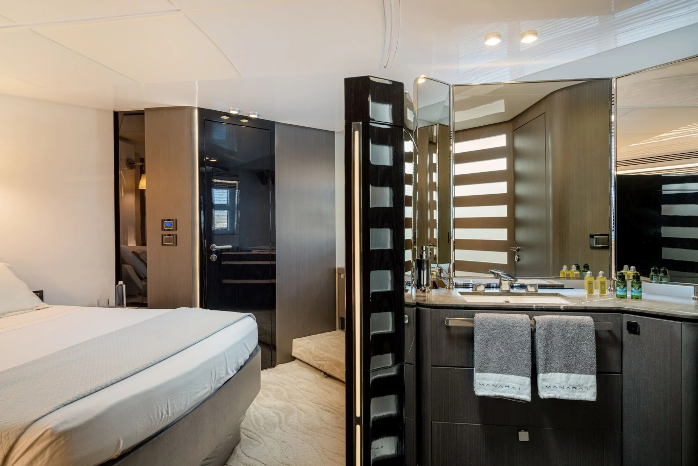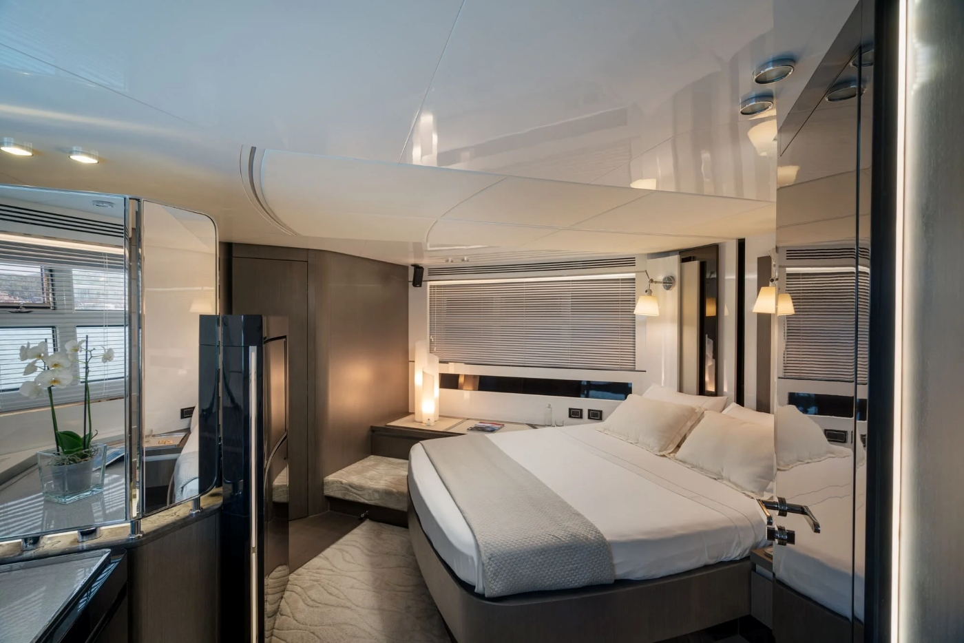 The ample owner's suite is more luxury hotel than boat cabin, with its angled bed, large windows, ample seating and storage areas, and mirrored, marble-topped vanity unit concealed behind a curved partition (which also stores the television). Aft of this, one door leads to the head and shower compartment, and another to a walk-in wardrobe. There is also a two twin cabin, going forward, and in the bow another double cabin, with its own ensuite head and shower. (The two twin cabins share the day head and shower on the port side.) Throughout the accommodation the finishes are textural, tonal and super-luxe, with pale flooring, chocolatey timber and dark, reflective finishes and mirrors.