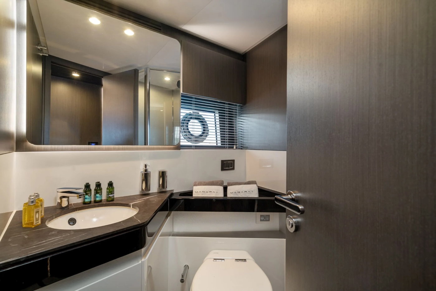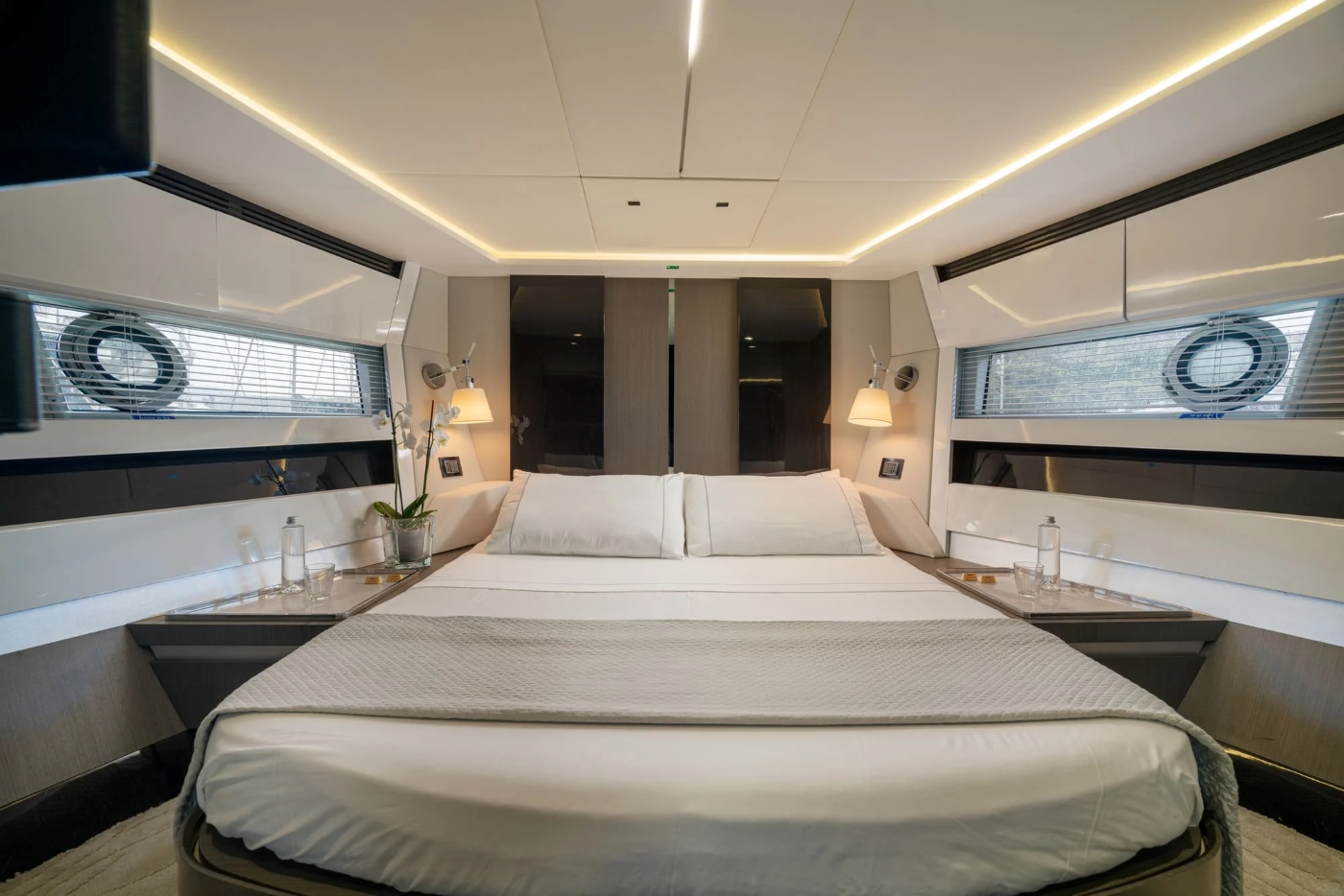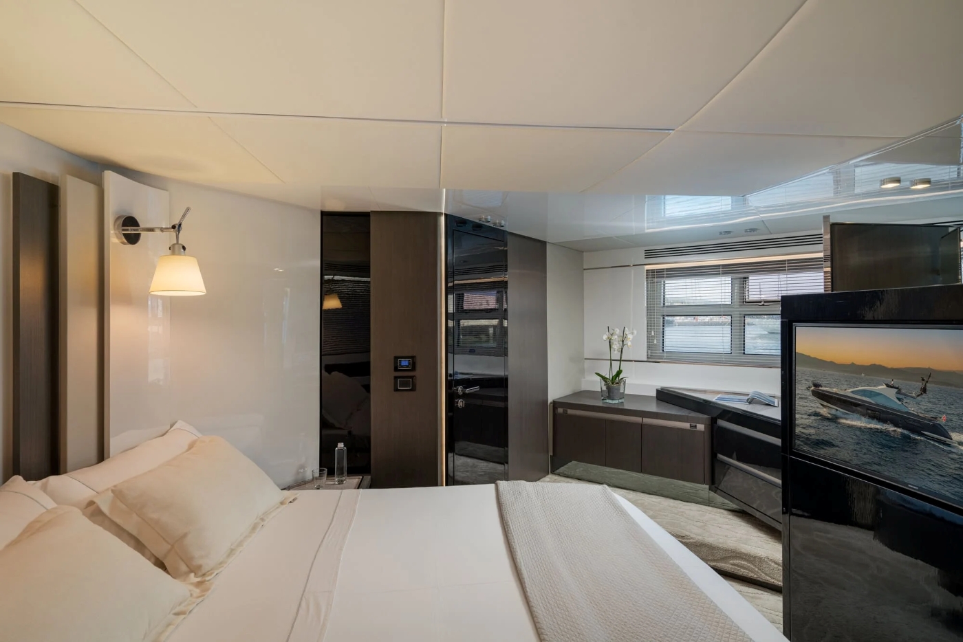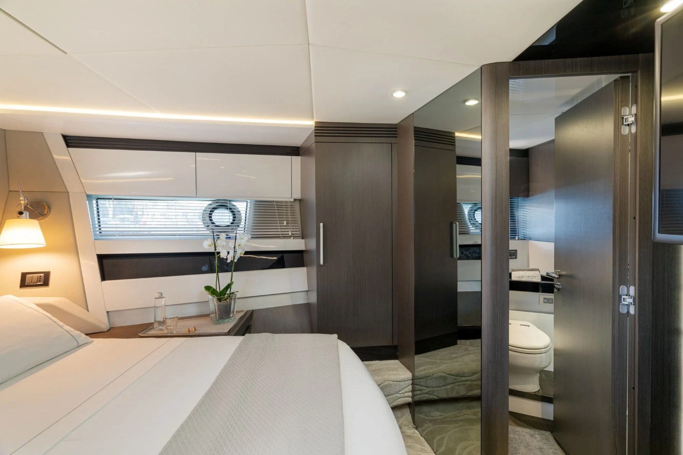 The ample owner's suite is more luxury hotel than boat cabin, with its angled bed, large windows, ample seating and storage areas, and mirrored, marble-topped vanity unit concealed behind a curved partition (which also stores the television). Aft of this, one door leads to the head and shower compartment, and another to a walk-in wardrobe. There is also a two twin cabin, going forward, and in the bow another double cabin, with its own ensuite head and shower. (The two twin cabins share the day head and shower on the port side.) Throughout the accommodation the finishes are textural, tonal and super-luxe, with pale flooring, chocolatey timber and dark, reflective finishes and mirrors.