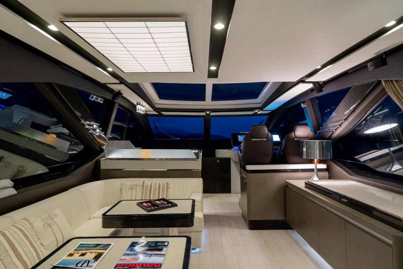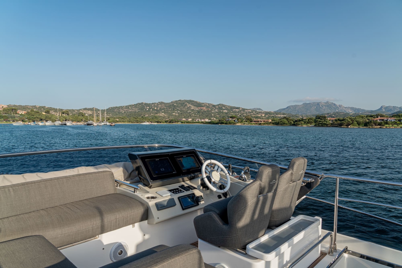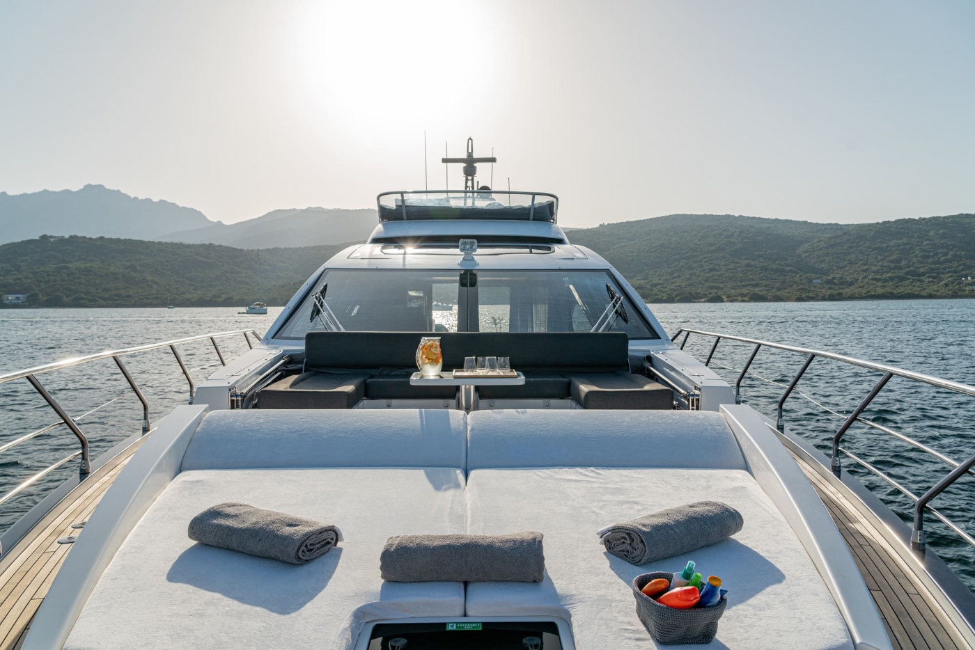The long bow creates a beautiful foredeck which boasts an expanse of adjustable sun pads and a generous u-shaped sofa around a table. The open sun deck is a perfect sun trap with a huge L-shaped sofa around a table, plus forward helm station with adjacent sun pads.