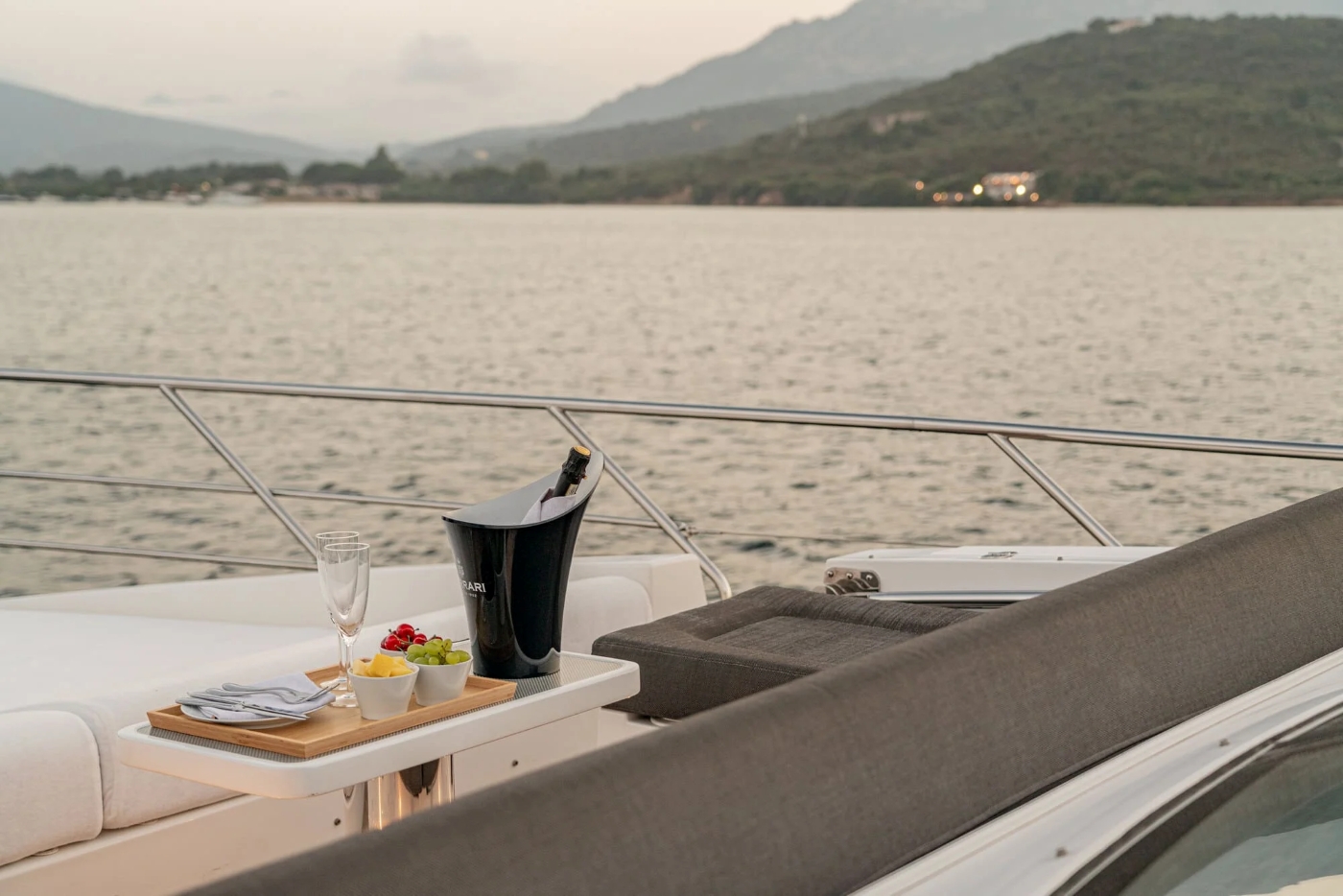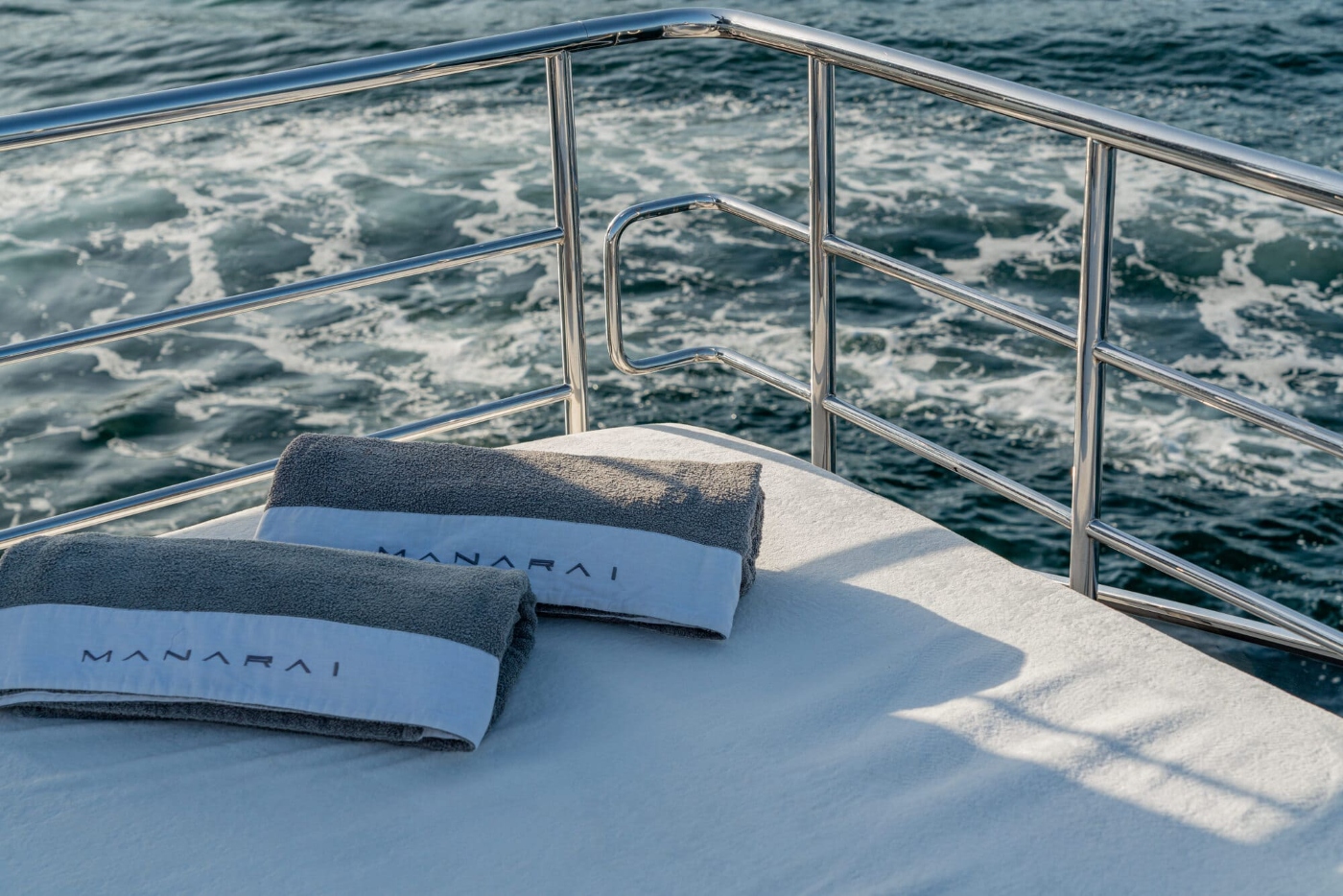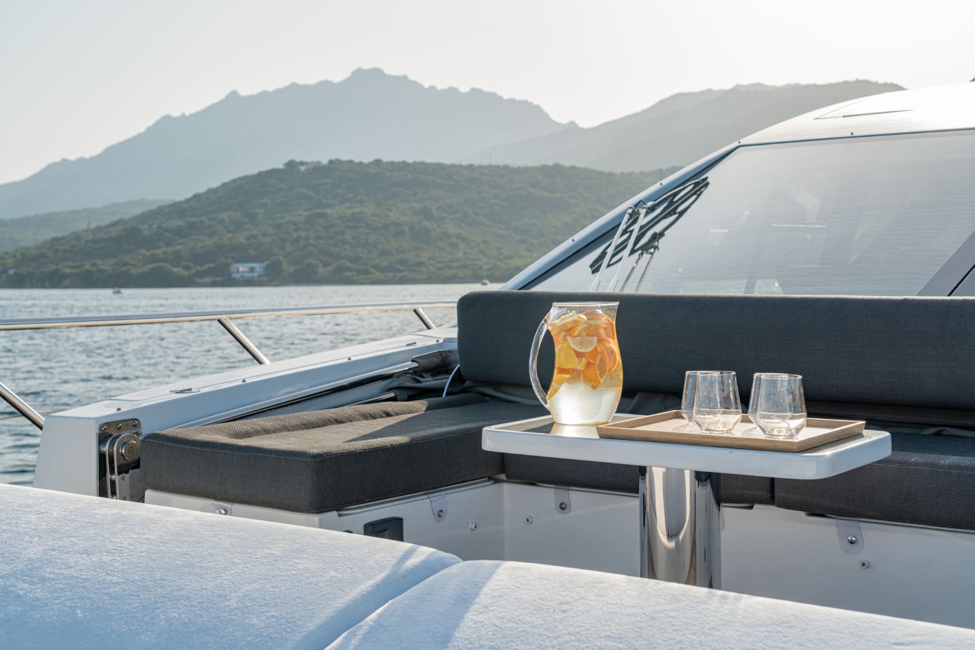 The deck furnishings are supremely comfortable and are presented in a palette of soft grey which blends beautifully with the teak deck and white superstructure.
