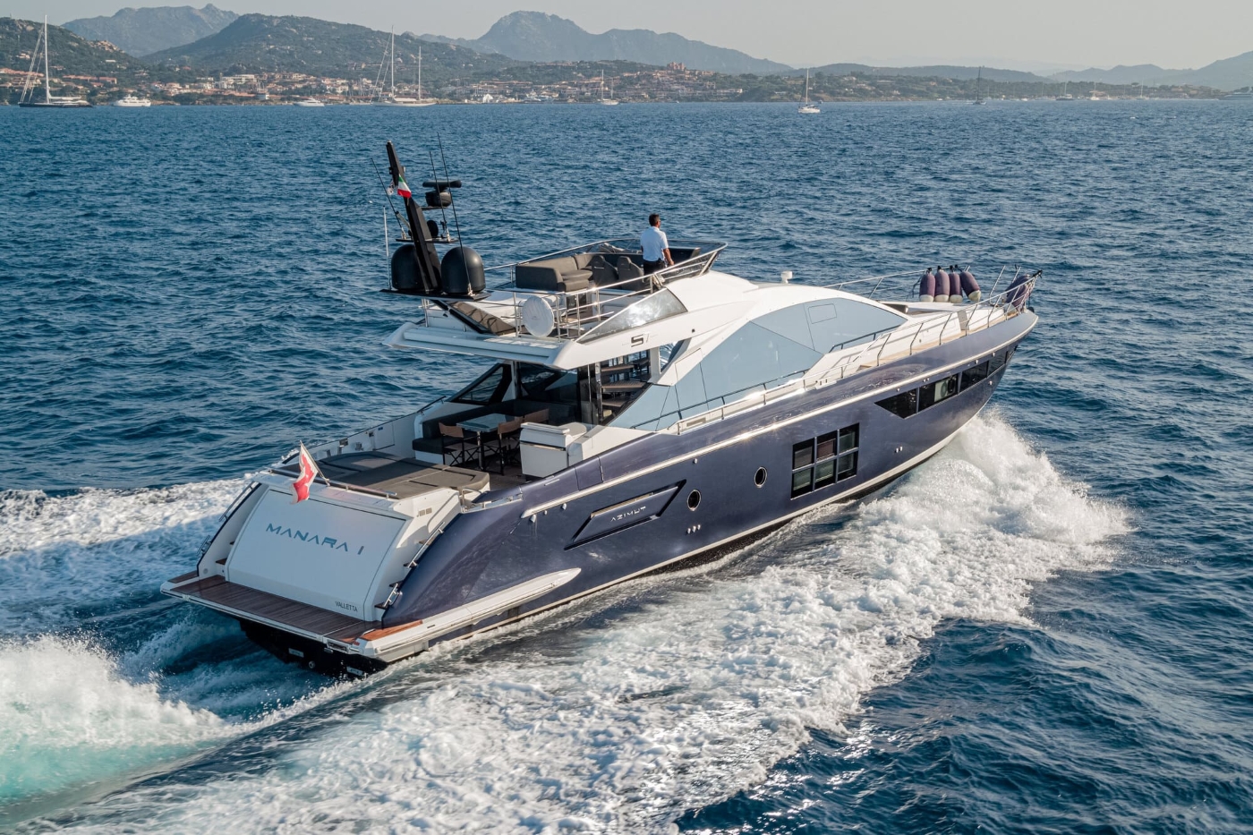 Luxury yacht MANARA PRIMA is a 21.50m (70' 6") Azimut S7 motor yacht built in 2018 to a high spec and can reach a top speed of 36 knots. She can accommodate up to six guests in three suites looked after by a 2-person crew.