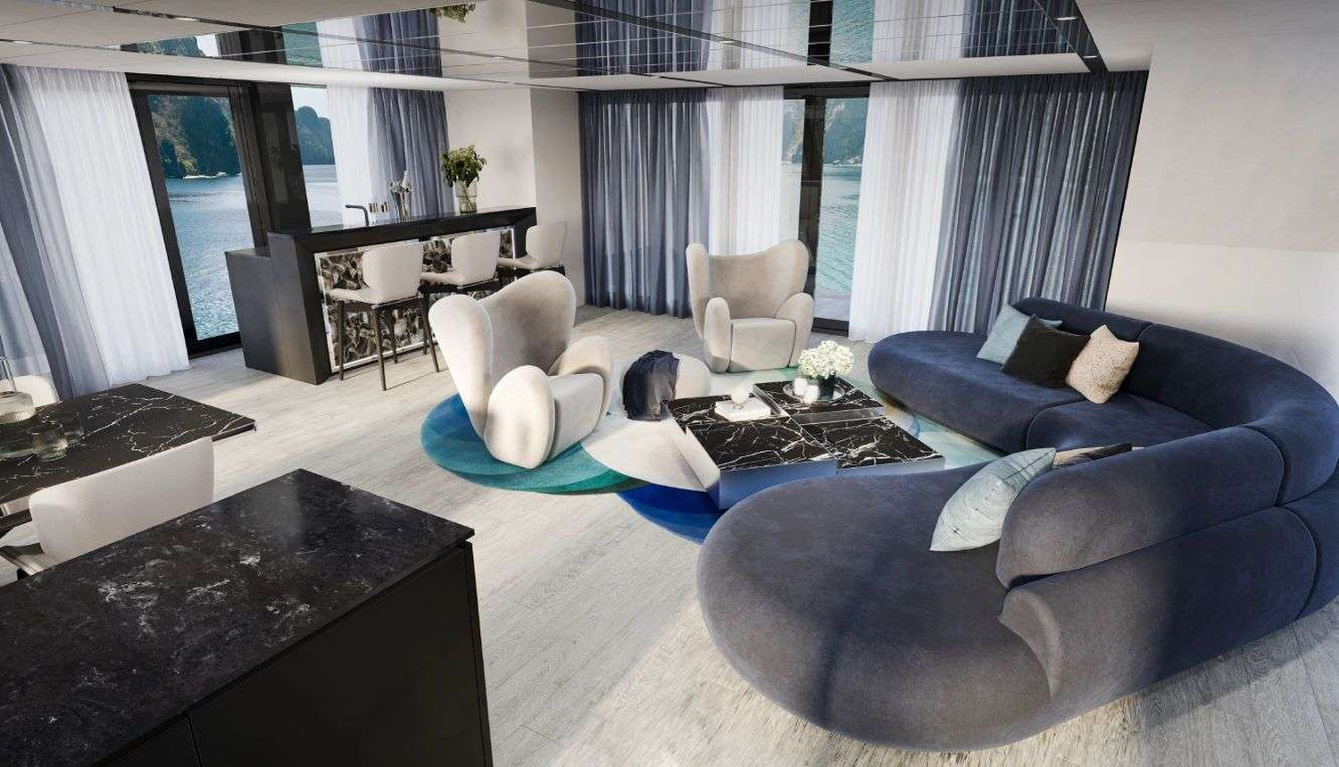 The main salon of MARIA THERESE is open-plan and tastefully styled in a palette of soft, modern tones. Large windows flood the space with light, while natural textures and sleek finishes add to the sense of refinement. A bar, formal dining area, and plush lounge seating make this a convivial setting, whether enjoying dinner or escaping the midday sun.