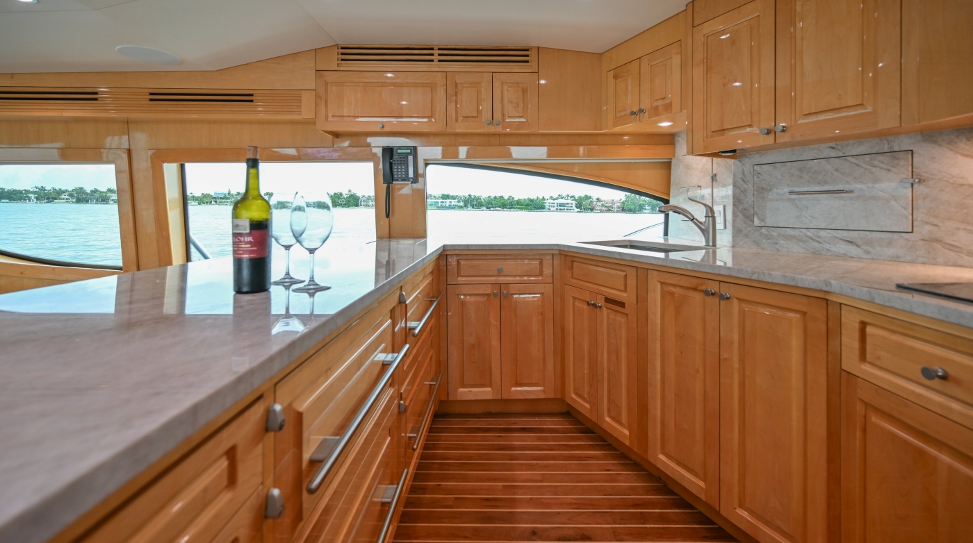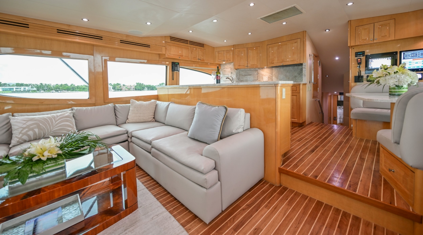 The beautifully maintained interior is light and bright with a homely, neutral décor. The main salon is configured with a lounge aft and forward dining table. The lounge offers two comfortable sofas and two cosy armchairs surrounding a coffee table to create a convivial space while the dining table has great views from the panoramic windows.