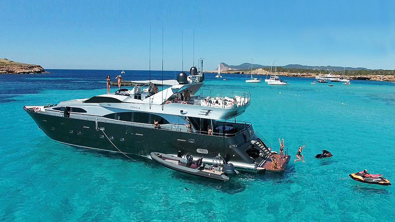 NOTABLE FEATURES OF MEDUSA: ~Refitted in 2017 ~Up to 30 guests for dockside events ~Flybridge Jacuzzi ~Abundance of sunbeds ~Salon cinema ~DJ setup available ~Top speed of 25 knots ~Draft of 1.9m/6.3ft for cruising in shallow waters ~Air conditioning ~Wi-Fi
