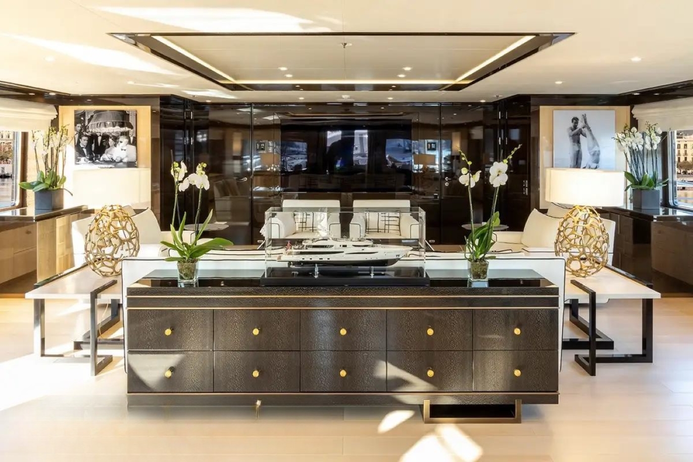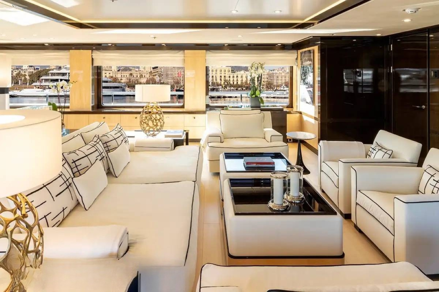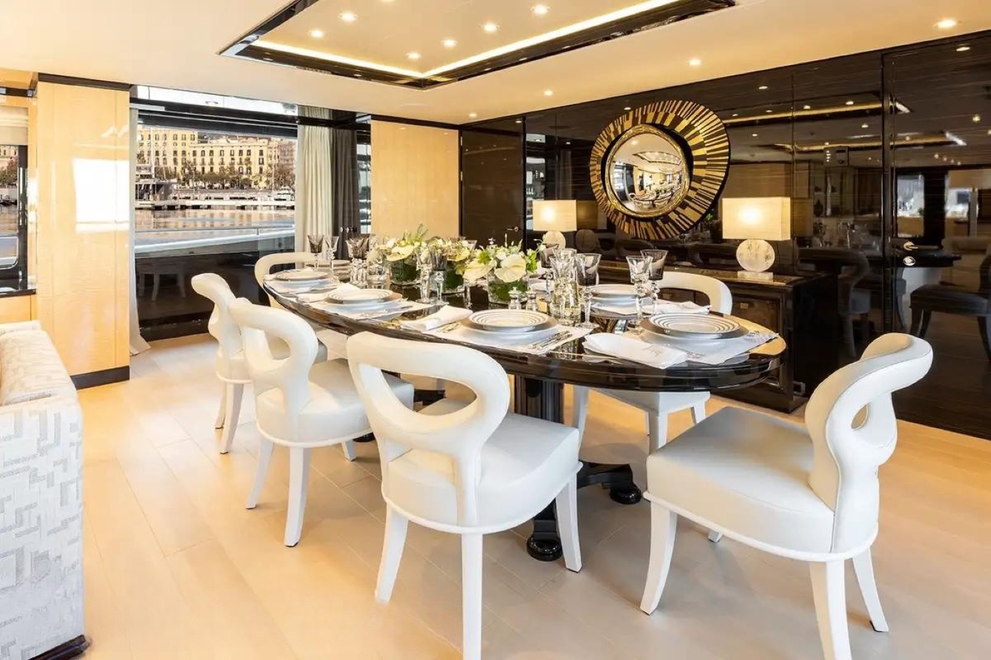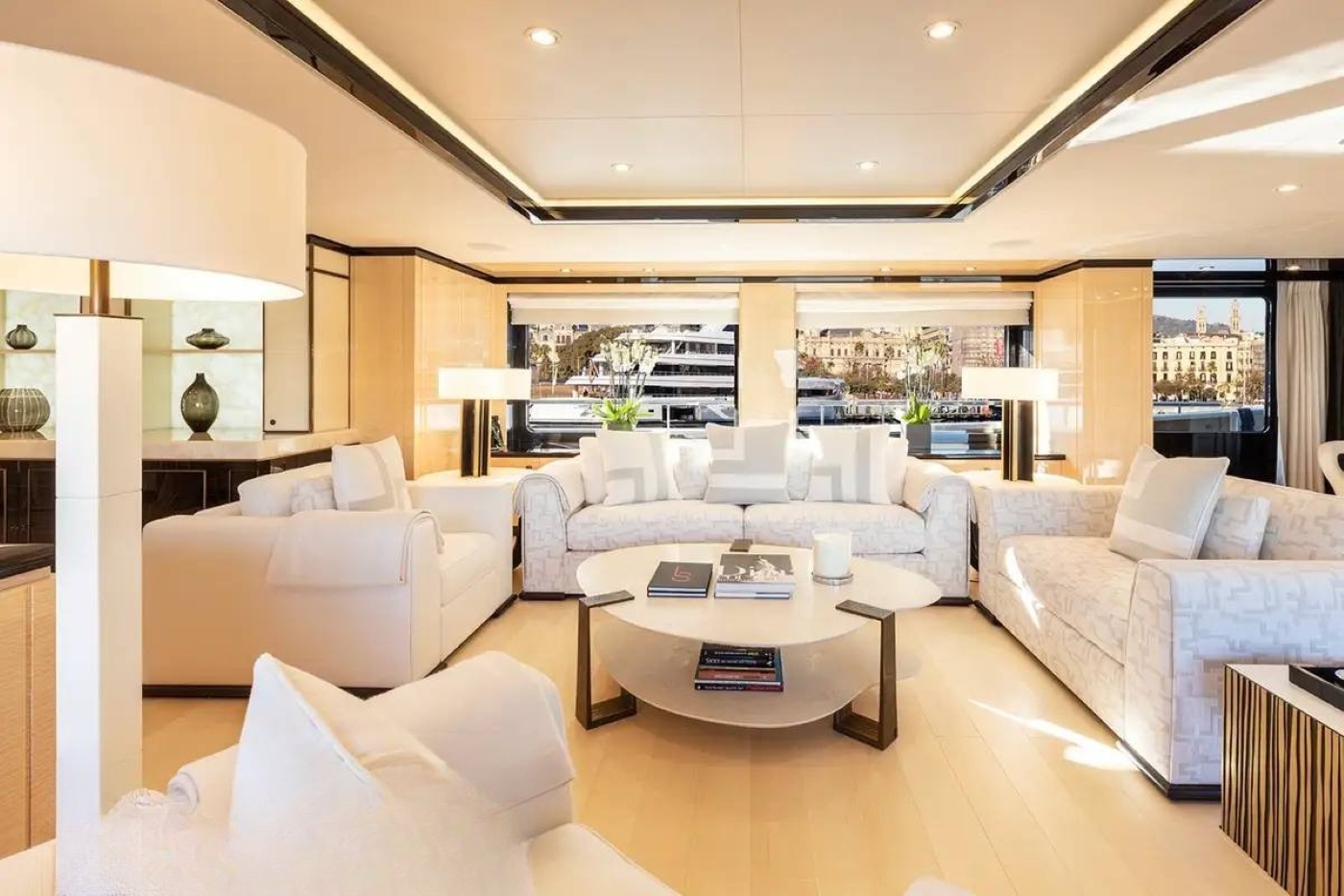 Inside, MELLON unfolds in sophisticated comforts. The main salon is bathed in natural light, thanks to expansive windows and fold-down balconies, and styled with high-quality finishes in a classic European palette. Tasteful furnishings combine comfort and refinement, with easy transitions between leisure, dining and social spaces.