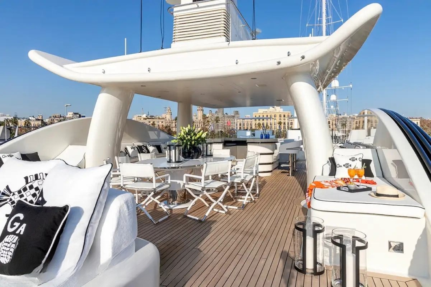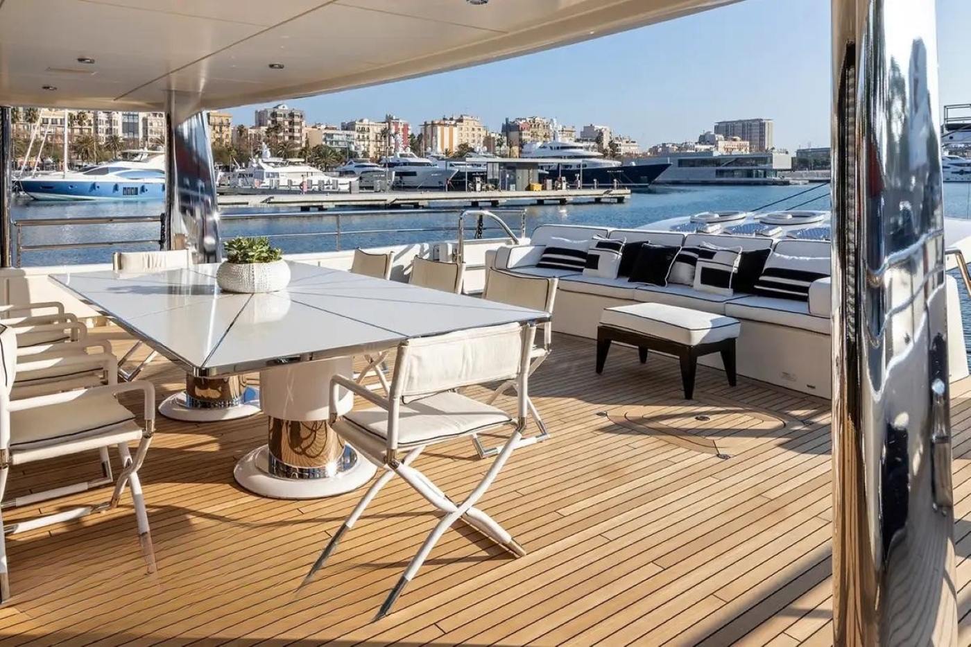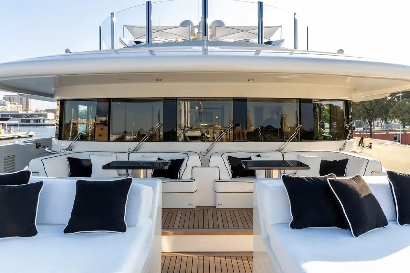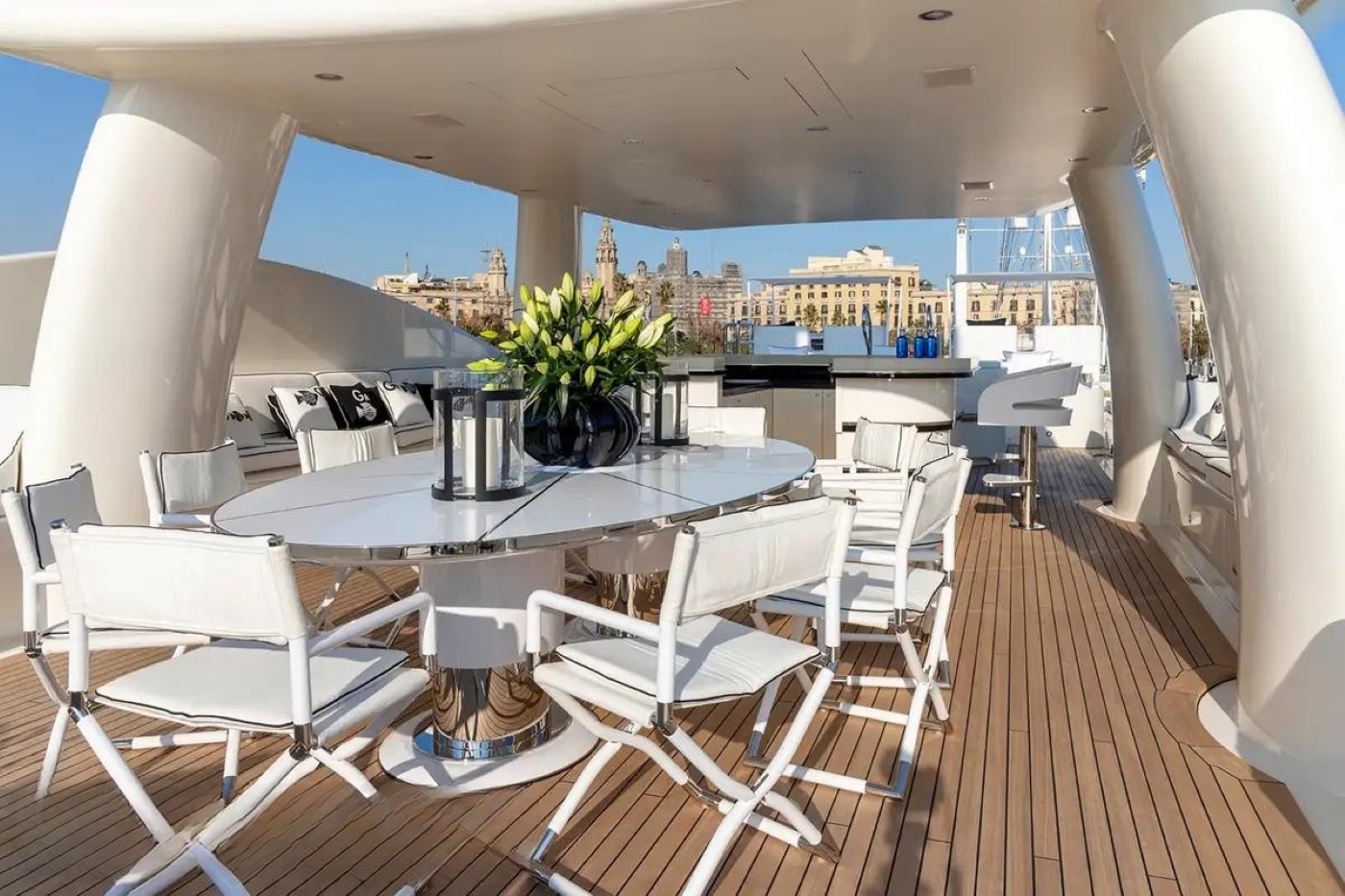 Inside, MELLON unfolds in sophisticated comforts. The main salon is bathed in natural light, thanks to expansive windows and fold-down balconies, and styled with high-quality finishes in a classic European palette. Tasteful furnishings combine comfort and refinement, with easy transitions between leisure, dining and social spaces.