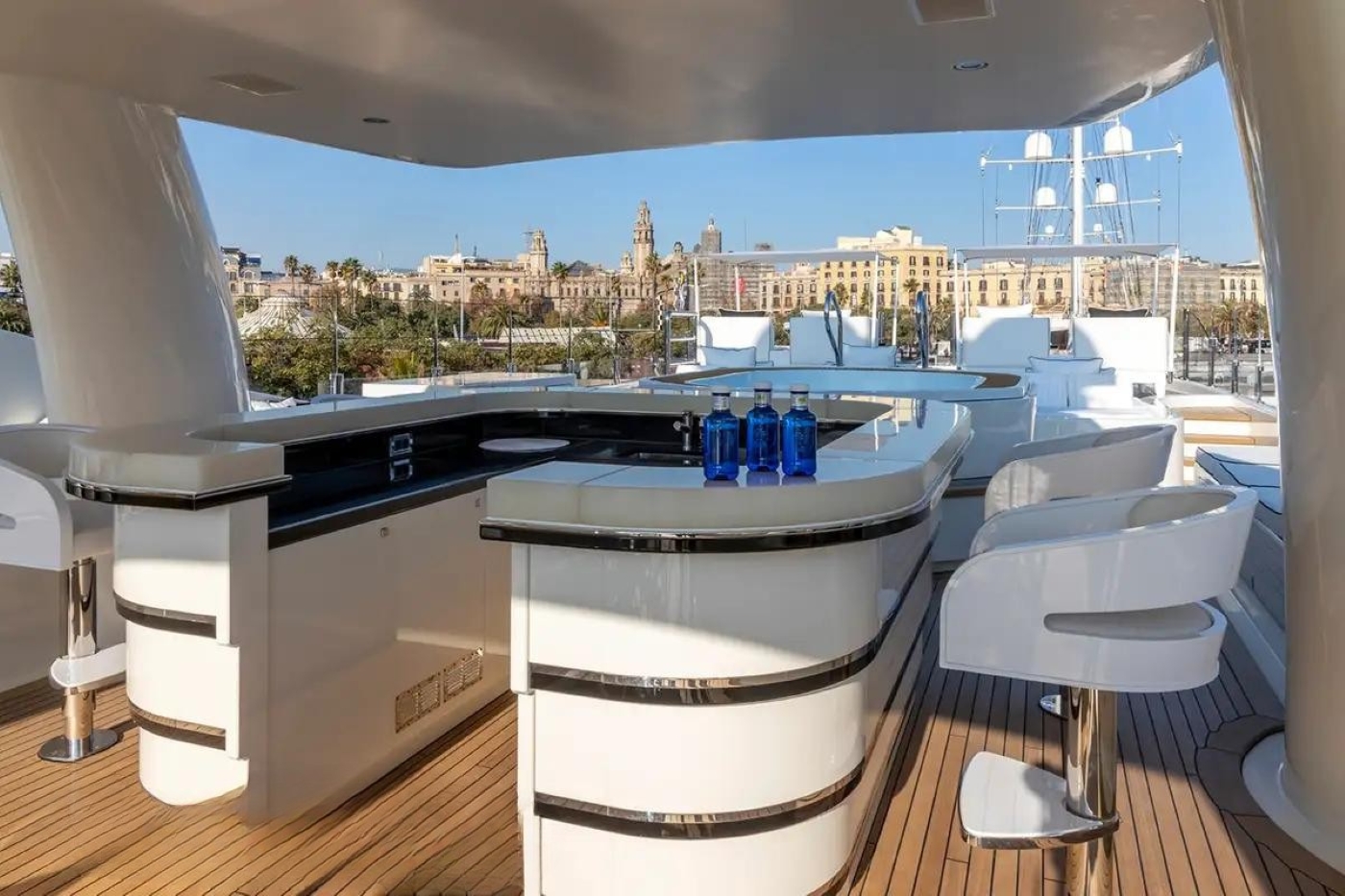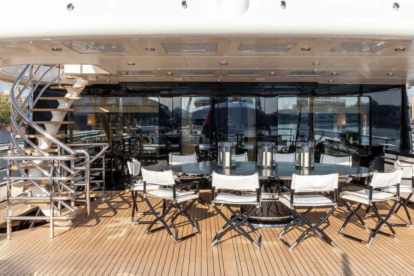 Crafted over three decks, MELLON offers generous al fresco living spaces framed by teak and classic styling. The sun deck is a serene retreat: forward, a helipad transforms into a sun lounge; aft, a seven-person jacuzzi is surrounded by sun pads, while a wet bar and BBQ make this deck perfect for casual entertaining.