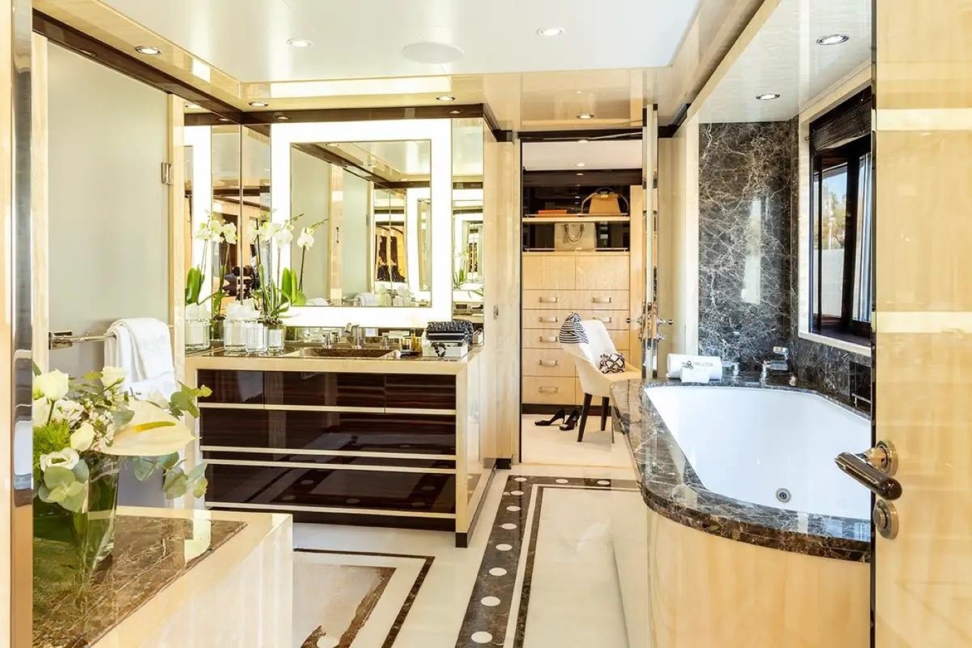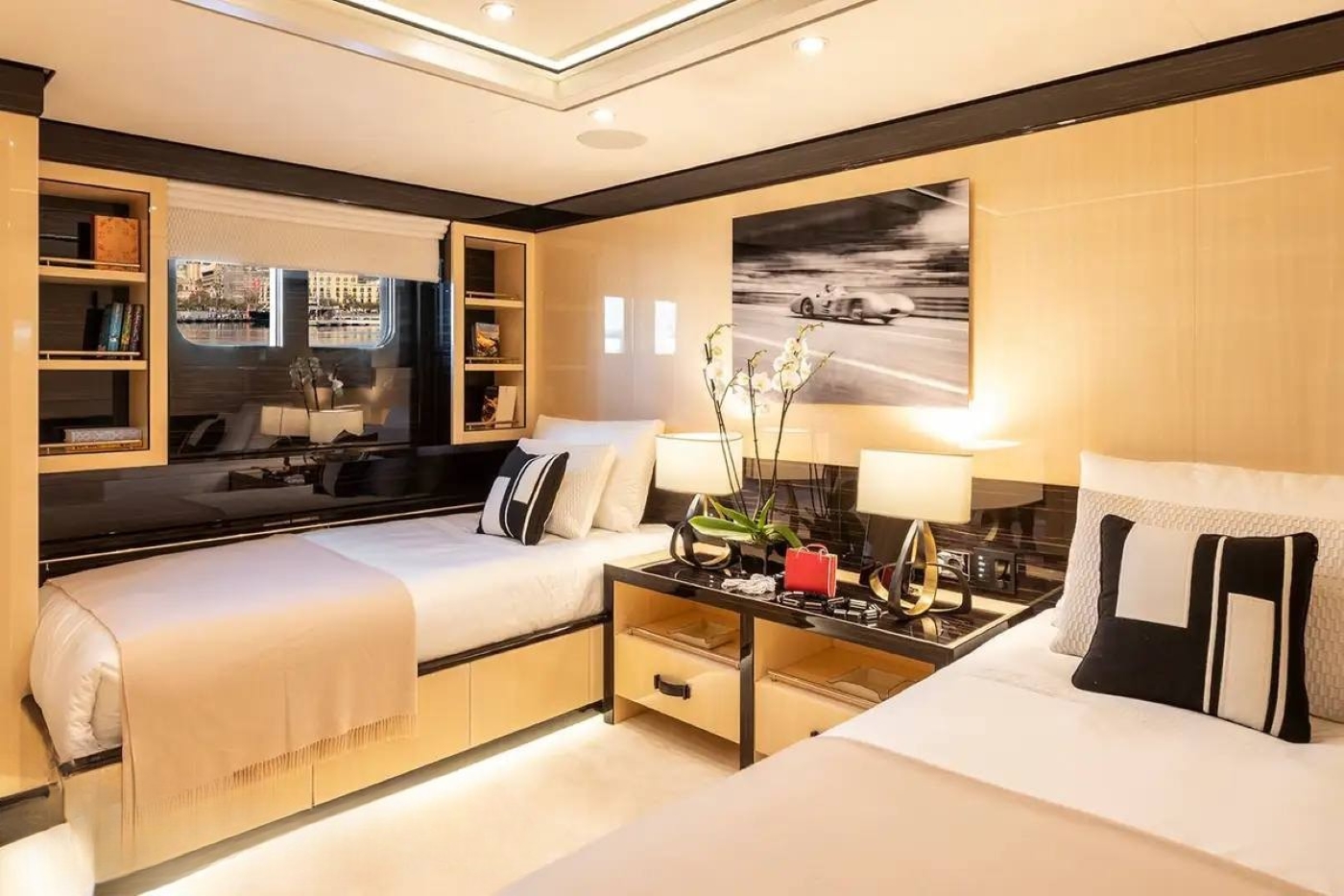 ~Master Suite (main deck): Full-beam stateroom with king-size bed, private lounge, study/office, en suite with bath and shower, walk-in wardrobe and vanity ~VIP Suite (lower deck): Twin/double configuration, en suite bathroom ~2 Double Cabins (lower deck): Each with queen-size or double beds and en suite shower ~2 Twin Cabins (lower deck): Each with twin beds and an additional Pullman berth, en suite shower All guest suites are thoughtfully appointed for space, privacy and light.