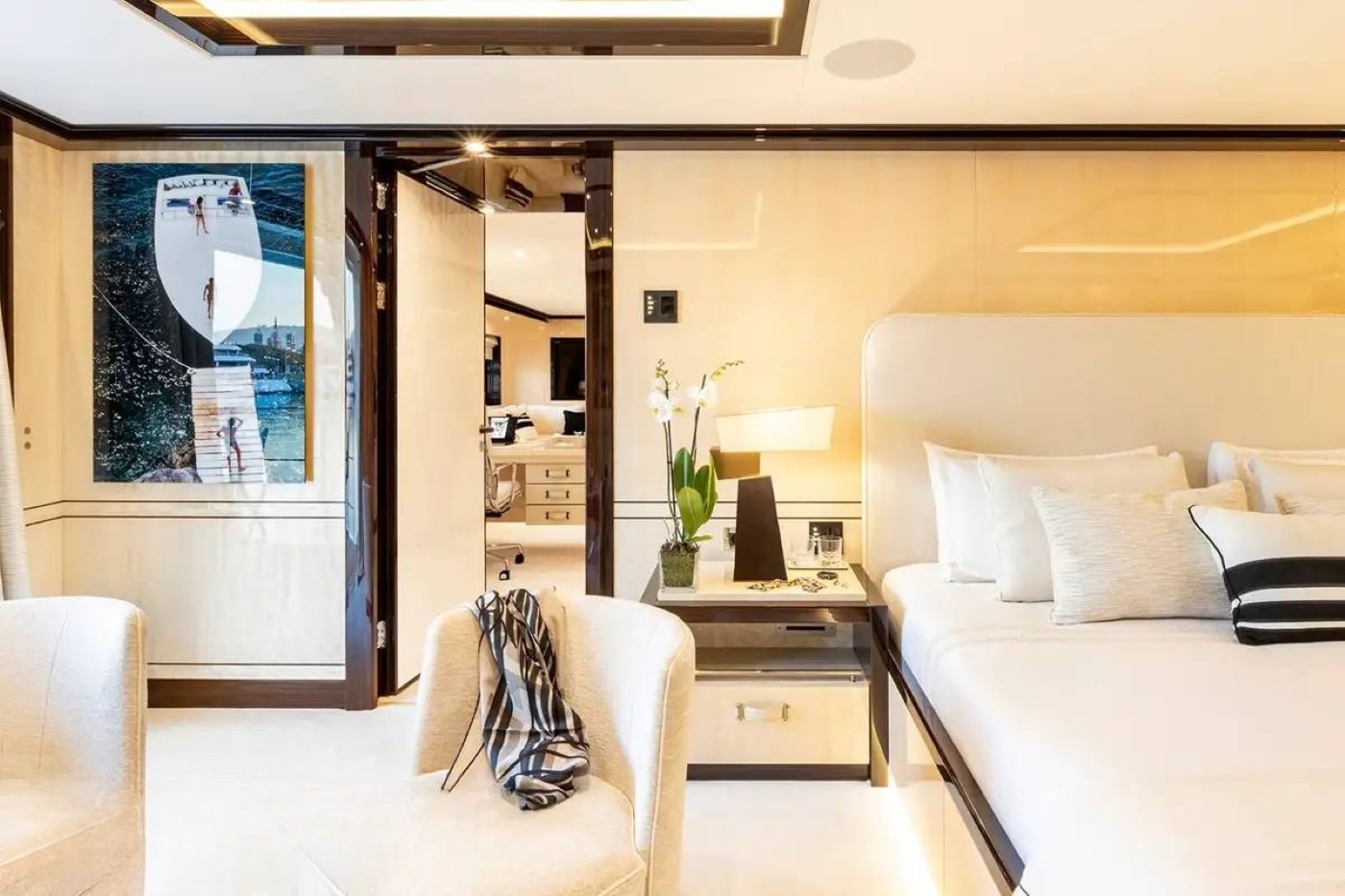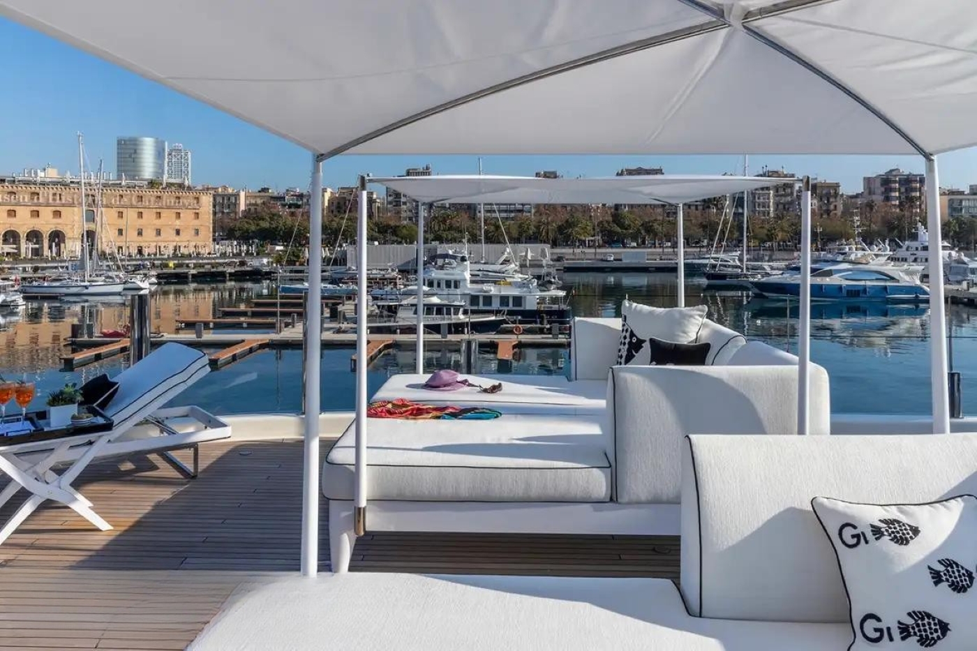 The bridge deck aft features an – oval dining table sheltered beneath the hardtop overhang, accompanied by L shaped sun lounges that adapt with removable awnings. On the main deck aft, a relaxed lounge occupies a shaded spot under the deck above, complete with banquette seating, club chairs and easy access to the fold-down balconies. Below, the beach club offers a spa-like space – complete with sauna, day head, shower and hydraulic swim platform – ideal for spa sessions, toy access and quiet coastal moments.