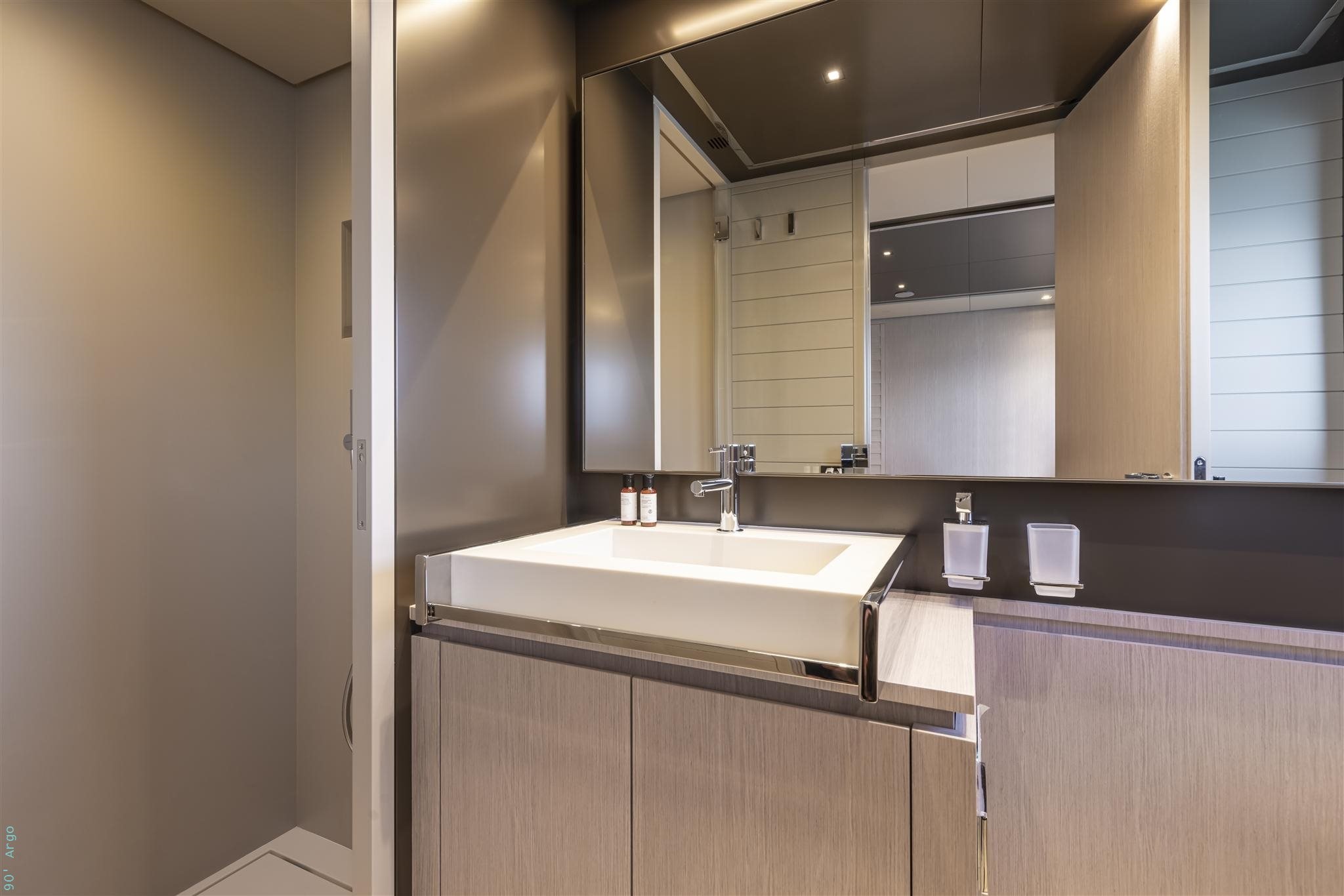 The private main deck master stateroom reflects the contemporary feel seen across the yacht and boasts a king-sized bed, lounge area, vanity/desk and luxury ensuite with double sinks and a separate shower and head. The lower deck staterooms are configured as a full beam VIP, a double to port and convertible double/twin to starboard. The VIP boasts a lounge area, vanity/desk and ensuite while the two other staterooms also have ensuite bathroom facilities. The separate crew accommodation is forward on the lower deck.