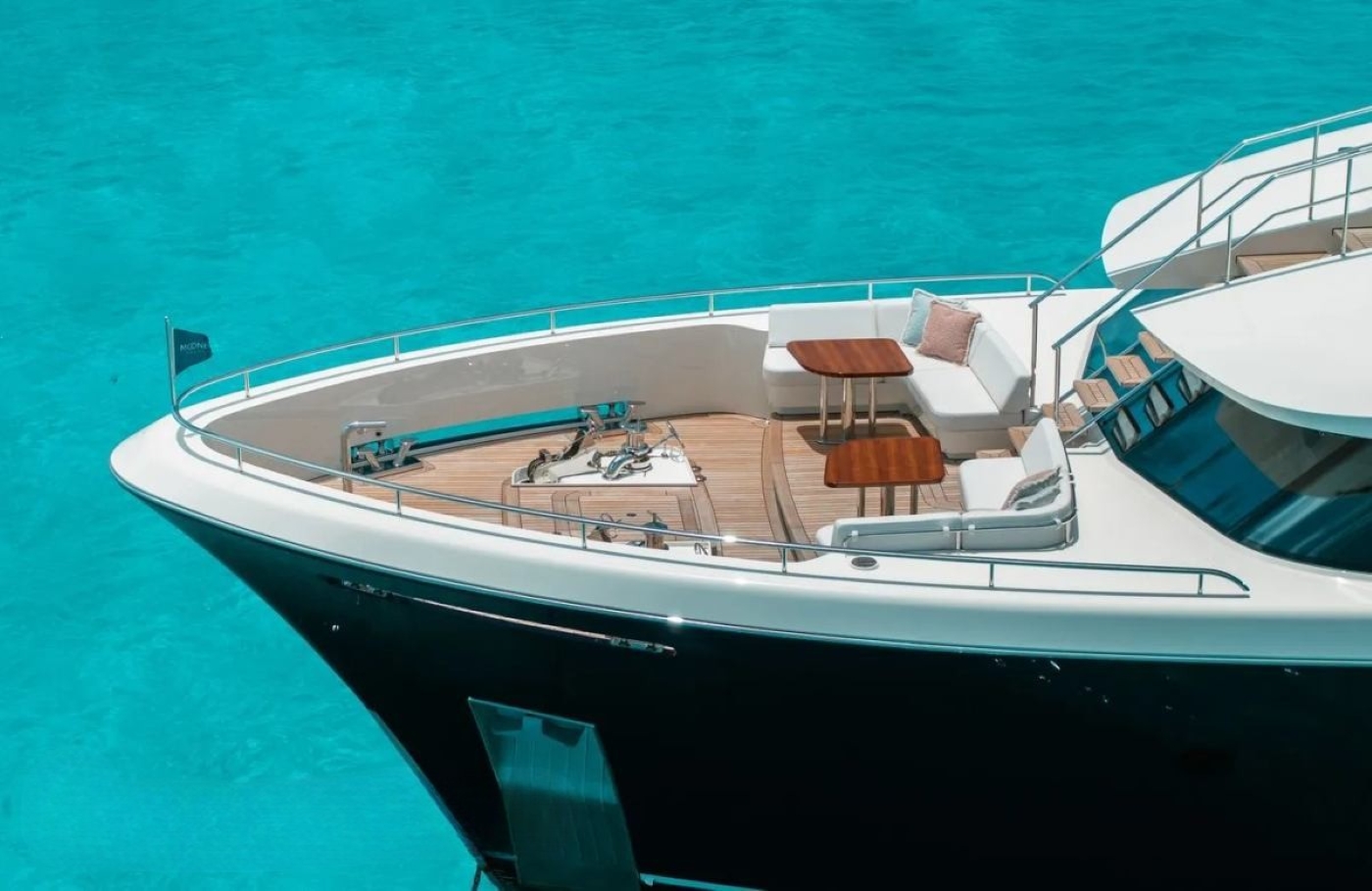 The main deck aft is dedicated to al fresco dining where a large dining table, sofa and moveable seating sits under the flybridge overhang. Steps on either side lead down to the sizeable water’s edge swim platform and garage which can house a 7.5m tender and selection of water toys. The lower level of the foredeck has a seating area with tables offering great views over the bow.