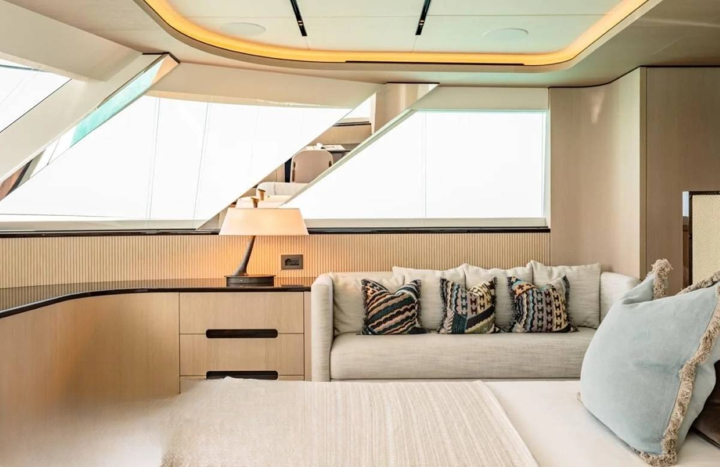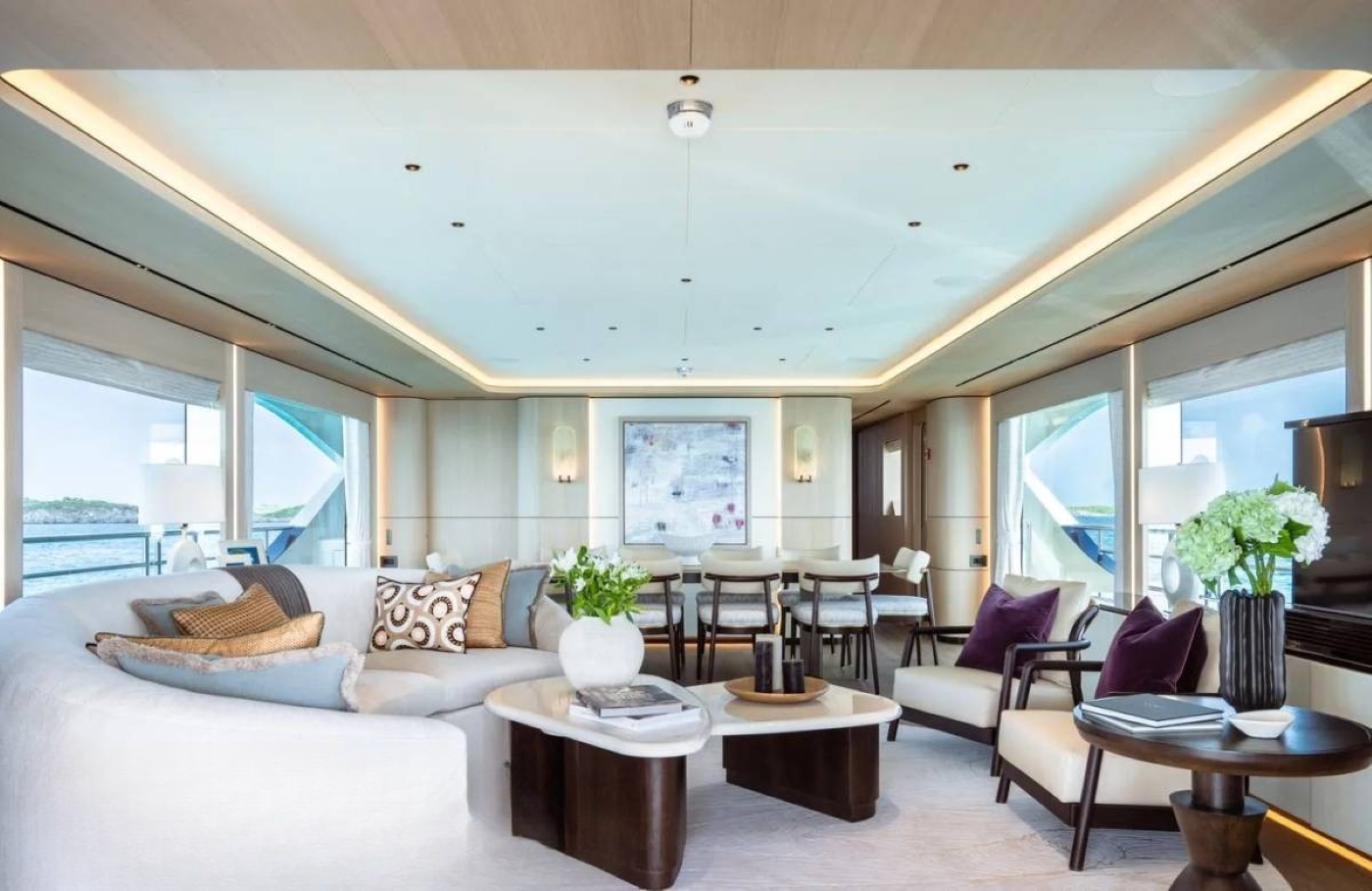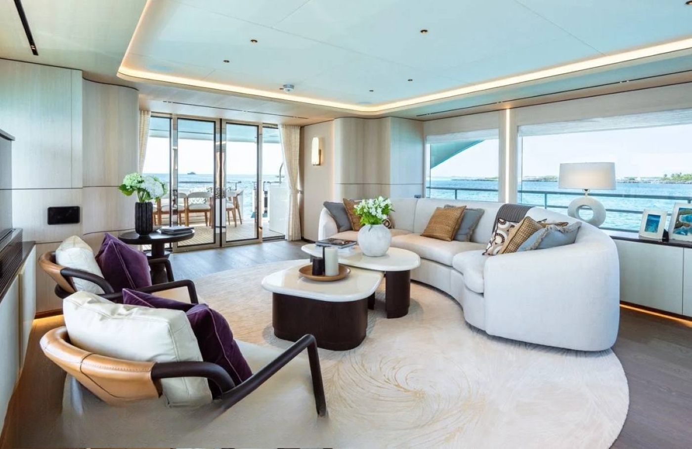 Her interior is inspired by vintage 1980s designs from the shipyard recreated with modern concepts. The open and spacious layout features elegant and organically curved furnishings which create a warm and welcoming atmosphere. The main salon features a sofa and coffee table aft and large dining table forward.