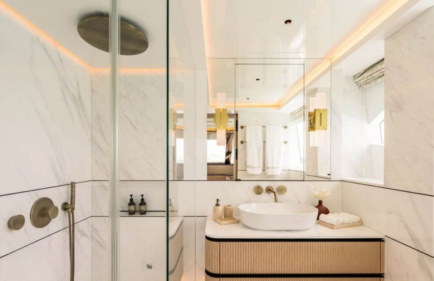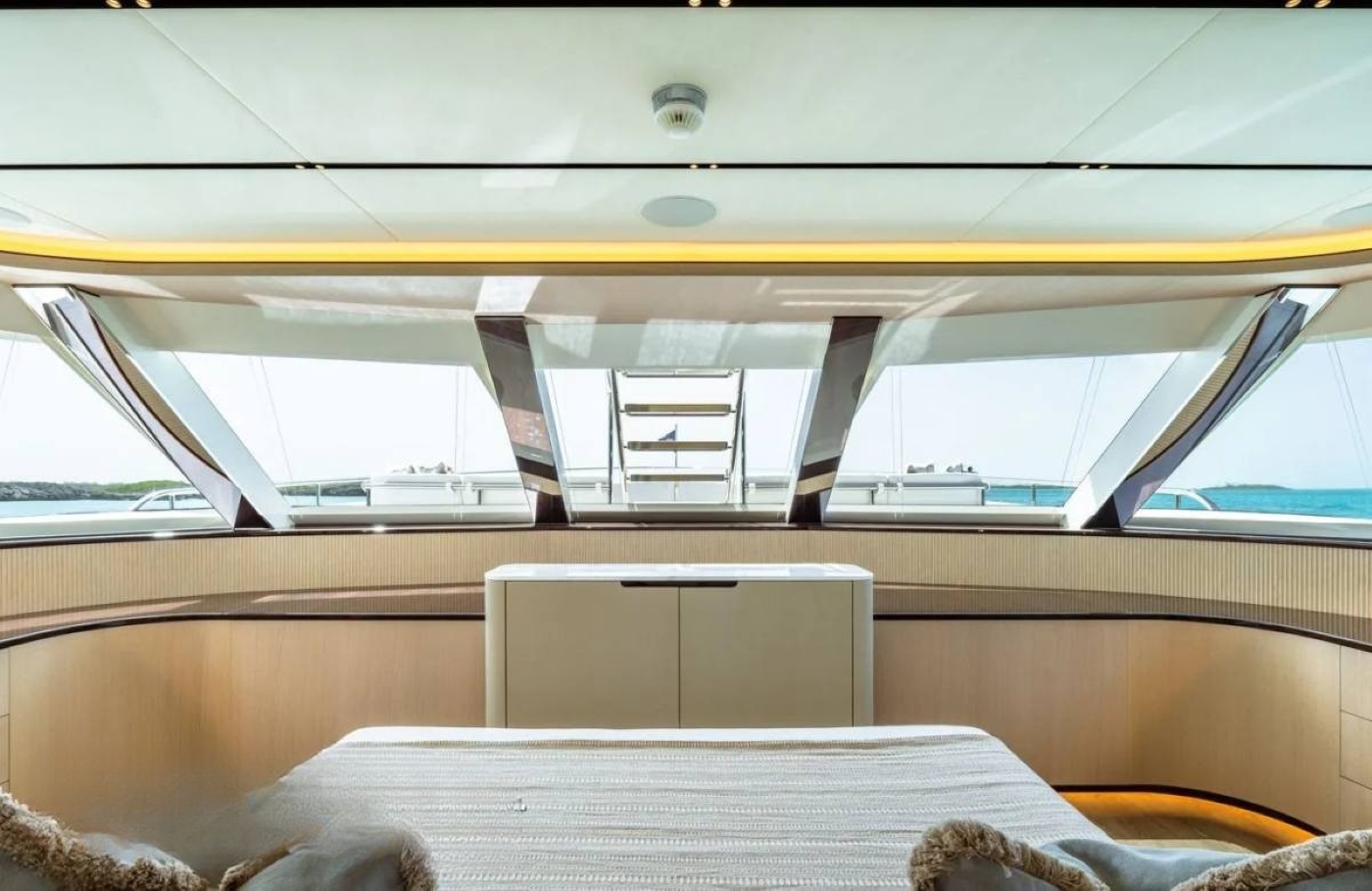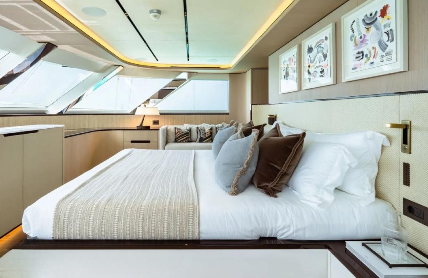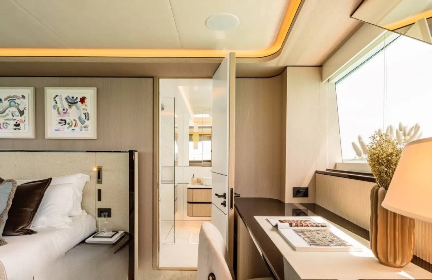 Her interior is inspired by vintage 1980s designs from the shipyard recreated with modern concepts. The open and spacious layout features elegant and organically curved furnishings which create a warm and welcoming atmosphere. The main salon features a sofa and coffee table aft and large dining table forward.
