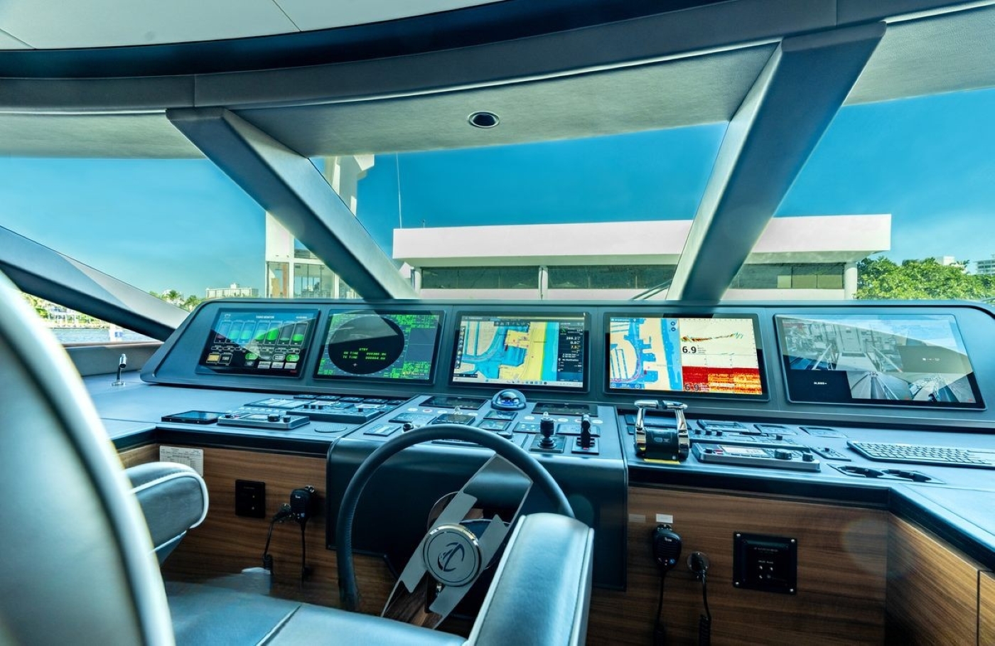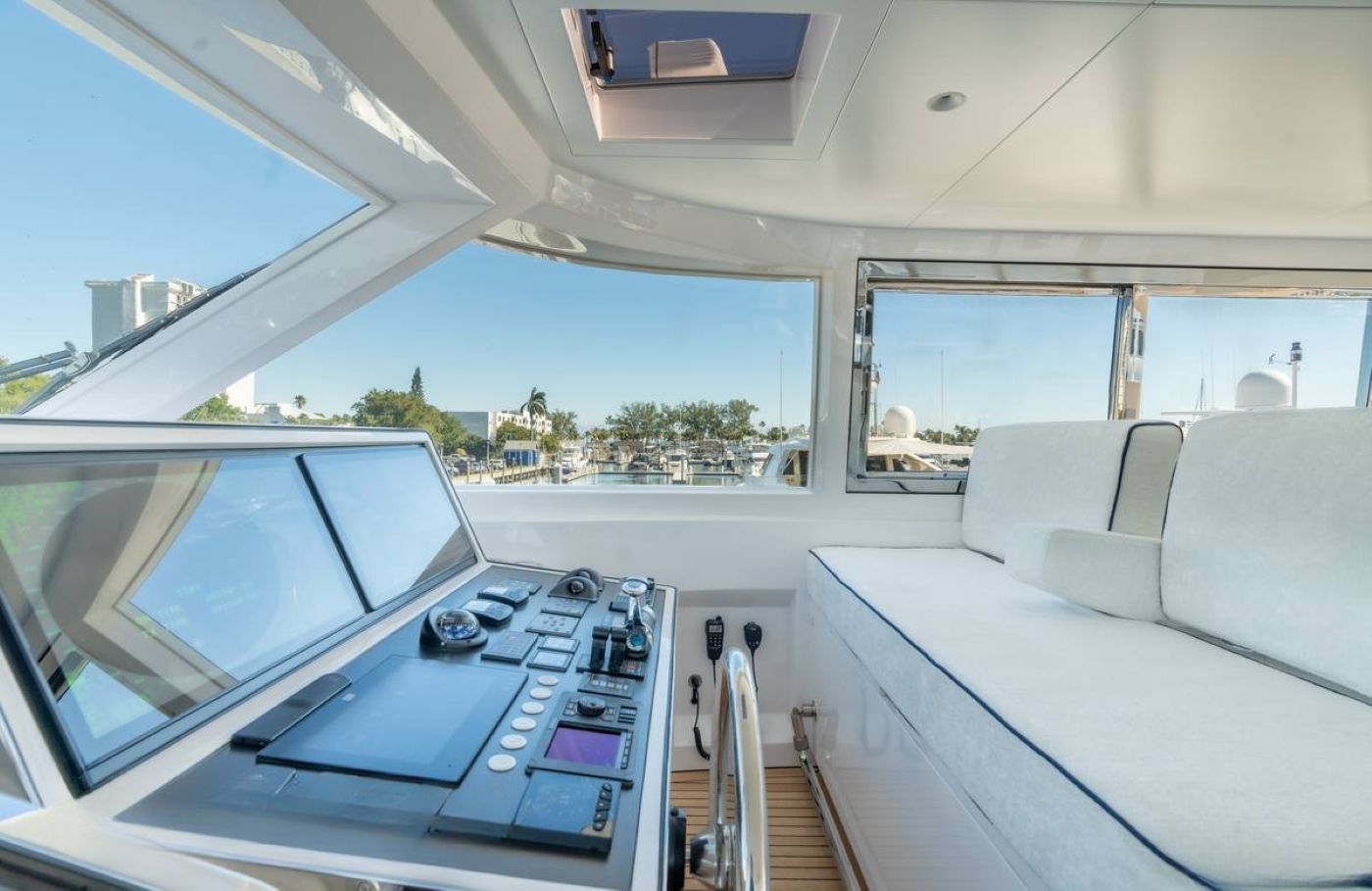The flybridge offers the perfect vantage point to take in panoramic views of the sea from the multipurpose dining and entertainment area to aft. Eight moveable chairs surround an up/down table which can be rearranged to become an outdoor movie theatre using the giant projector screen. A sit up bar, styled with aquatic-inspired mosaic tiles, exudes style and nautical elegance while a comfortable L-shaped sofa accompanied by two ottoman tables set the tone for relaxing get-togethers. Forward and offset to starboard is a second helm station with seating for two.