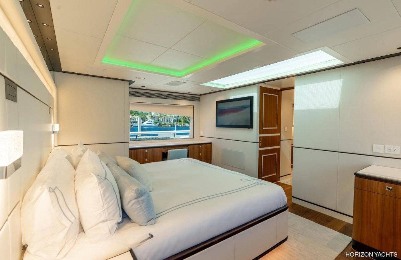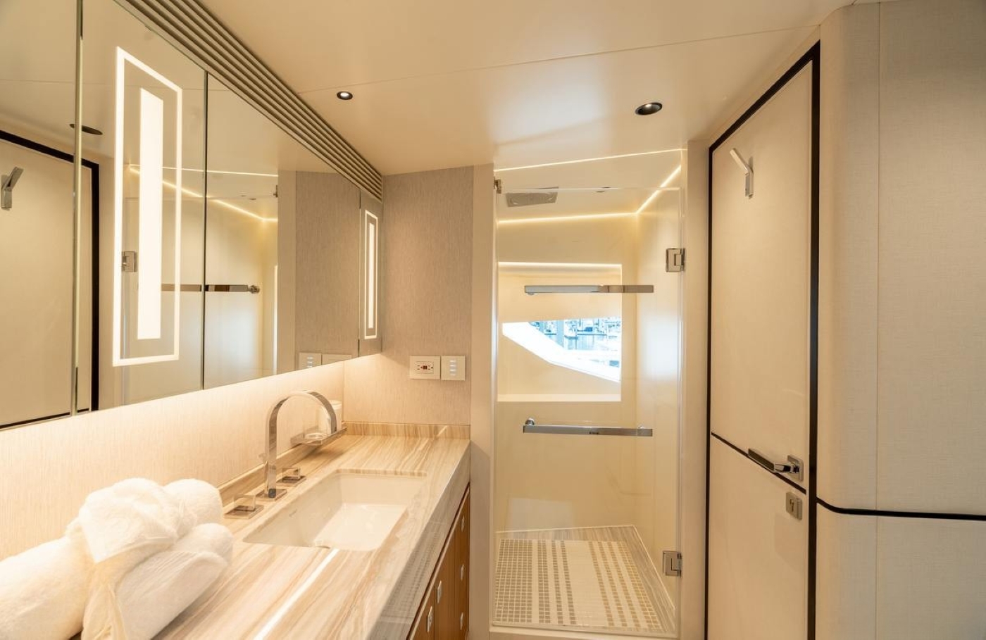 Configured to the owner’s preferences, the galley leads off the main foyer – aft from the salon - and is finished in Cambria stone while offering ample storage and functionality.