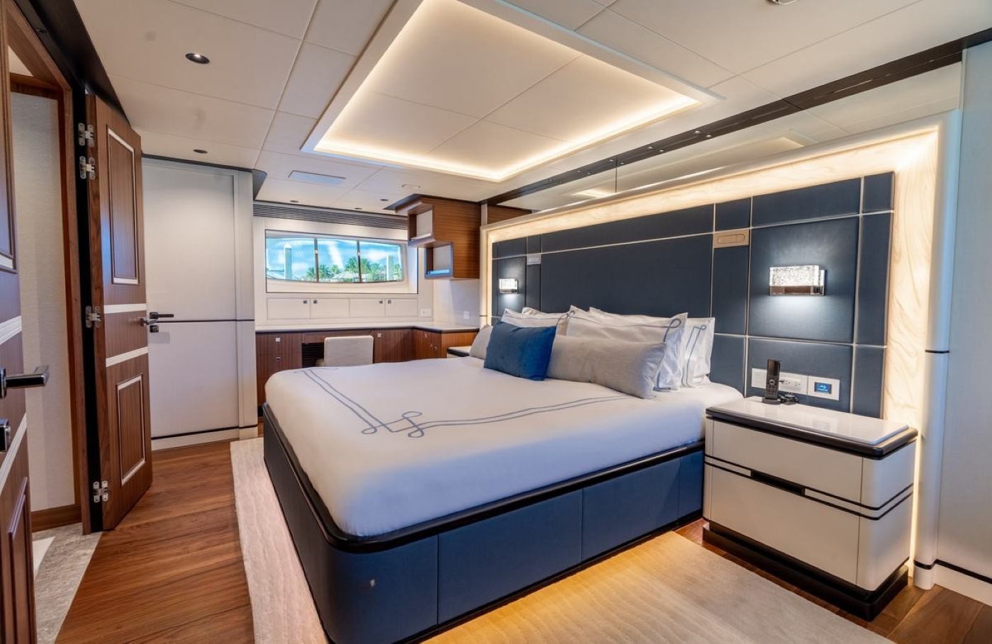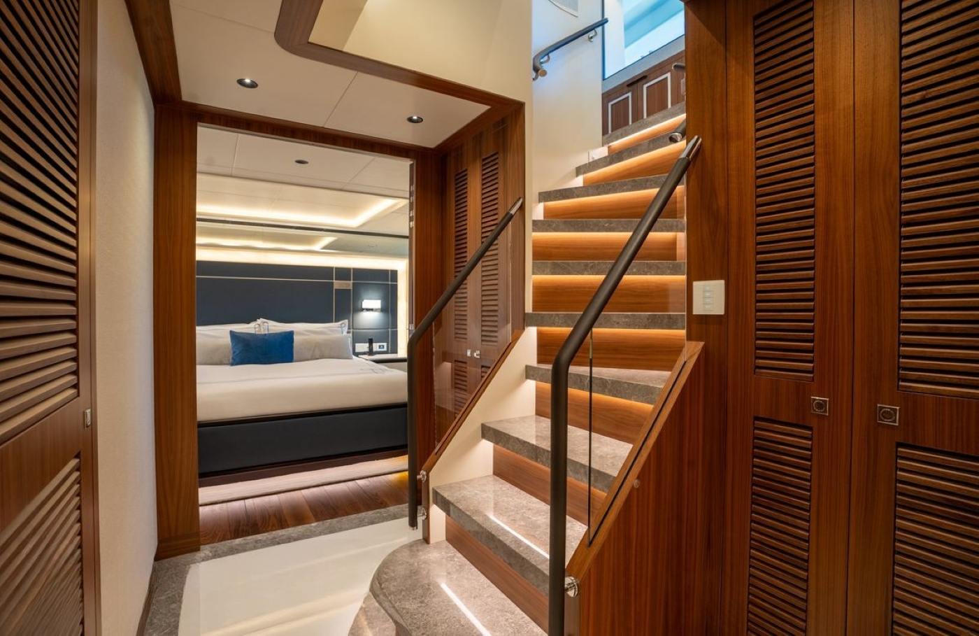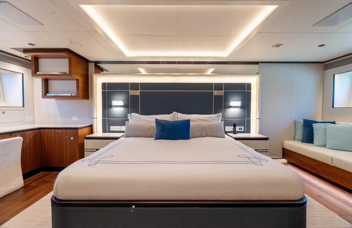 Accommodation is for up to eight guests (10 including the beach club room) in four suites including a full-beam, main deck master stateroom with a king-sized bed, walk-in wardrobes and a mosaic-themed his-and-hers ensuite with dual vanity sinks. The design embraces the need for technology with convenient, concealed wireless charging stations in the nightstands and the vanity table. Below deck, accommodation is for up to six guests in three ensuite guest rooms, including a full-beam VIP with a king-sized bed, a walk-in wardrobe, and a double vanity sink in the ensuite bathroom. Each stateroom is decorated with its own mosaic coloured scheme, accompanied by elegant walnut accents for added warmth. Three, well-appointed ensuite crew cabins provide separate accommodation for up to six crew members, comprising a double Captain’s cabin, two sets of bunk cabins, and the crew mess.