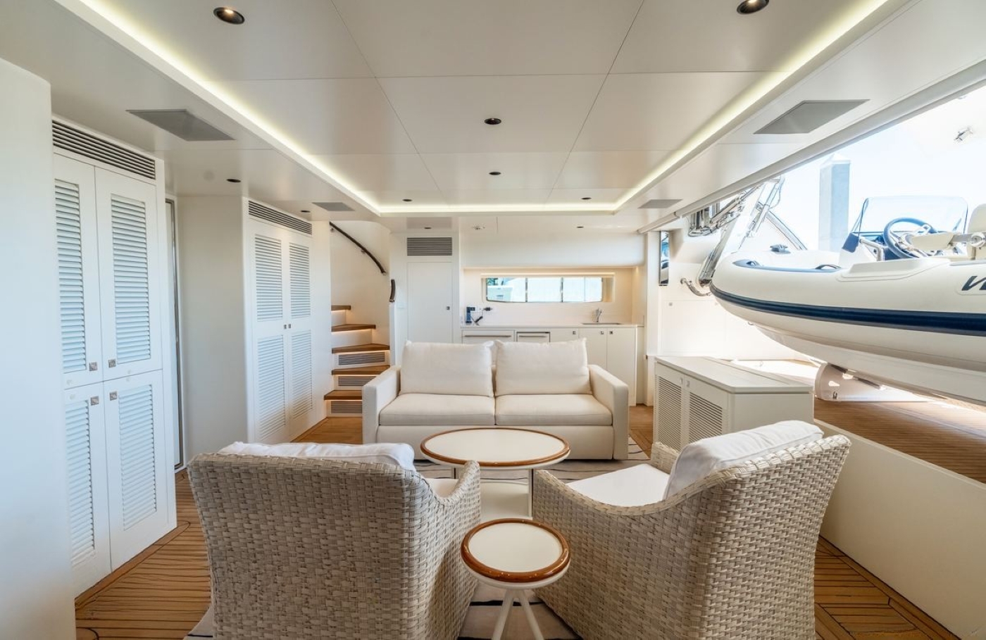 Stepping aboard, the aft deck features a U-shaped sofa complemented by a teak coffee table with a beautiful high-gloss starburst design and, at the owner’s request, a Hi/Lo coffee machine conveniently stowed away to starboard. A 43” fold-up LED TV and sound system create a great atmosphere for social occasions.