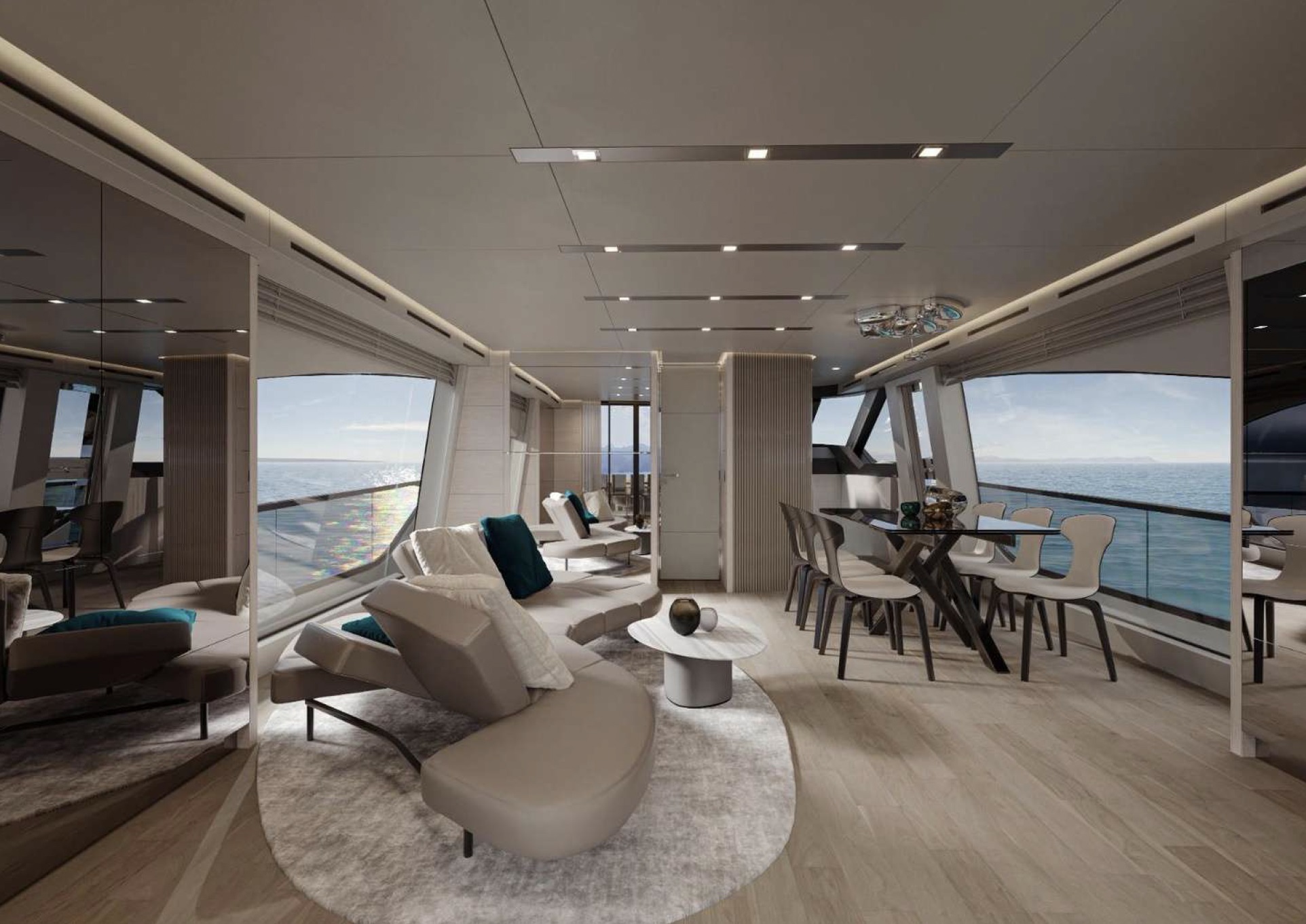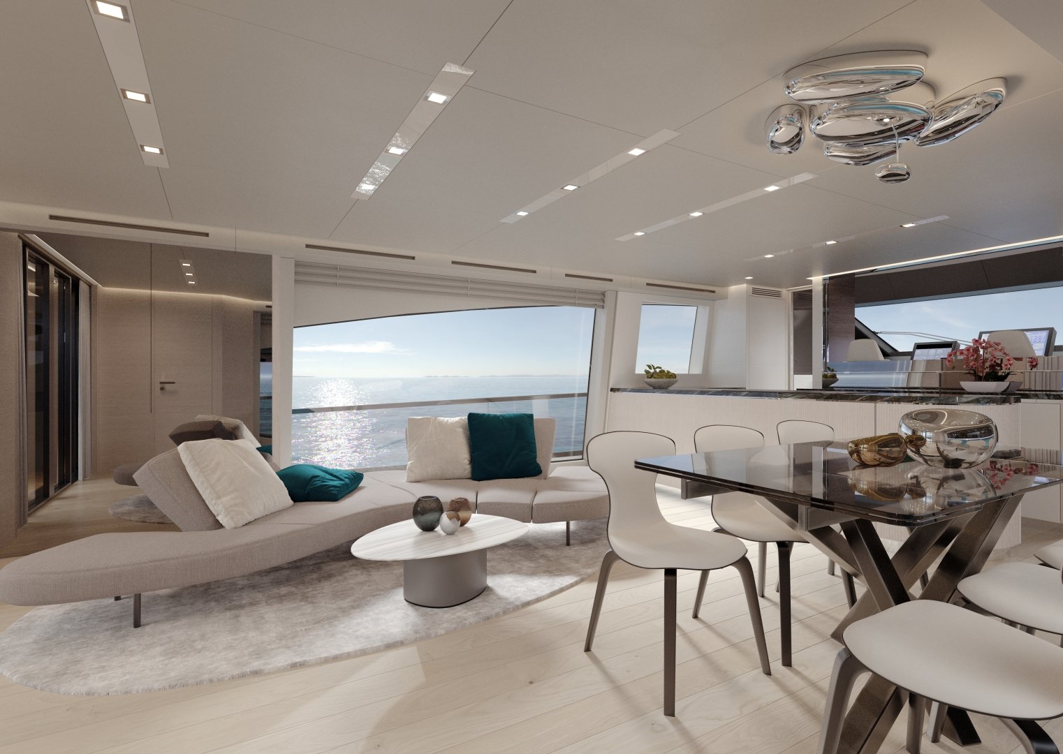 The huge windows and glass sliding doors in the main salon make the space feel very connected to the exterior. There is a lounge area and dining setting with the galley and wheelhouse forward.