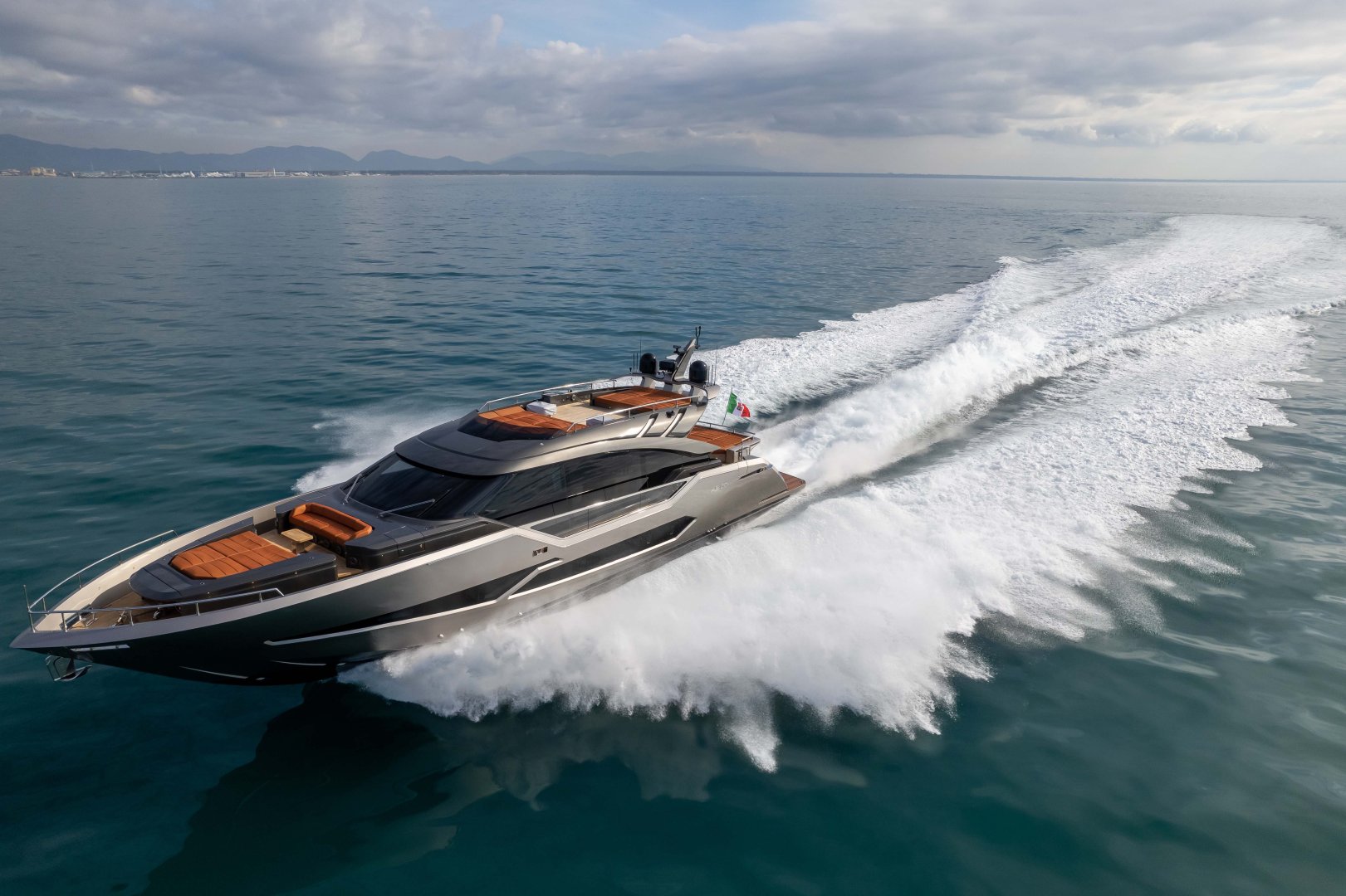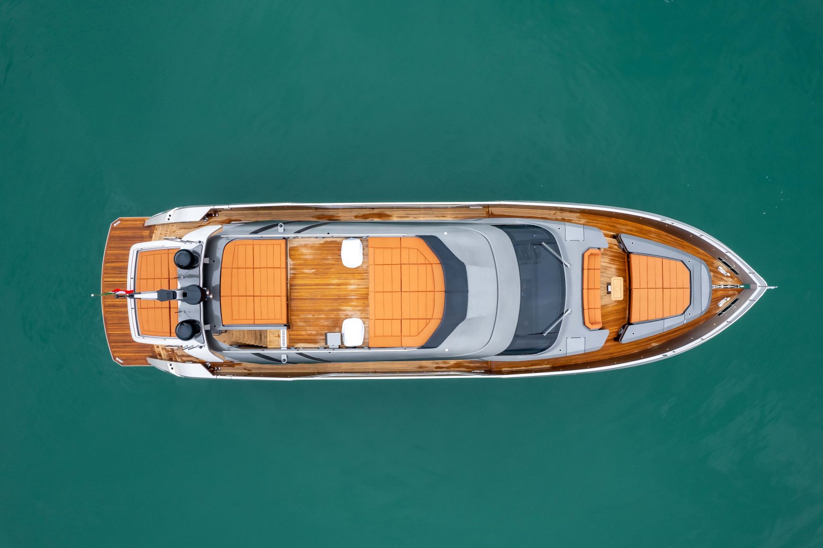 For her size, the yacht is extremely spacious with loads of al fresco relaxation space configured across the sun deck, foredeck and aft cockpit. The sun deck is dedicated to sunbathing with two generous expanses of cushioned sun pads. The aft cockpit offers more sunbathing on adjustable sun pads, plus a dining area and steps down to the swim platform. The transom door opens to reveal a large garage for the tender and toys. The foredeck offers a different perspective with views over the bow from the built-in sofa and yet more sunpads.