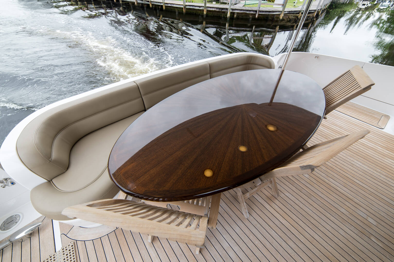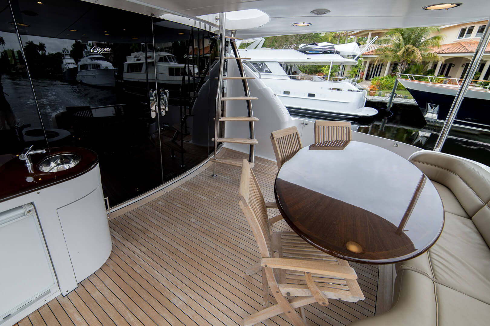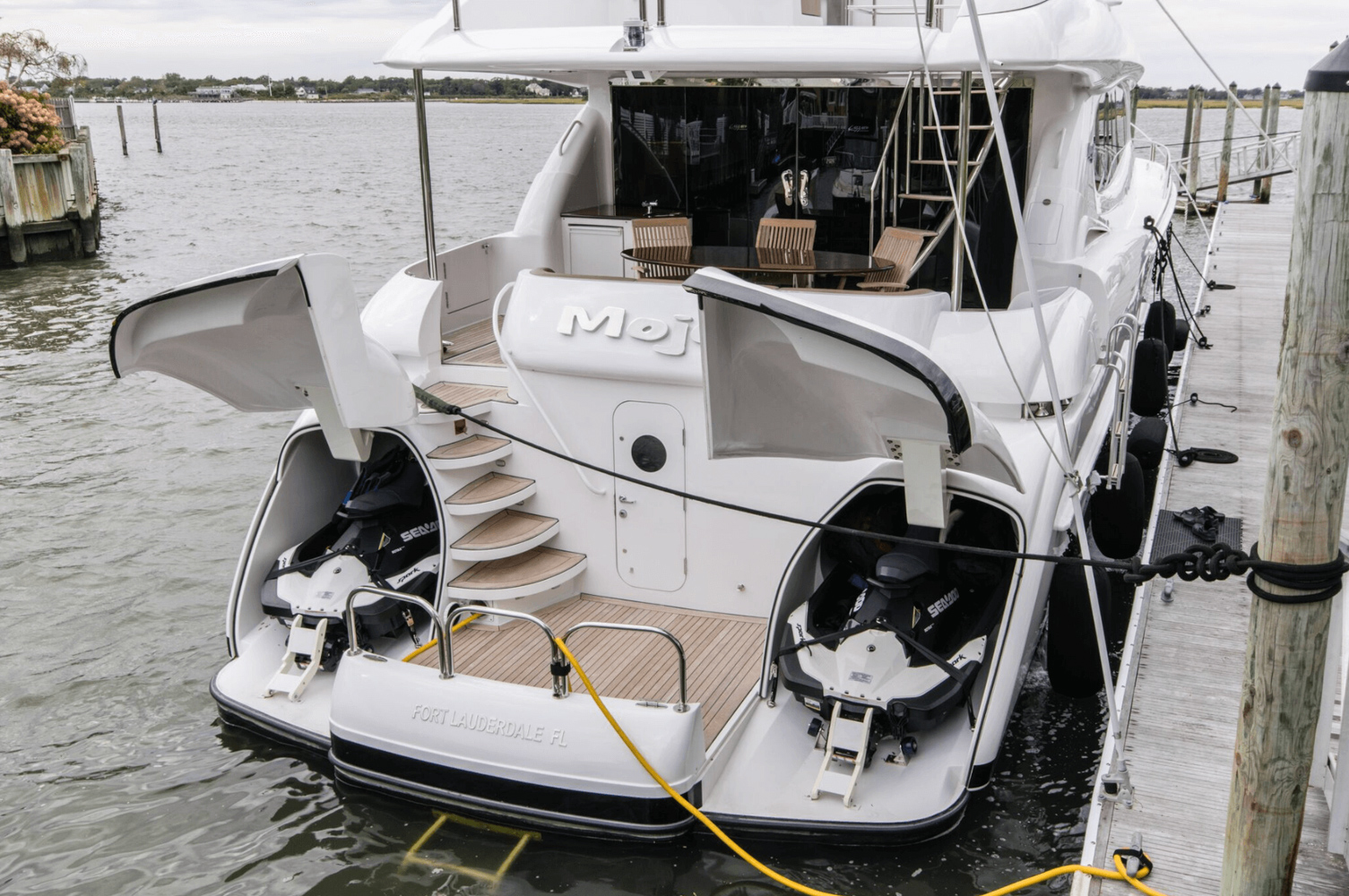 The main deck aft of MOJO features table, built in seating, and additional chairs for al fresco dining shaded by the flybridge overhang. A stairwell on the port side leads down to a swimming platform, which features hot/cold shower facilities for rinsing off after a dip in the ocean, plus easy access to the two convenient jet ski storage areas. There is also a door with access to the engine room.