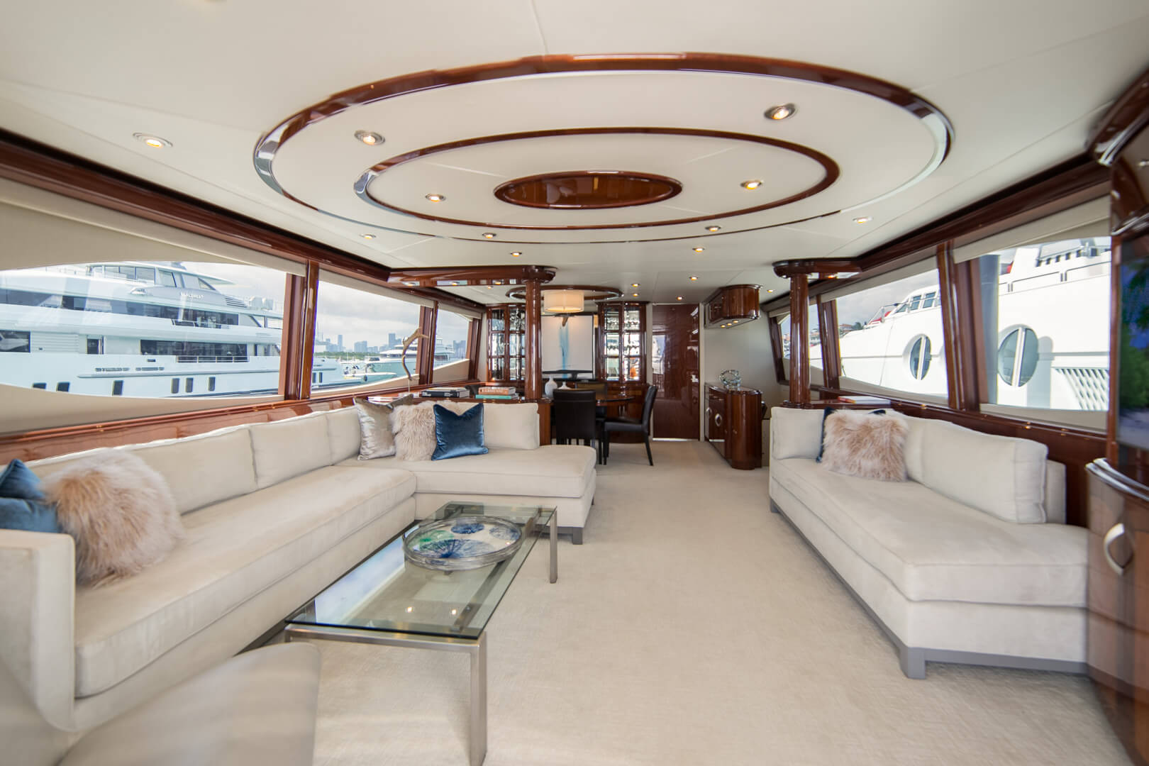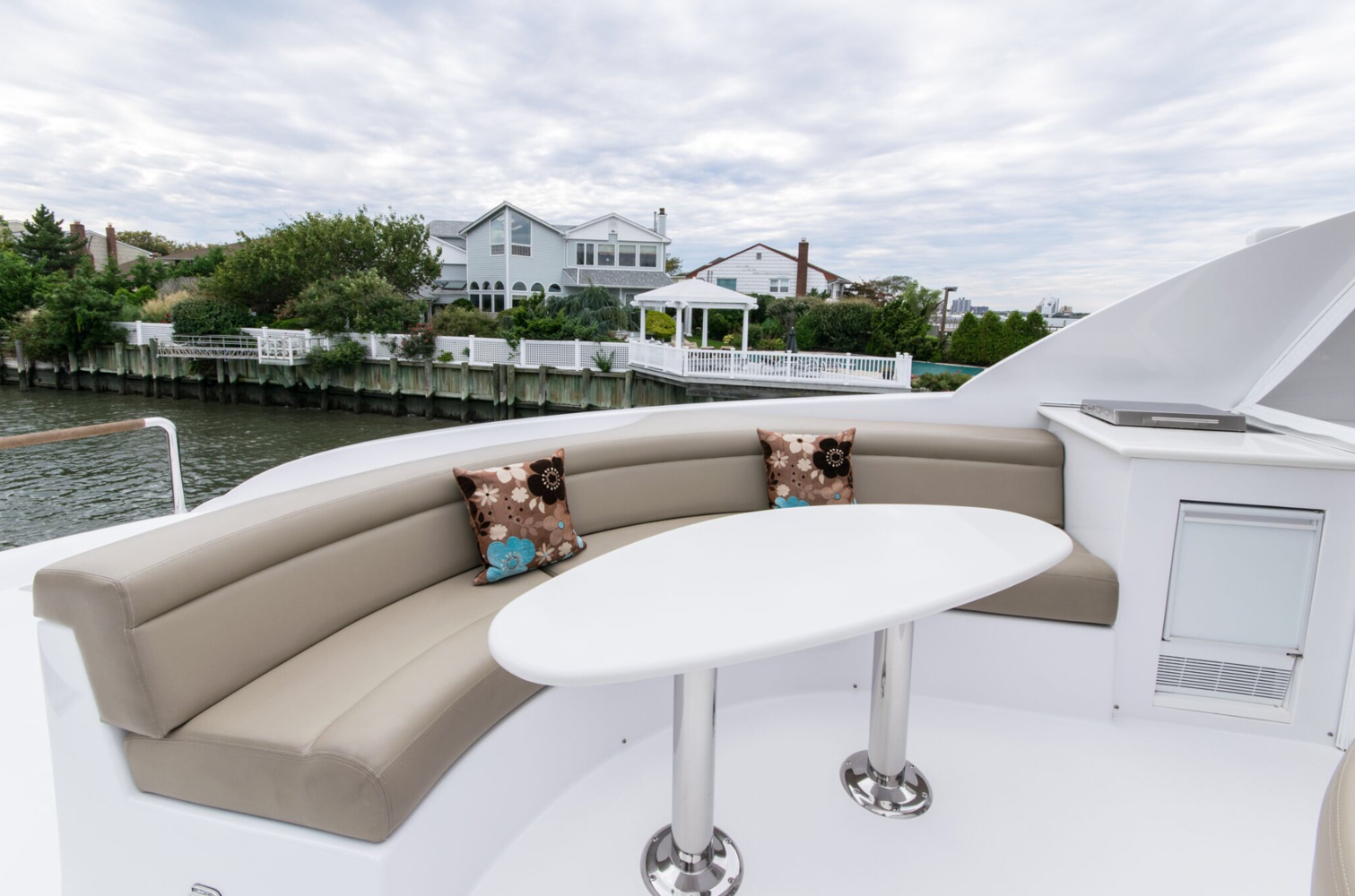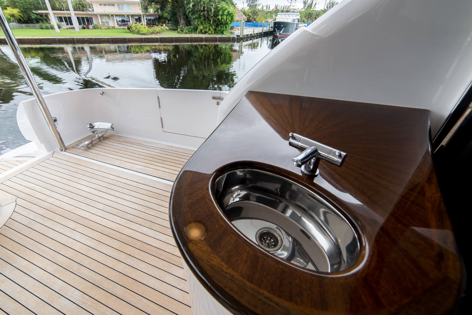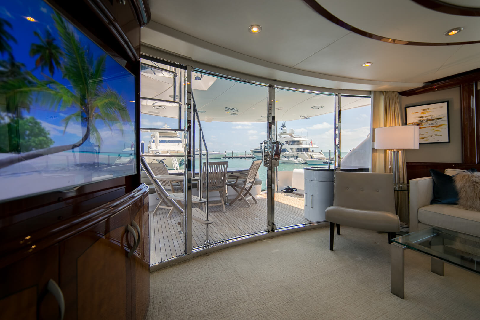 The main deck aft of MOJO features table, built in seating, and additional chairs for al fresco dining shaded by the flybridge overhang. A stairwell on the port side leads down to a swimming platform, which features hot/cold shower facilities for rinsing off after a dip in the ocean, plus easy access to the two convenient jet ski storage areas. There is also a door with access to the engine room.