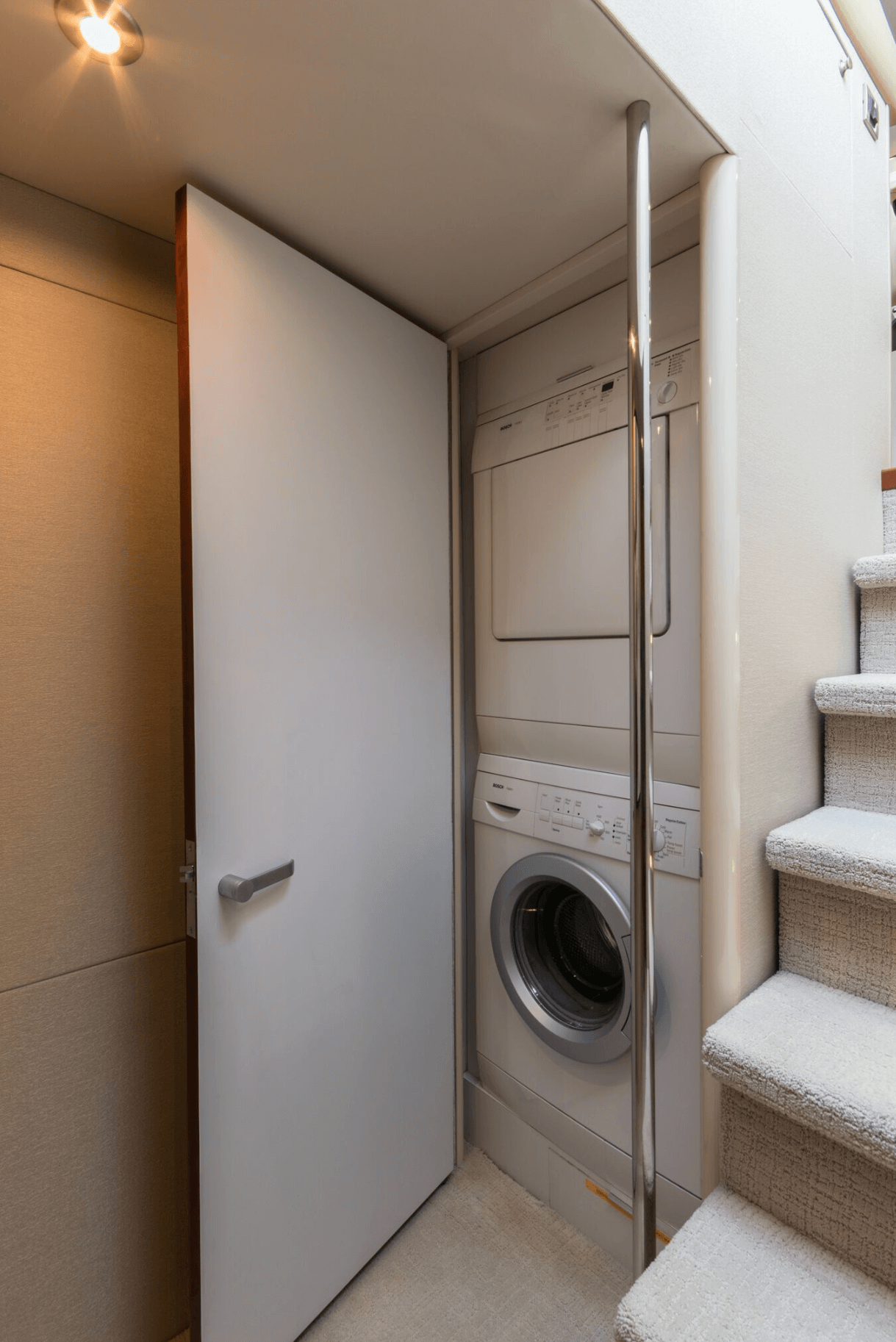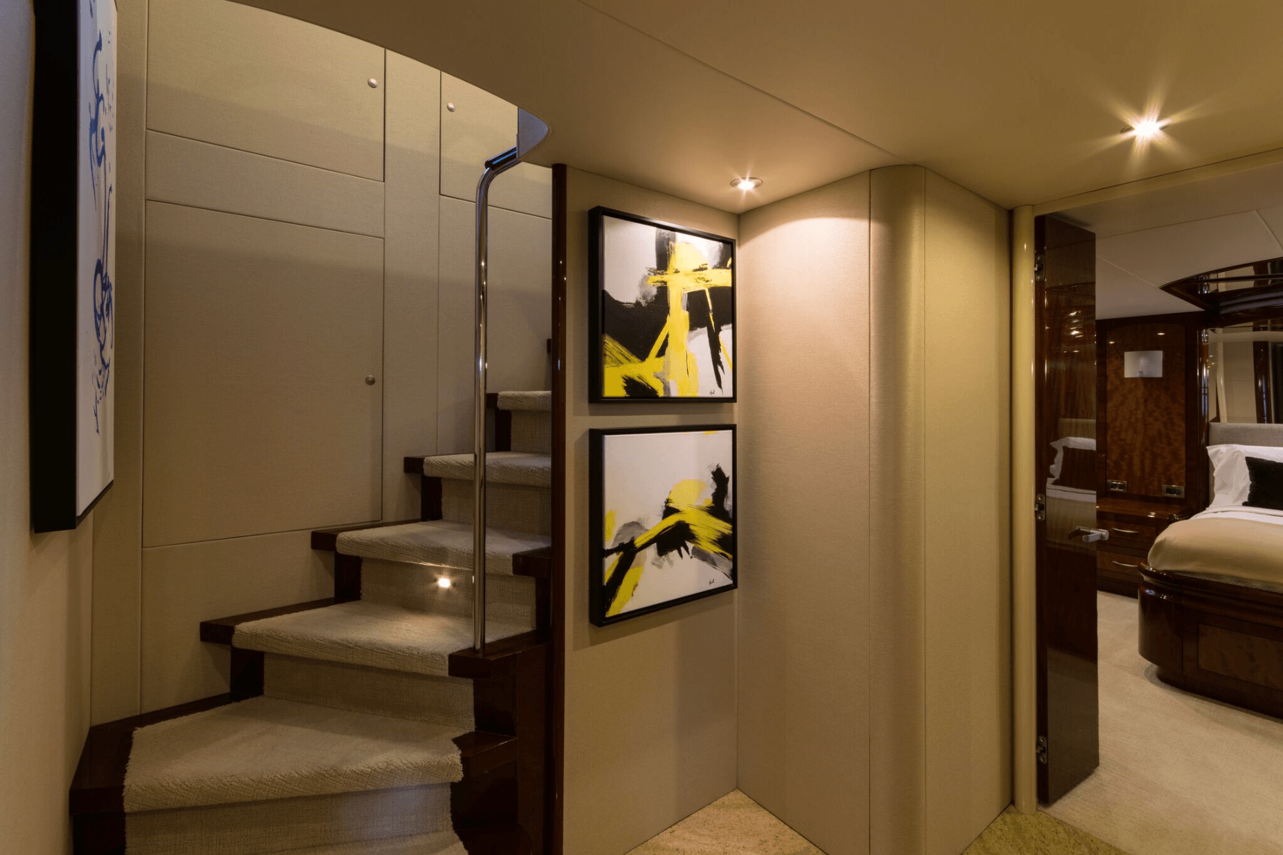 From the main deck, a unique stainless steel spiral staircase leads to the flybridge. This area is the perfect entertaining spot, with a variety of built in seating including booth seats and bar stools. The well-equipped bar comes complete with under-counter refrigeration, and a 40” TV and Sonos sound system will ensure everyone is entertained. Opposite the bar on the starboard side is a hot tub with sun pad coverings. To the aft on the sundeck, there is an additional seating area, electric grill, and storage for a tender.