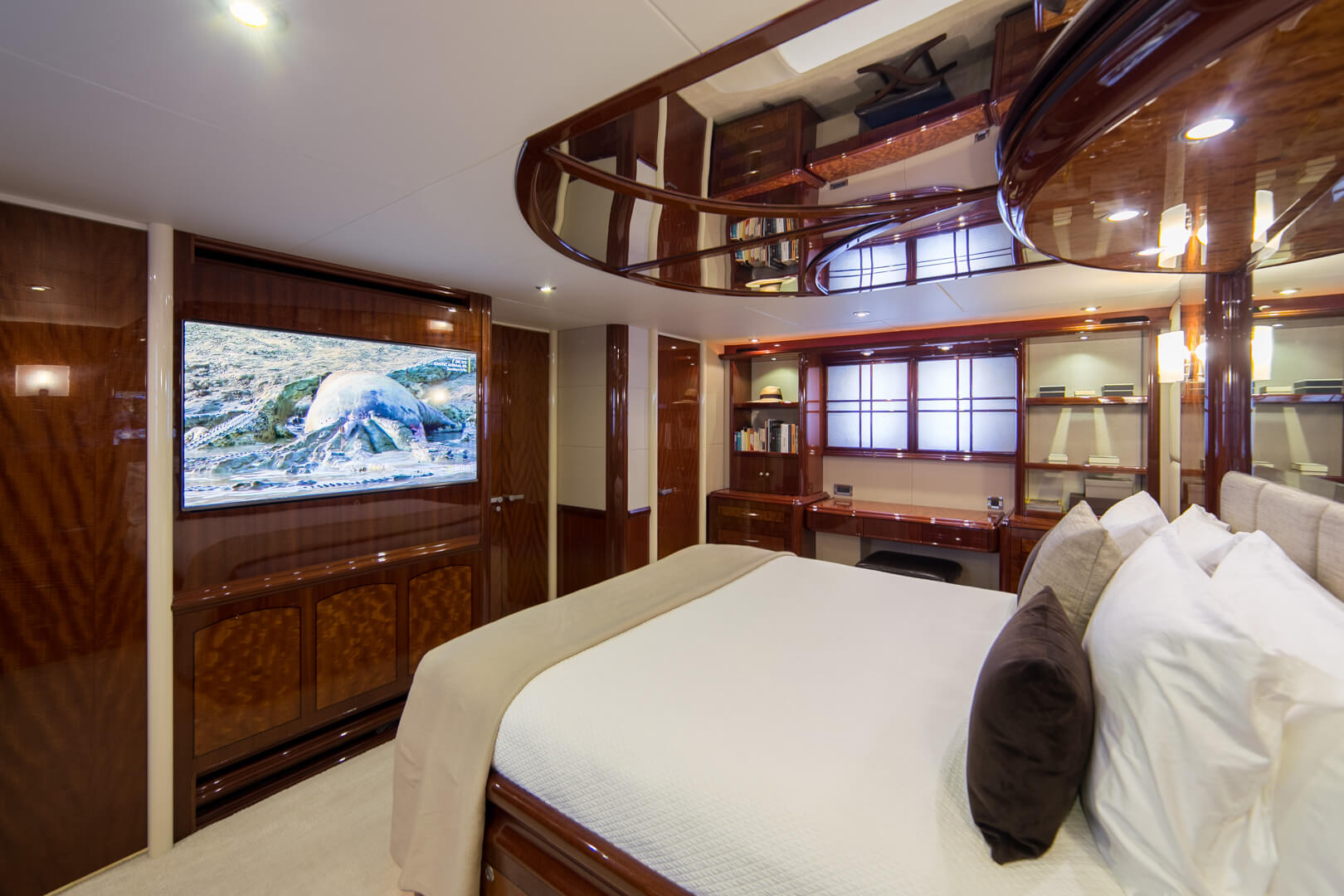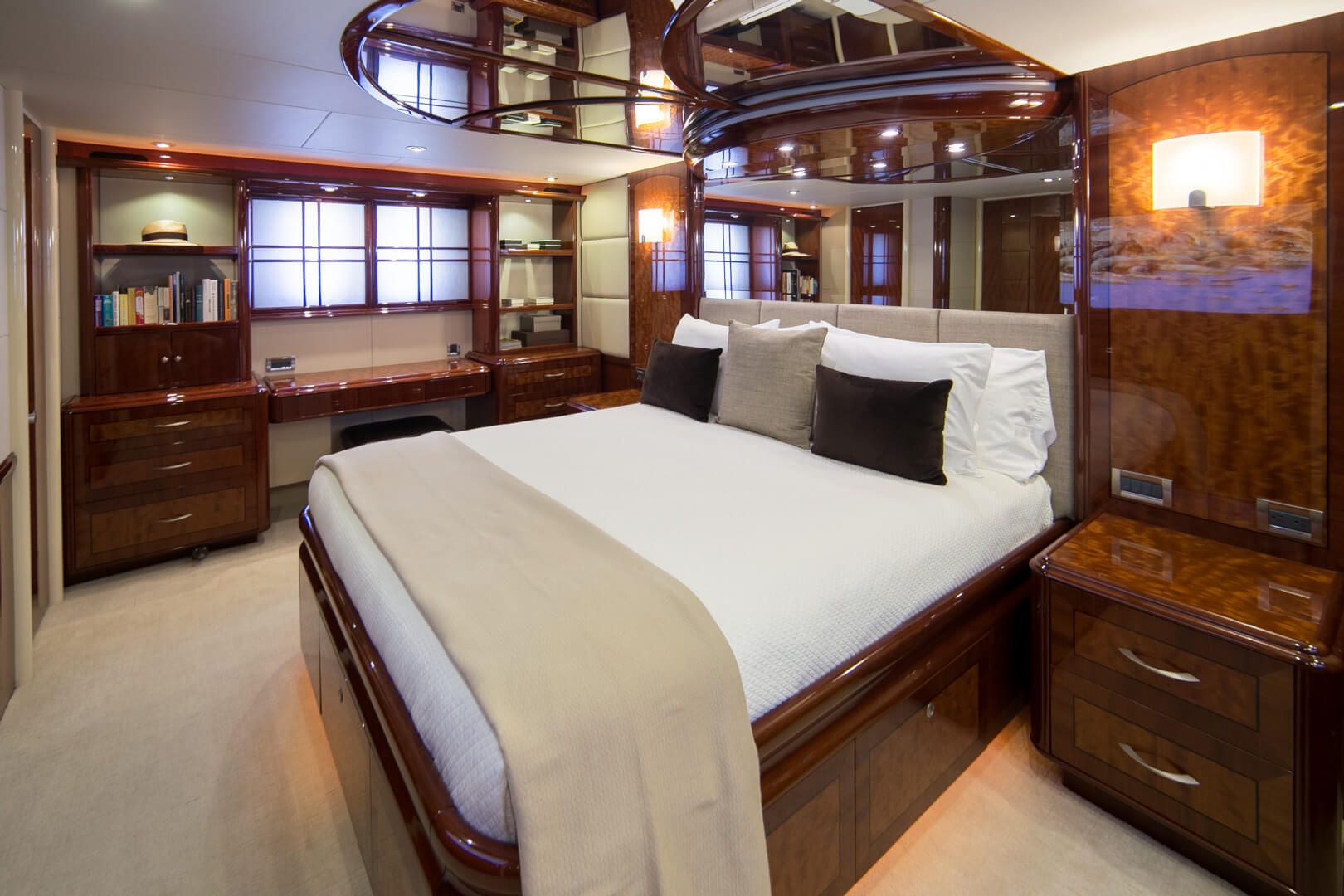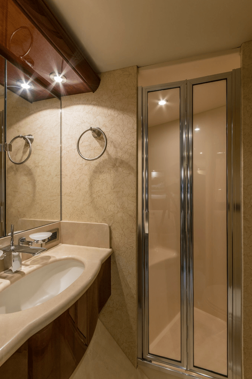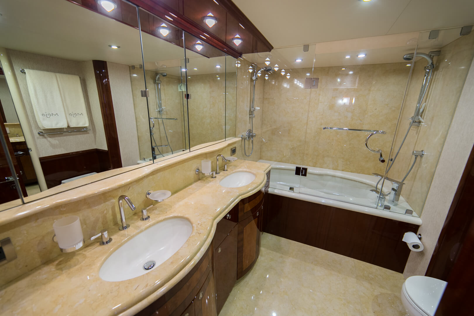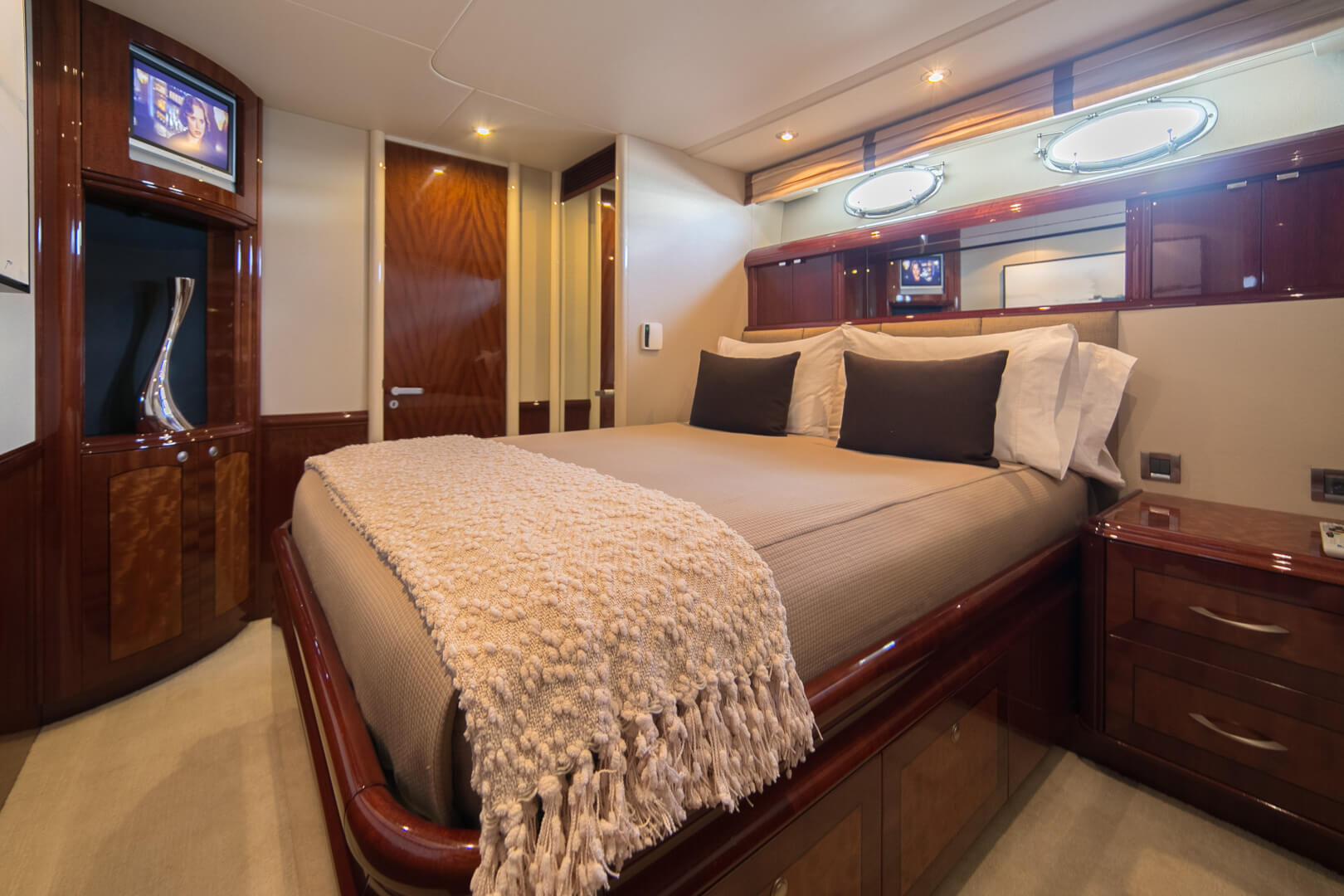 The accommodation on the lower deck is accessed via the amidships stairwell from the main salon, an consists of 3 cabins: 1 Master cabin and 2 matching VIP cabins. Aft is the luxurious full beam Master cabin, which features king-size bed, large walk-in wardrobes, desk/vanity area, couch and 55” Samsung Smart TV. The Master ensuite includes a full sized jacuzzi, dual shower heads, his and hers sinks and toilet. The two VIP cabins both feature queen sized beds, ensuite bathrooms with showers, plus plenty of storage space. The expert crew of 3 will ensure that guests have five star service throughout their time on board.