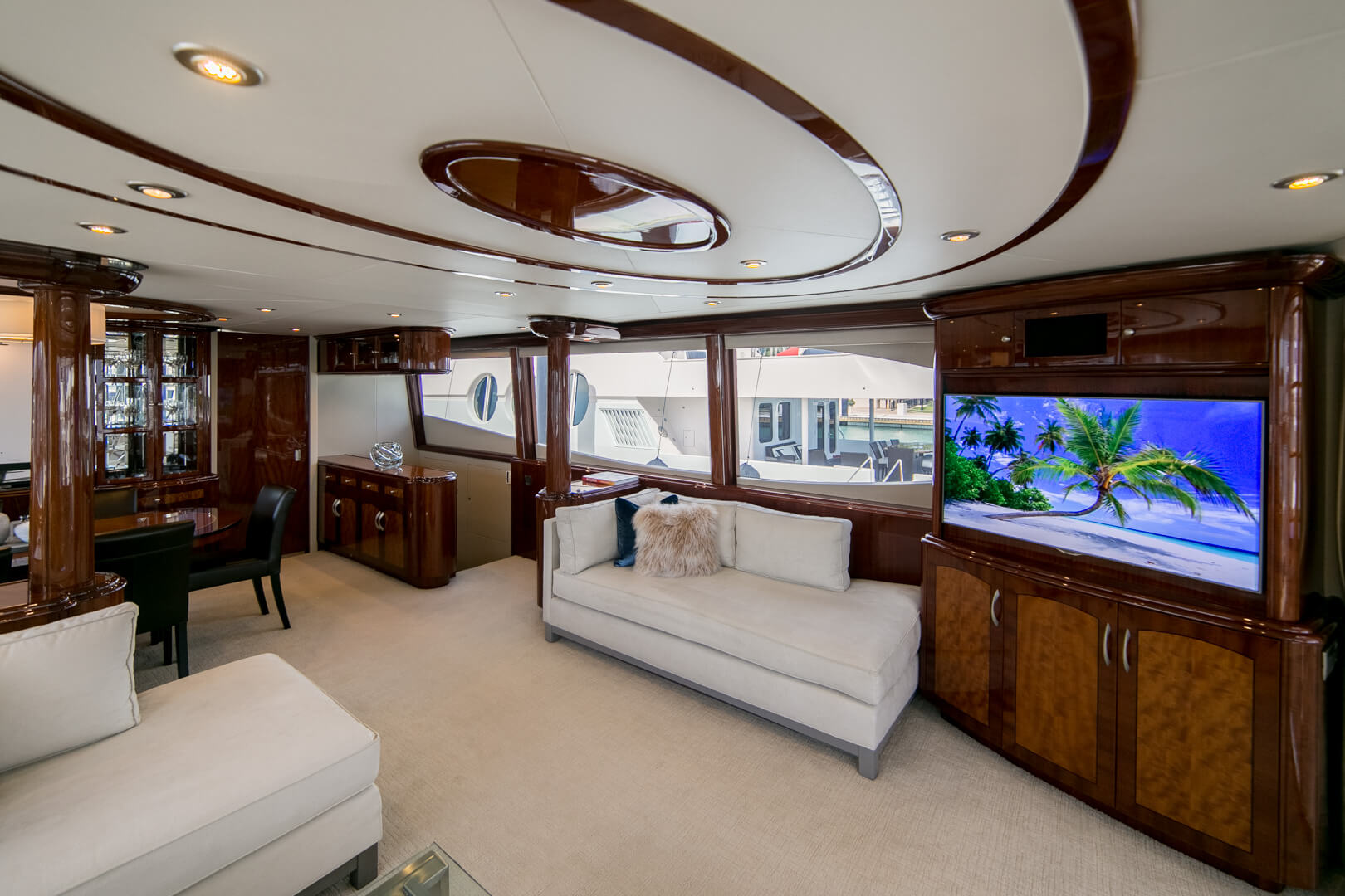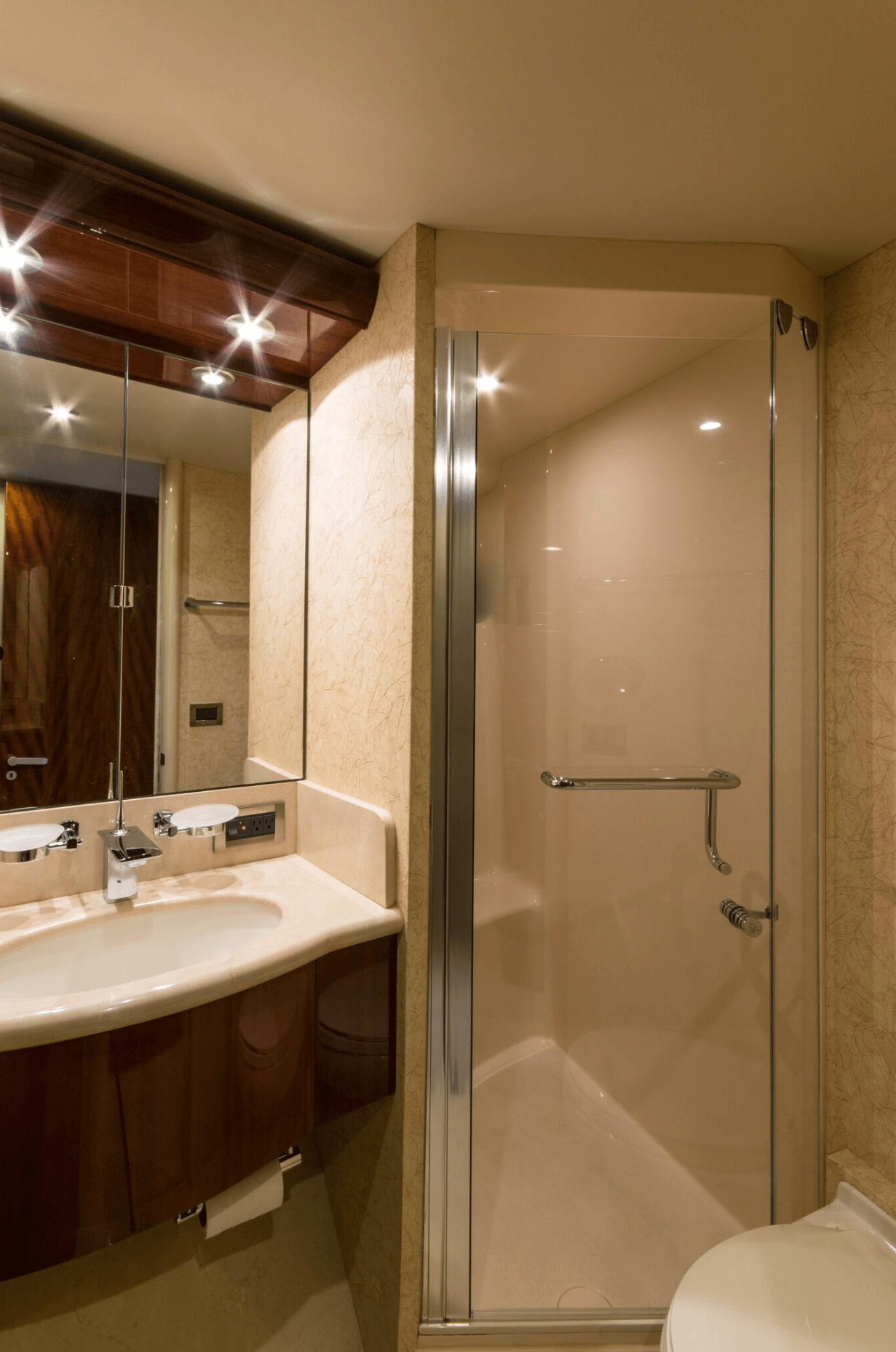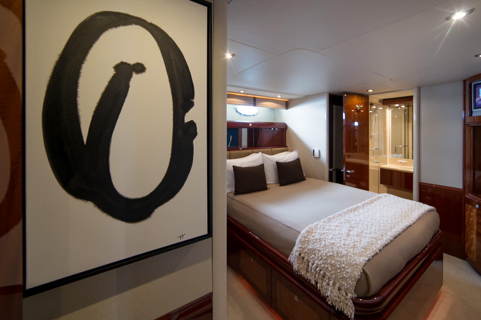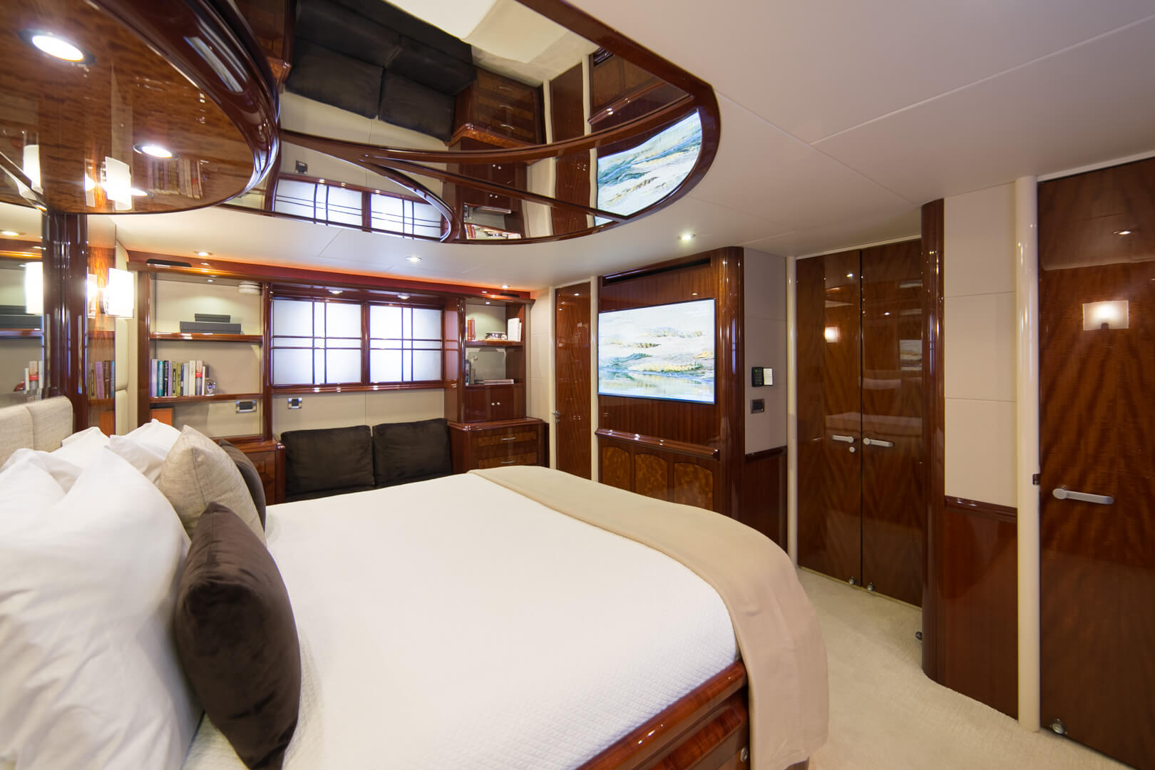 The accommodation on the lower deck is accessed via the amidships stairwell from the main salon, an consists of 3 cabins: 1 Master cabin and 2 matching VIP cabins. Aft is the luxurious full beam Master cabin, which features king-size bed, large walk-in wardrobes, desk/vanity area, couch and 55” Samsung Smart TV. The Master ensuite includes a full sized jacuzzi, dual shower heads, his and hers sinks and toilet. The two VIP cabins both feature queen sized beds, ensuite bathrooms with showers, plus plenty of storage space. The expert crew of 3 will ensure that guests have five star service throughout their time on board.