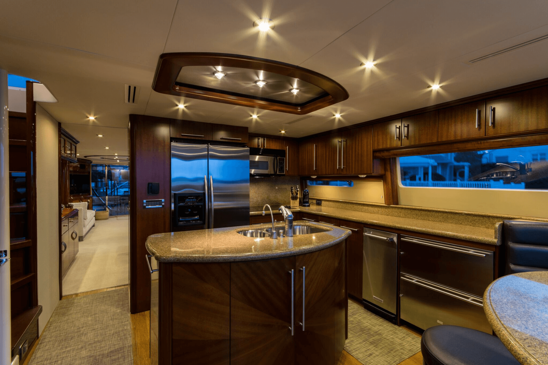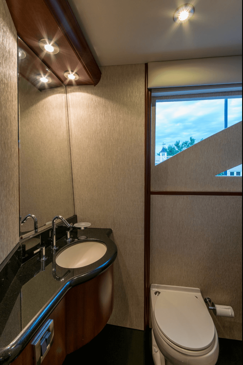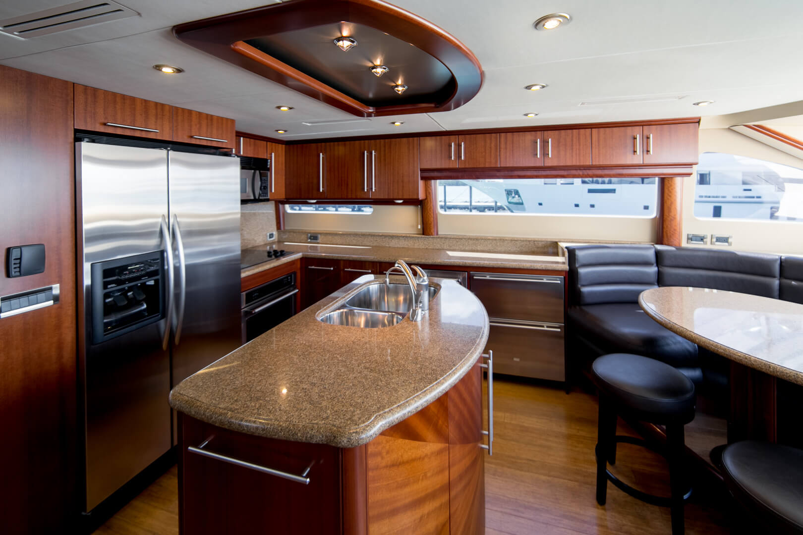 Forward of the dining area is a convenient dayhead, plus country kitchen-style galley. The galley features granite countertops including a granite island with sink. There is also an additional seating area underneath the large bow windows, making it the perfect spot for a cup of coffee while enjoying the beautiful views.
