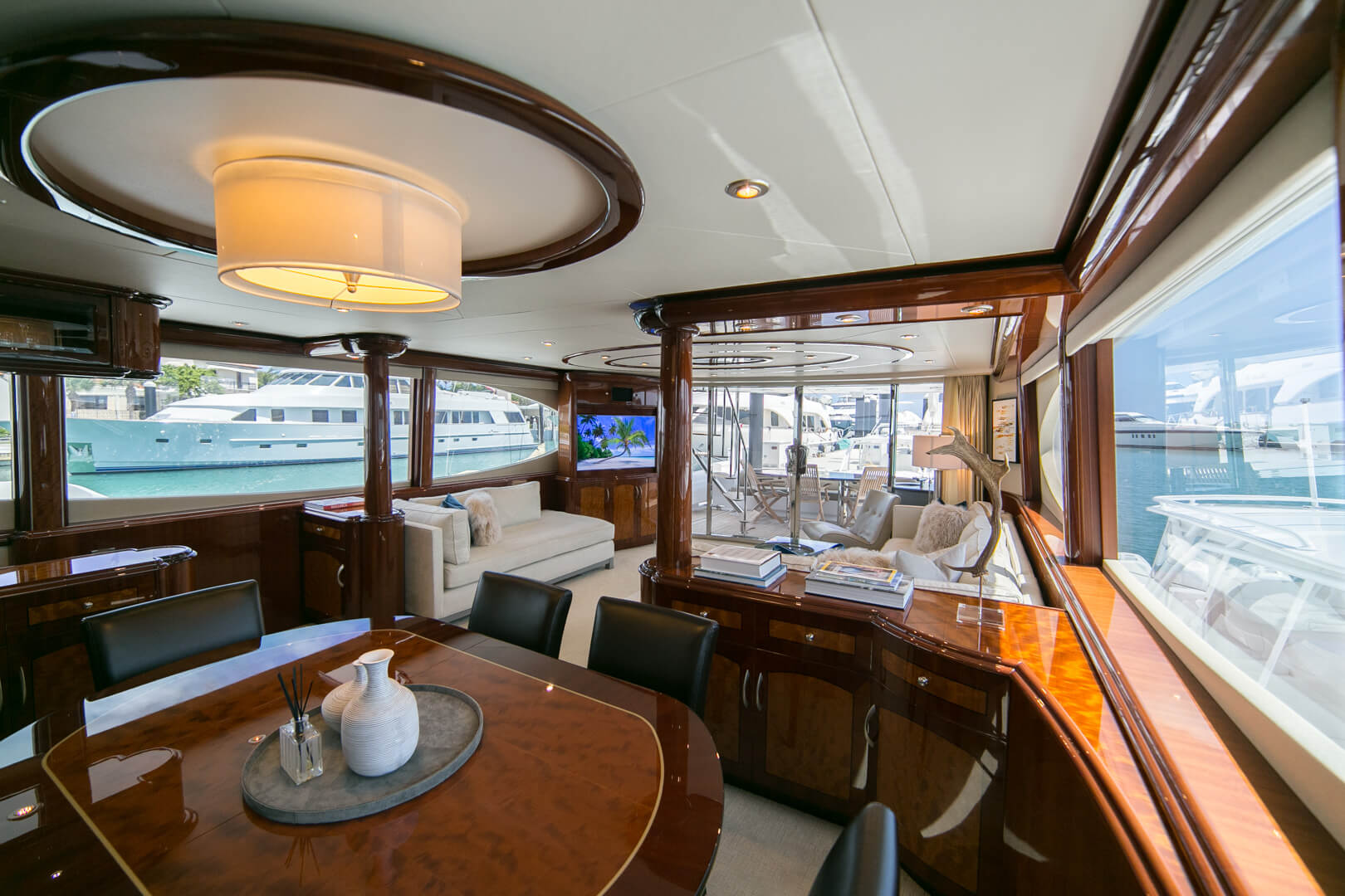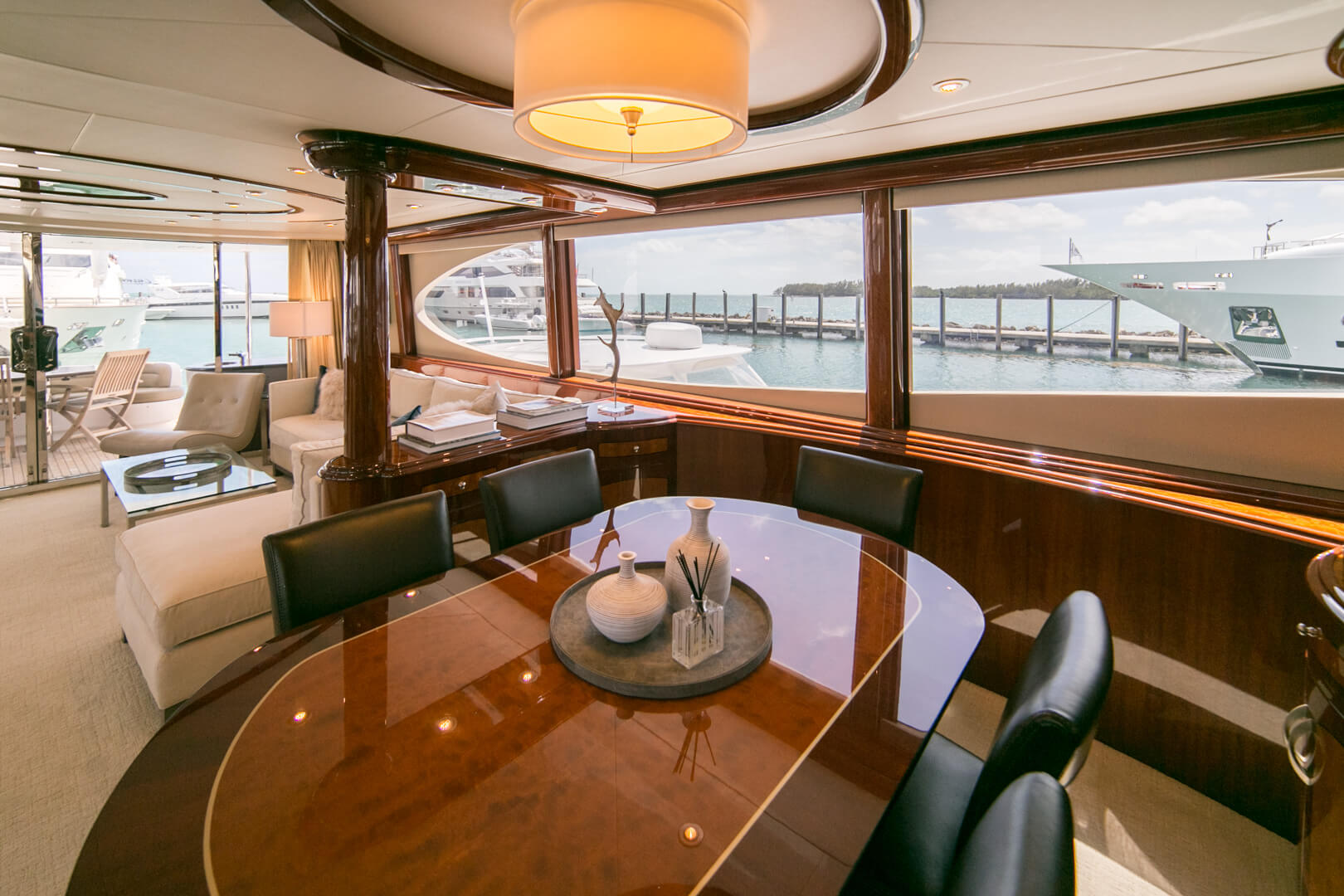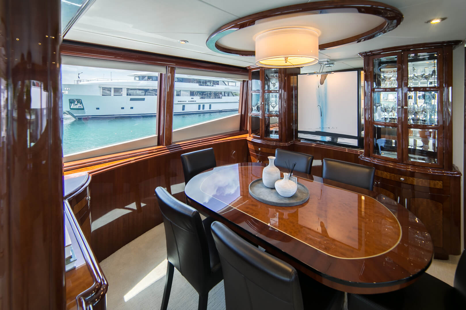 Forward of the living area is the formal dining area, which is partially separated from the living area by a built in buffet and columns. The gorgeous high-gloss table seats 6, and is surrounded by built in cabinetry to house glass and dining ware. There is a stairwell leading to the lower deck which is separated by another buffet cabinet.