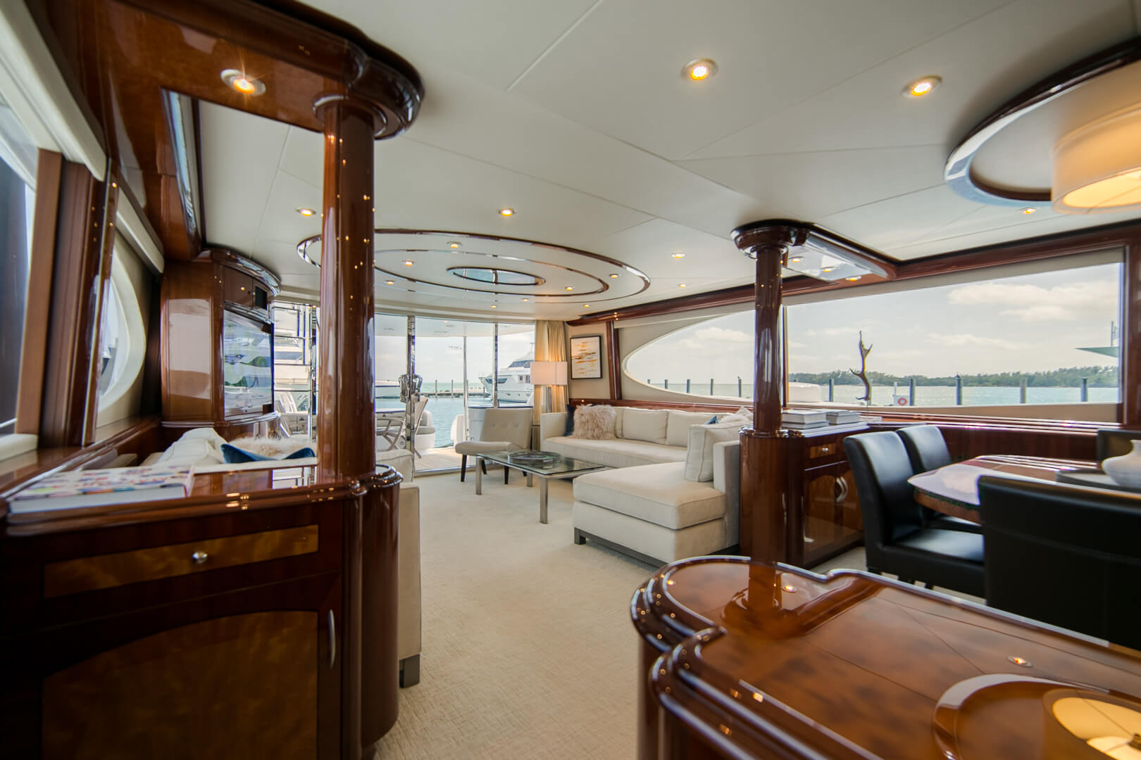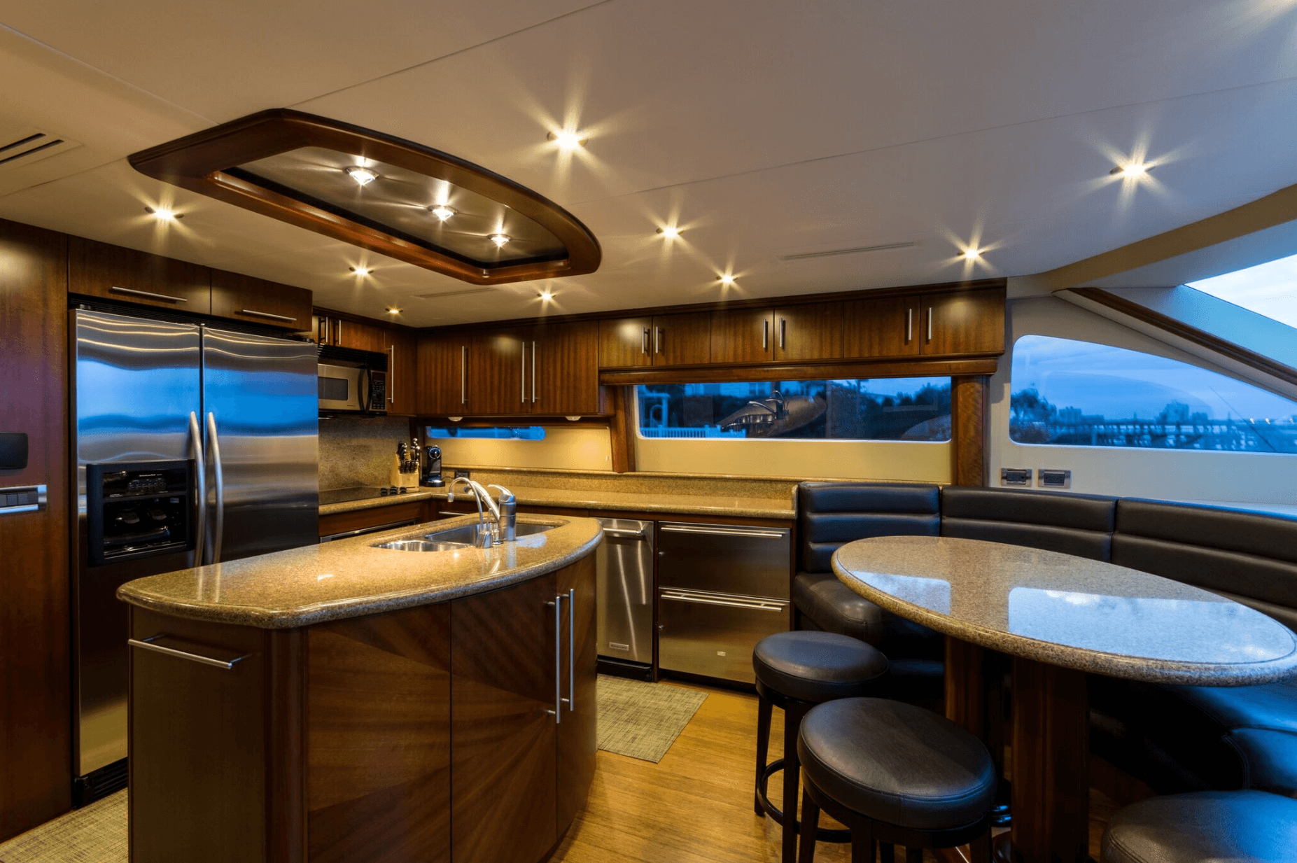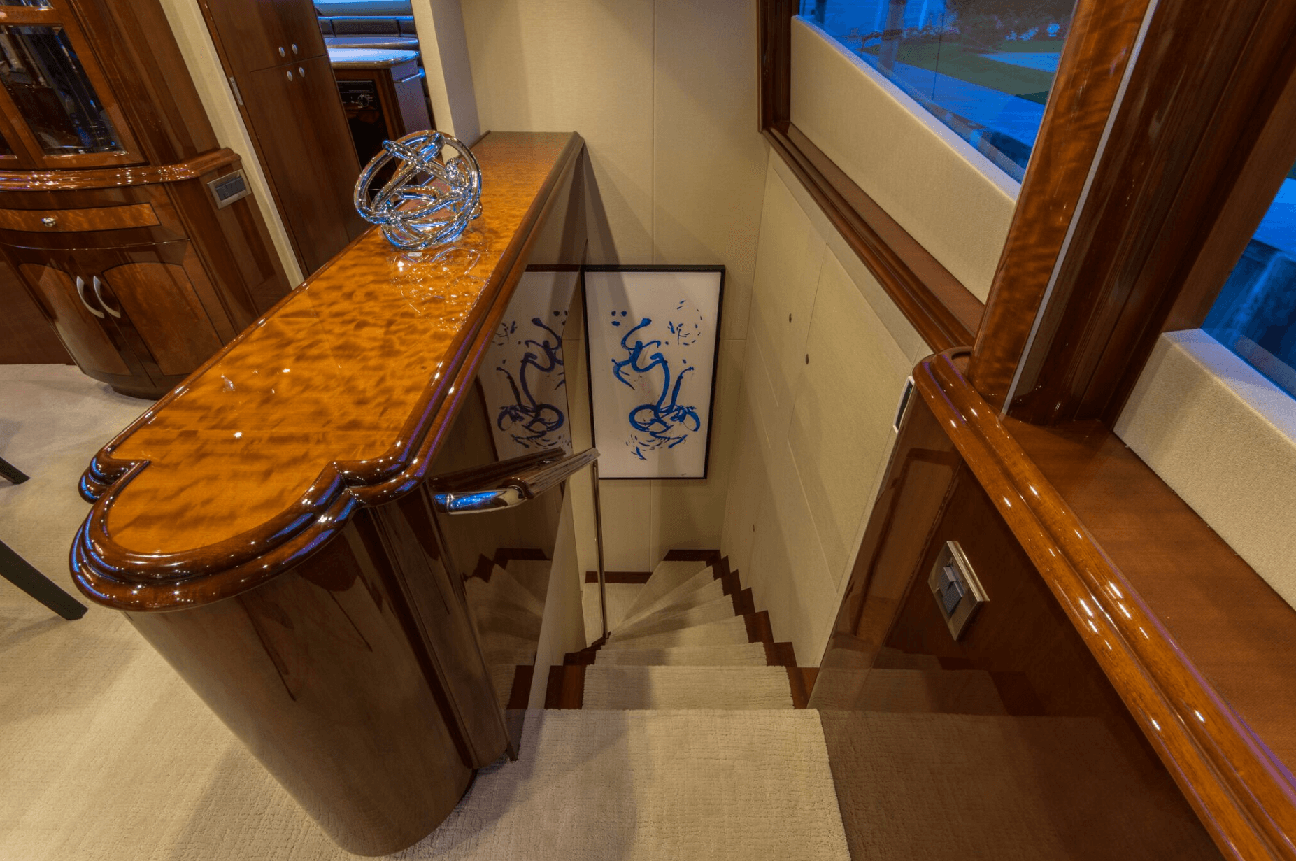 Forward of the living area is the formal dining area, which is partially separated from the living area by a built in buffet and columns. The gorgeous high-gloss table seats 6, and is surrounded by built in cabinetry to house glass and dining ware. There is a stairwell leading to the lower deck which is separated by another buffet cabinet.