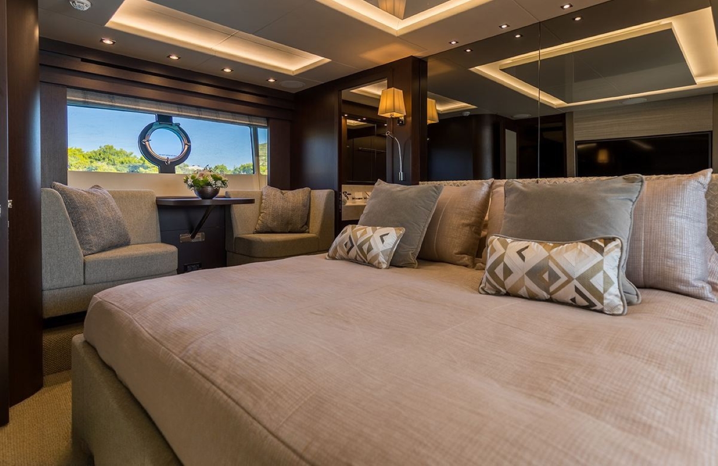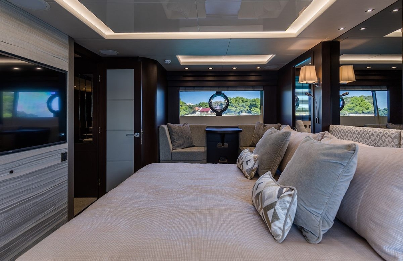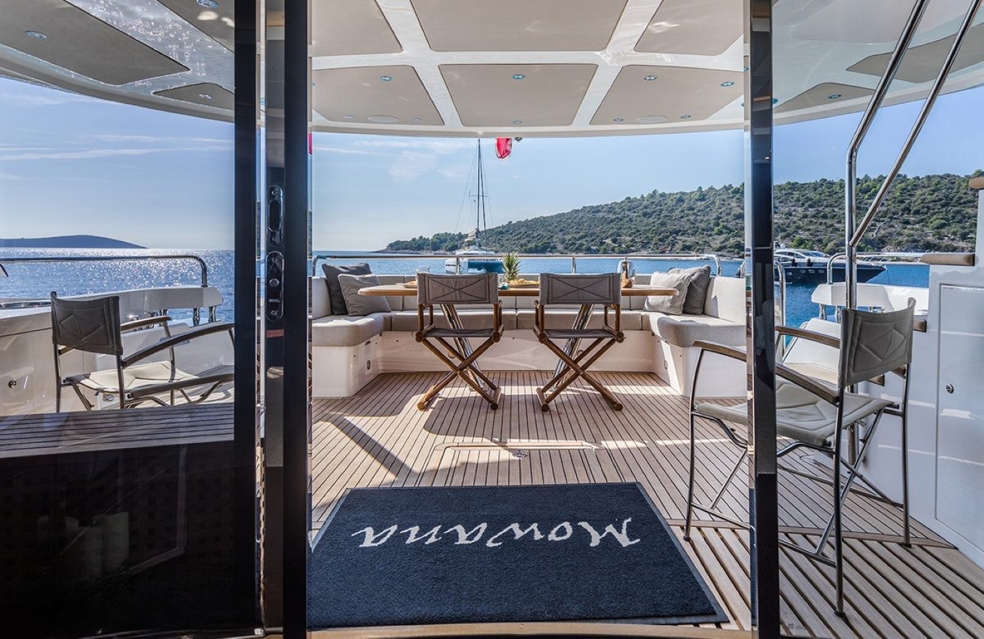 The main deck interior area features the wheelhouse forward with seating and a table, as well as the galley. The saloon features two large sofas with coffee tables as well as an elegant dining area for eight. Moving outside, the aft deck has an inbuilt seating area around a large table, offering a fabulous dining option alfresco. From here stairs lead down to the spacious swim platform, used for easy access to the water and for the enjoyment of the great selection of water toys. Forward on the main deck, there is a large sun pad as well as an additional seating area with a smaller table.