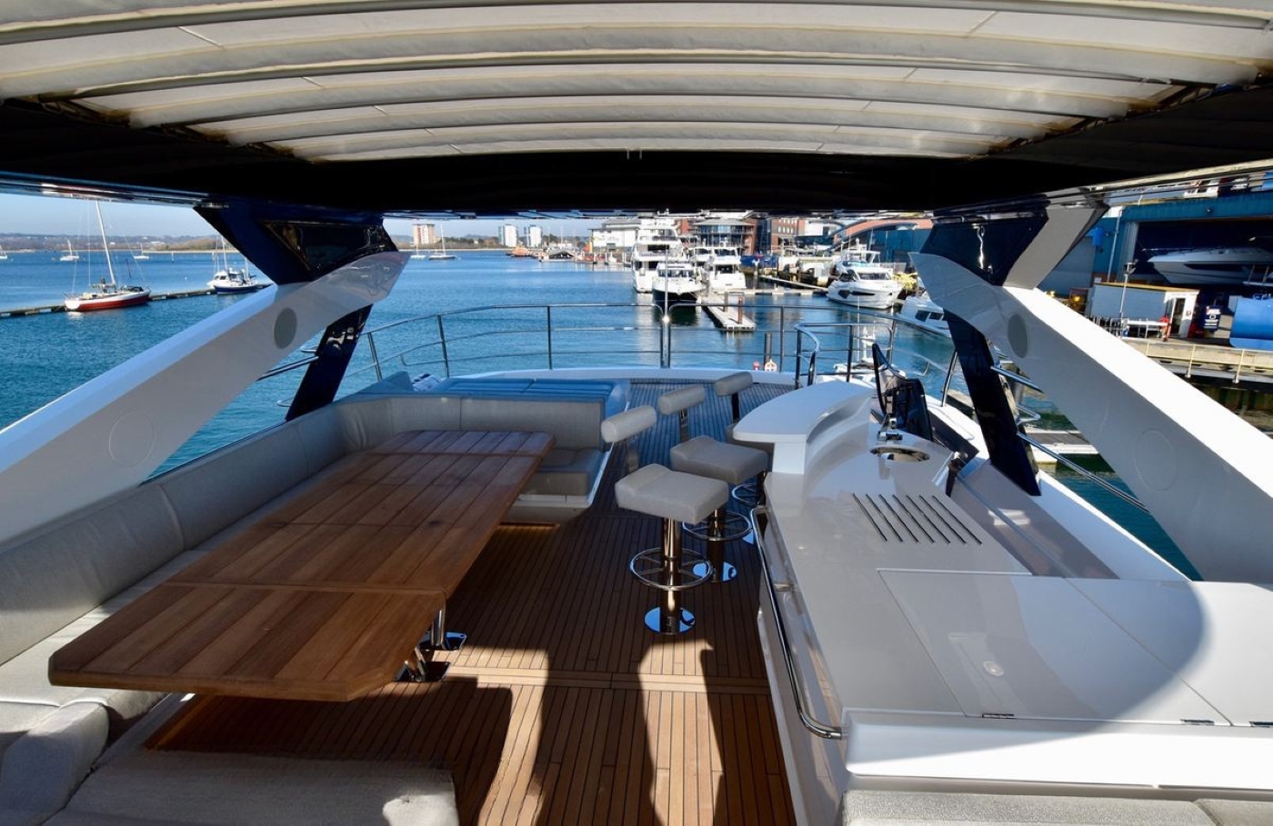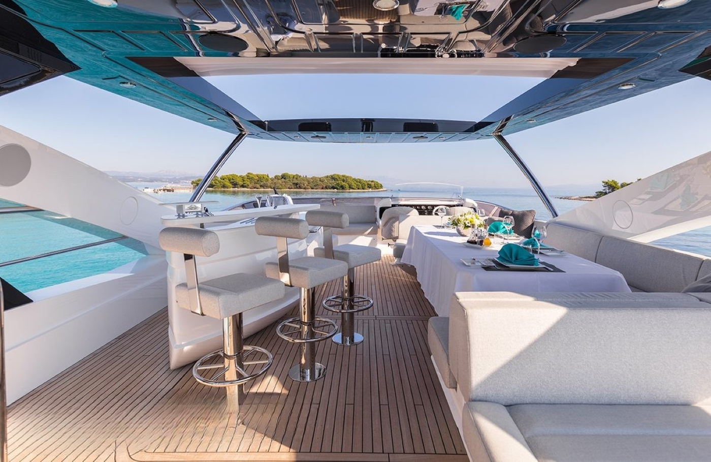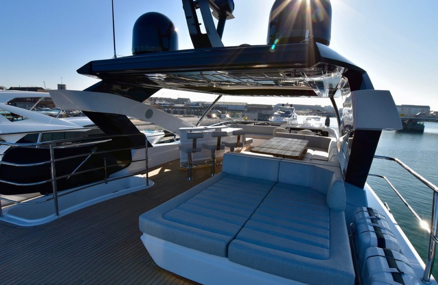 Moving up onto the flybridge, there is yet another dining option around a large table and in-built seating, a bar with stools and a relaxation area/sun pad.