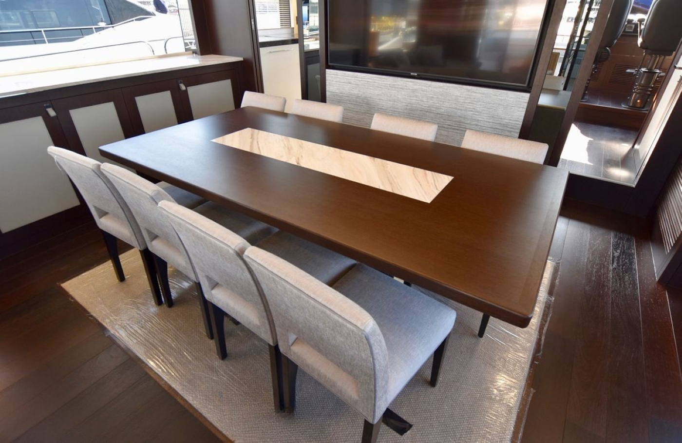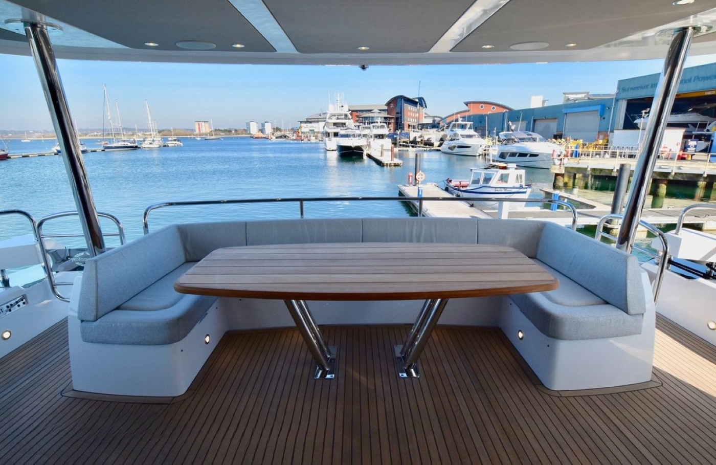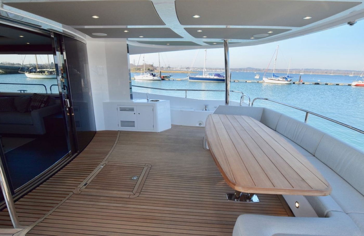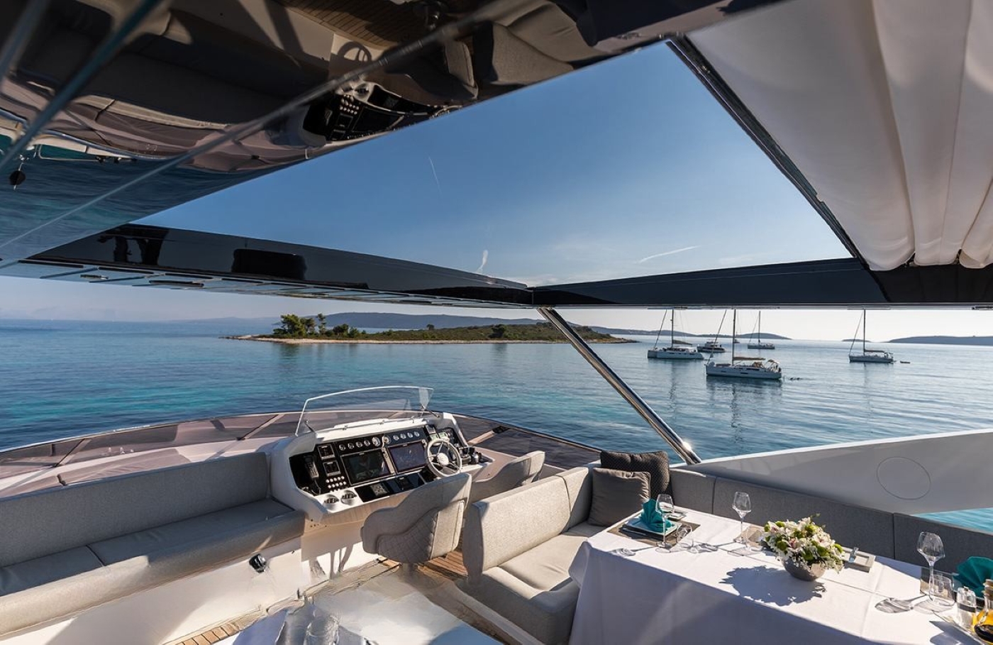 Moving up onto the flybridge, there is yet another dining option around a large table and in-built seating, a bar with stools and a relaxation area/sun pad.