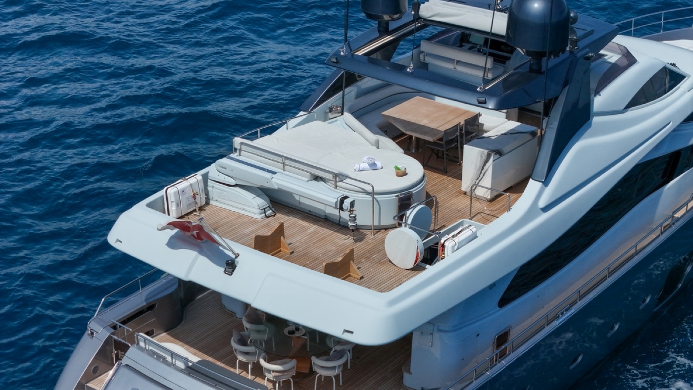 Exterior space aboard the Ferretti yacht MY MAXI BEER is laid over 2 levels and features 4 great areas to entertain, relax or enjoy the amenities. The salon leads directly to the shaded aft deck and an alfresco dining table, with ample seating. Further aft is an extended full beam swim platform, for effortless water access. From the aft deck, the port and starboard side decks lead forward to a raised, built in sunpad on the foredeck. Her upper sundeck is accessed from the aft deck or bridge deck, this area boasts an additional more casual alfresco dining table, sunpads, deluxe jacuzzi and partial shade.