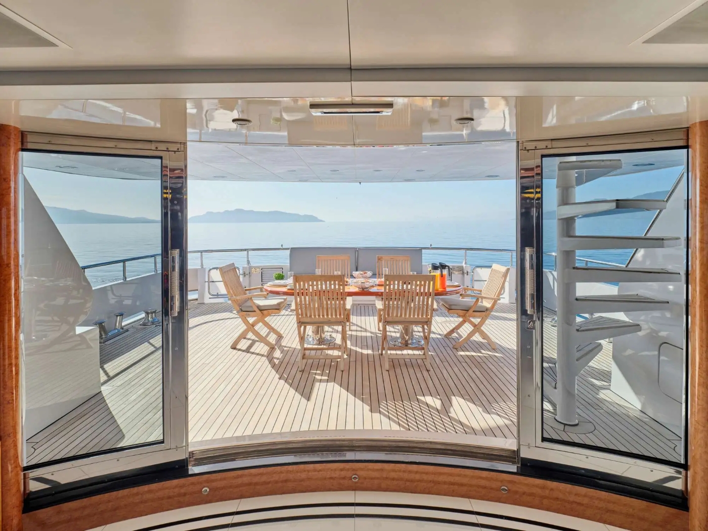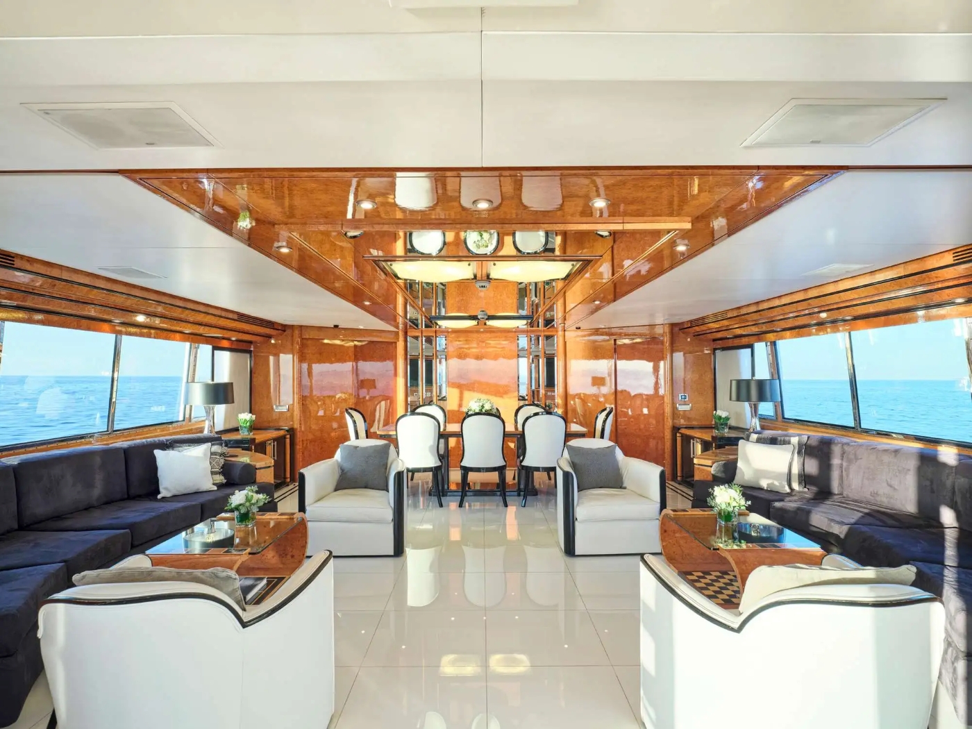 The luxury motor yacht MILOS AT SEA boasts a large open plan salon and formal dining area that spans the full width of the yacht. The lounge area features 2 leather sofas and 4 armchairs with matching coffee tables and there is a large screen TV with DVD, CD, Satellite TV. The lovely dining table can seat up to 10 charter guests for formal dining. There are mirrored panels behind dining table and overhead mirrored ceiling with Murano glass lighting features. To the aft, there are double electrical glass sliding doors leading to the aft deck.