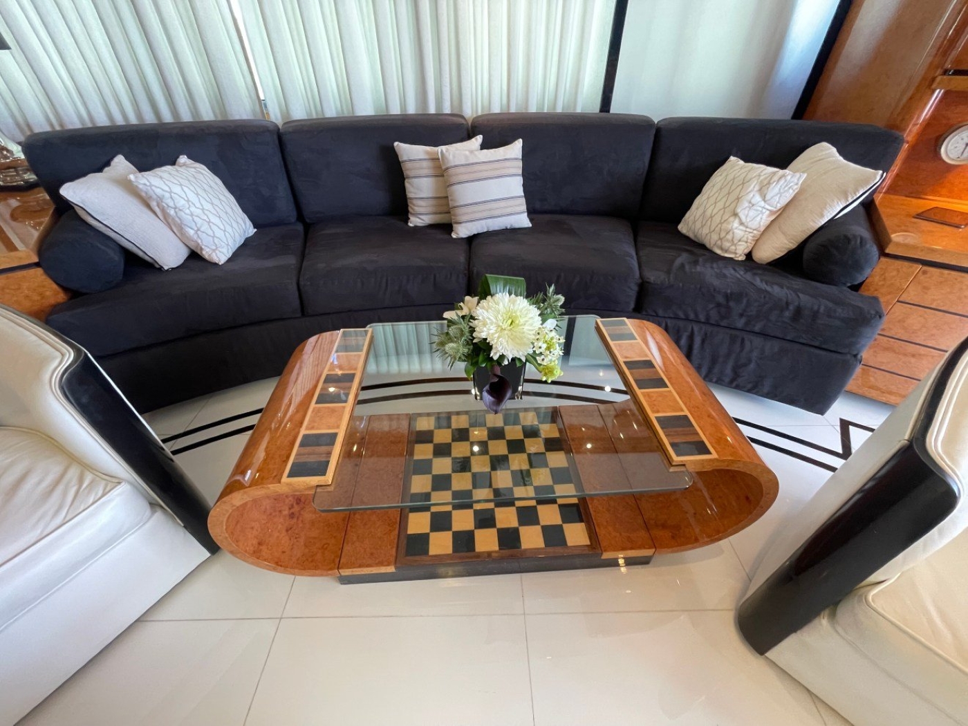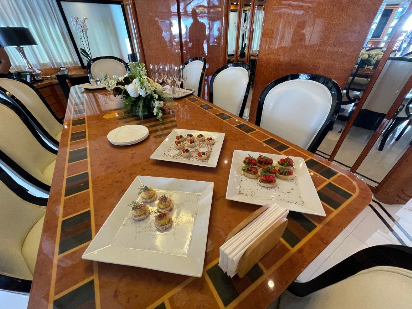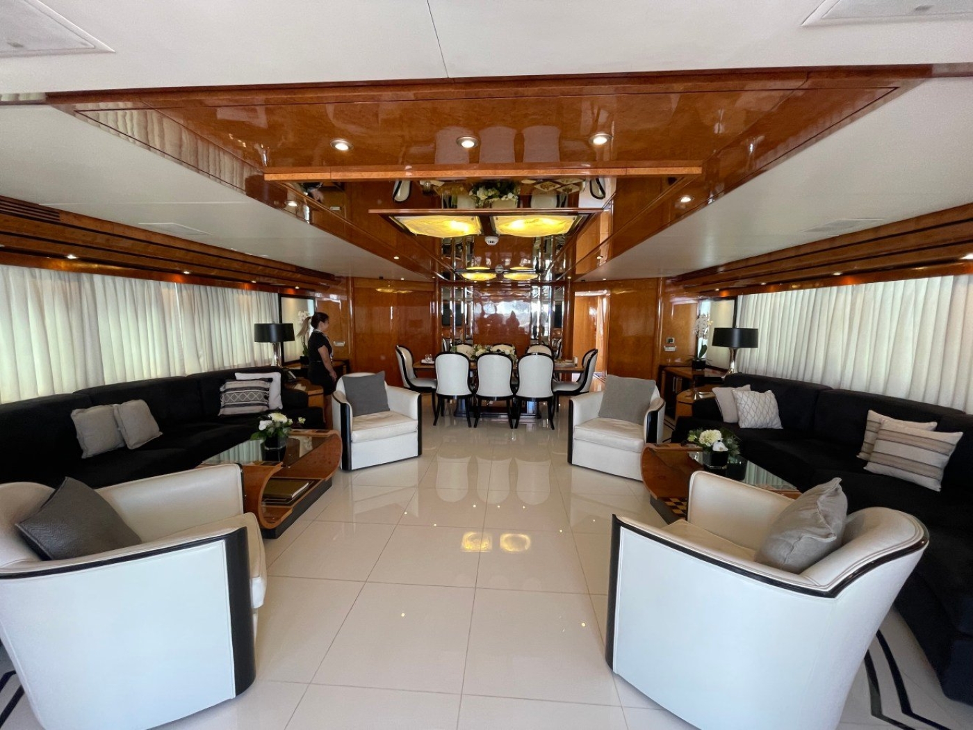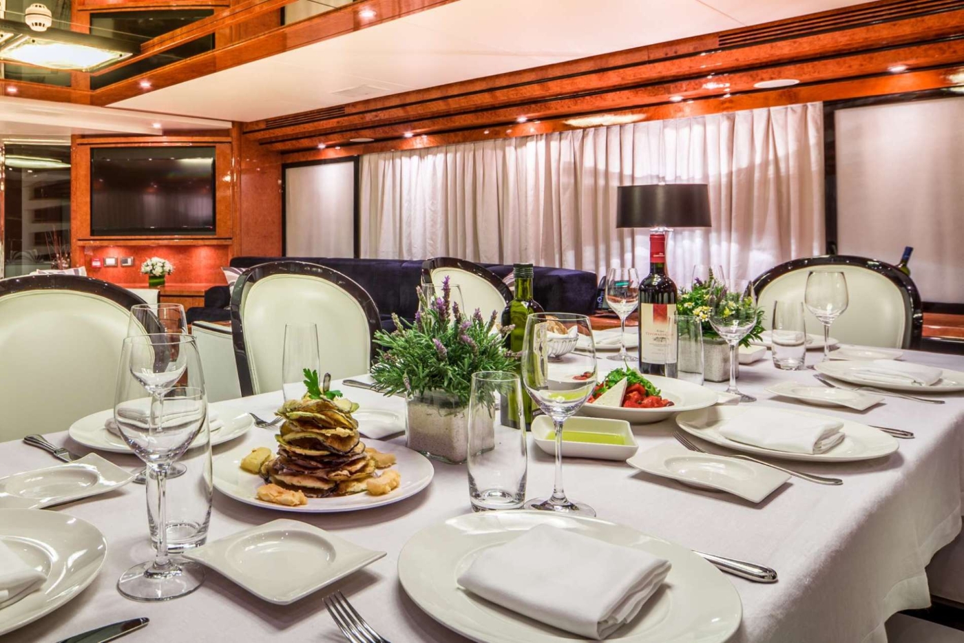 NOTABLE FEATURES for MILOS AT SEA: Spacious salon with an open plan formal dining table ~ On deck master stateroom ~ Elegant decor throughout ~ Plenty of exterior living ideal for entertaining ~ Underway stabilizers for added comfort ~ WiFi