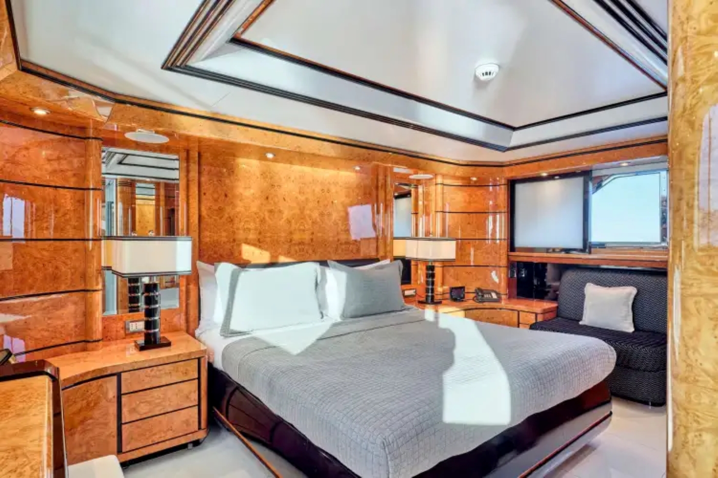 Yacht MILOS AT SEA is able to accommodate 10 charter guests in 4 cabins including the master cabin that boasts two separate his and her bathrooms, both with showers. The wardrobe entrance features two full closets and may be closed off from the main stateroom. The cabin also features a vanity and 40" flat screen TV with BlueRay, CD and satellite. The remaining 3 cabins are located on the lower deck and include a VIP located aft with sofa, en-suite bathroom with shower and a double sink as well as plenty of hanging closet space. There is a 32" flat screen TV, BlueRay and CD. The starboard Twin cabin has an en-suite bathroom which also can be accessed from the guest foyer as a day head. There is a small desk, hanging closets and TV with DVD, CD and satellite. The port Twin also has an en-suite bathroom with shower and slightly more floor space between the desk and sleeping area. Both have plenty of hanging storage and full AV. Both of the twin staterooms each have one Pullman bunk.